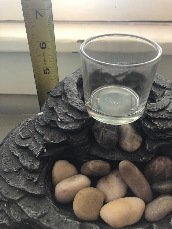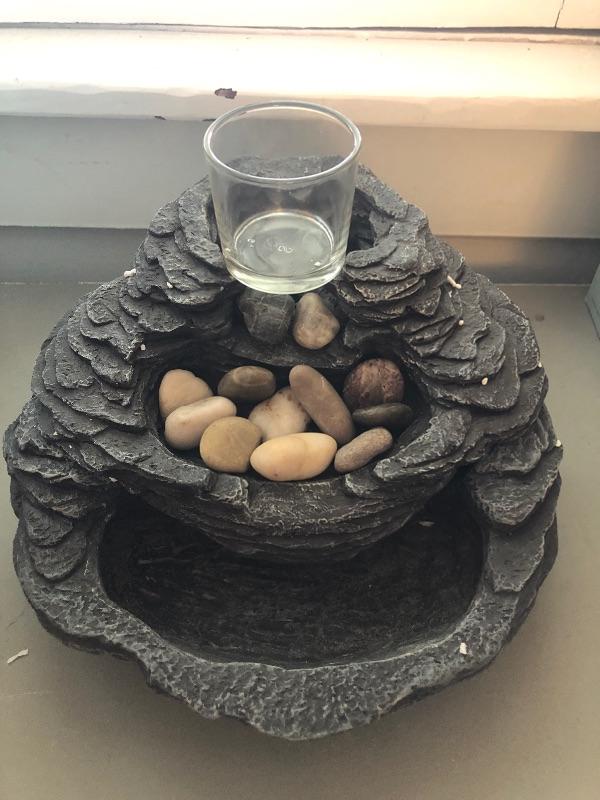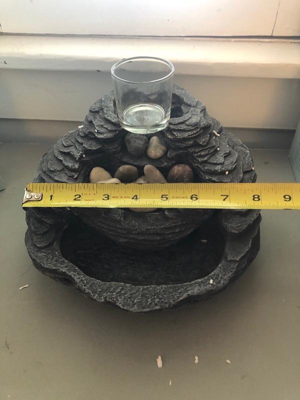 This is a used product because I can tell the small pump has been used - but it works and is still clean - comes with rocks for the relaxing sound of being close to water ! Comes with glass votive candle holder that fits at top as shown - comes in original box