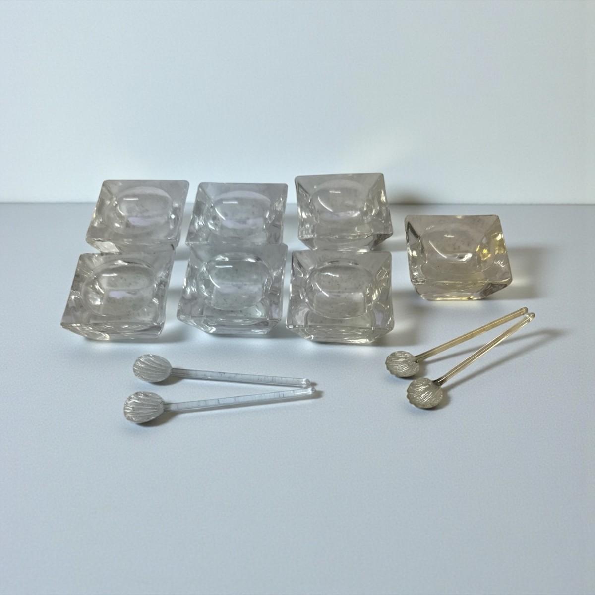 Partial Set of 7 Glass Salt Place Bowls w 4 Glass Shell Spoons
