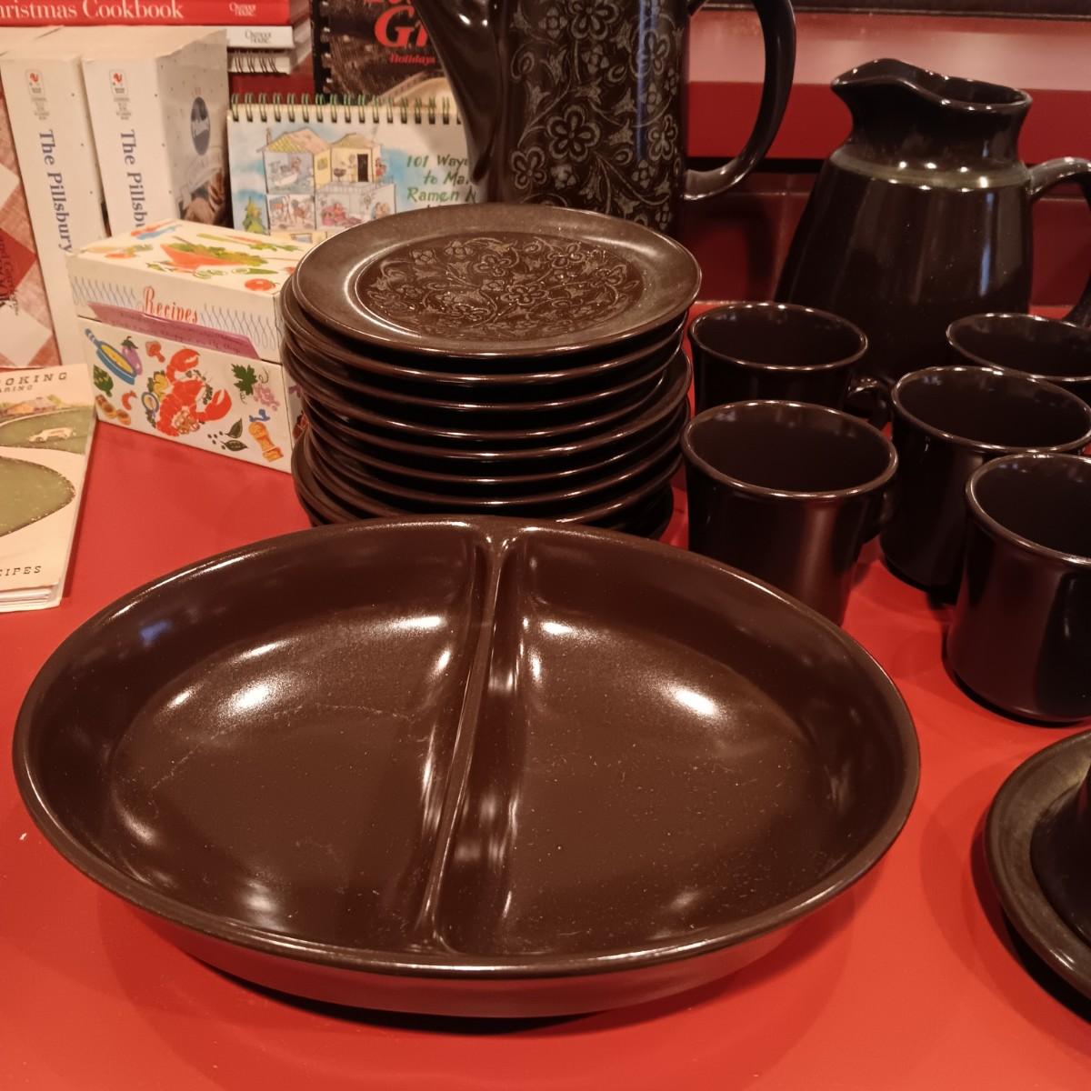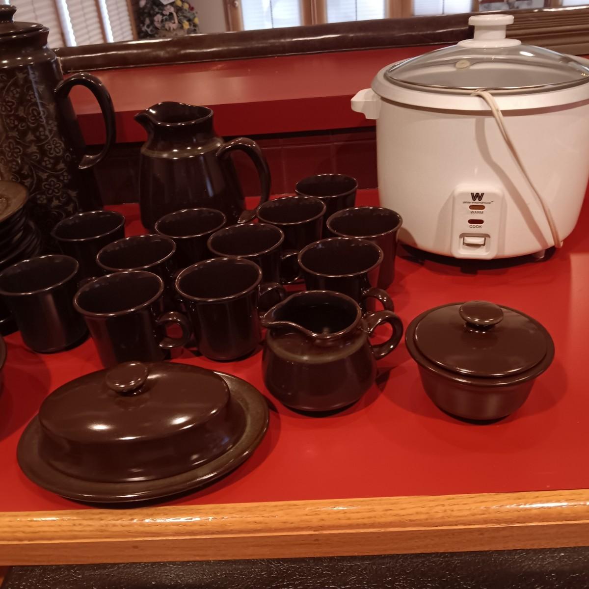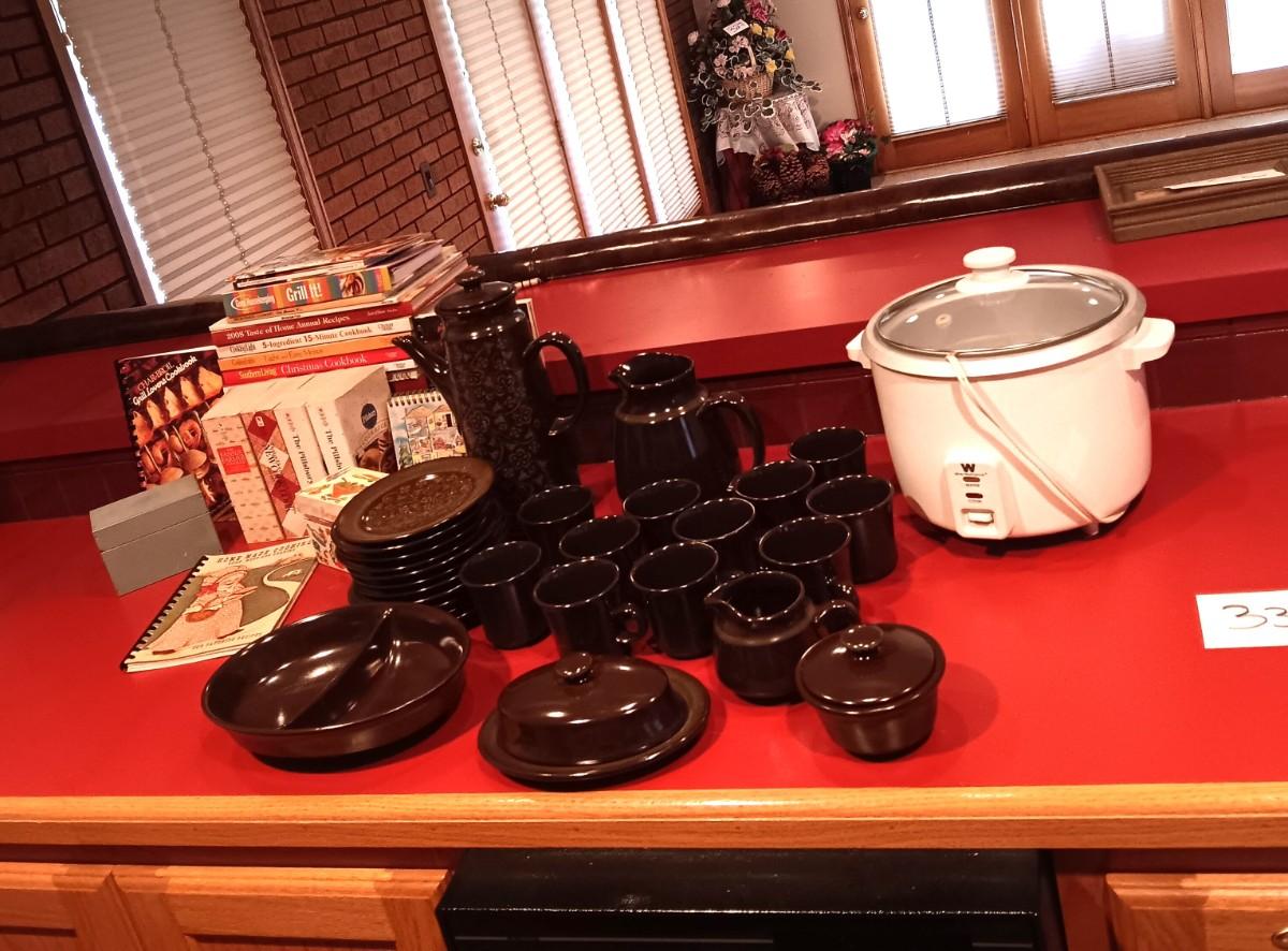 PARTIAL SET OF FRANCISCAN DINNERWARE, CROCK POT AND COOK BOOKS