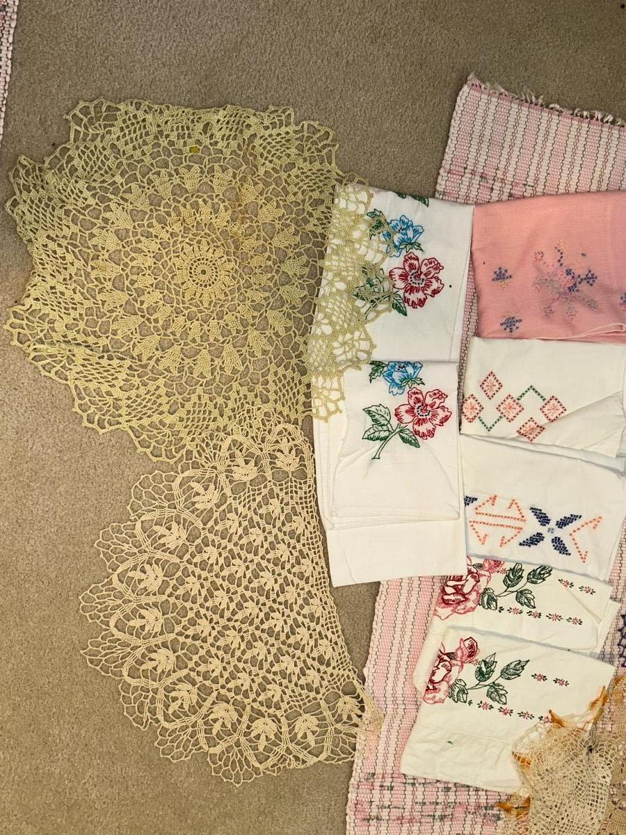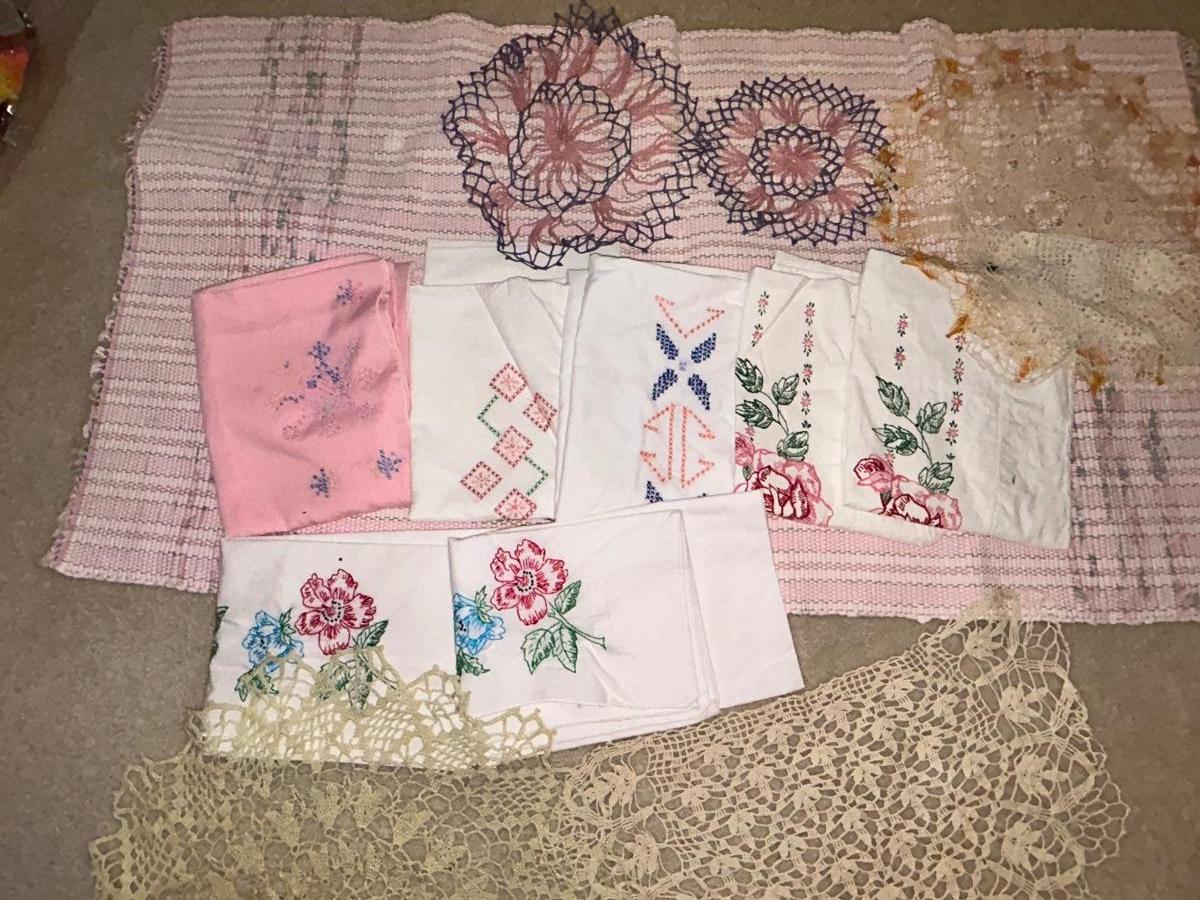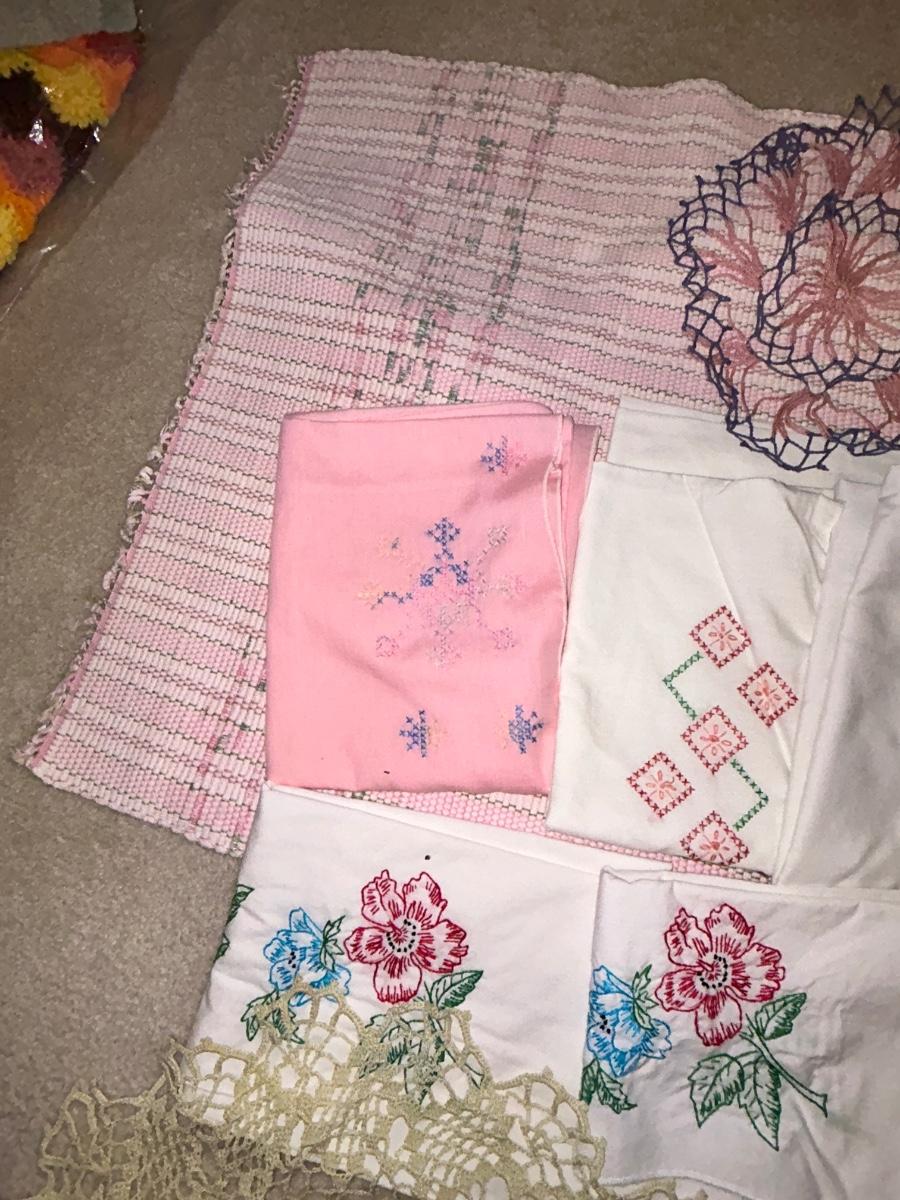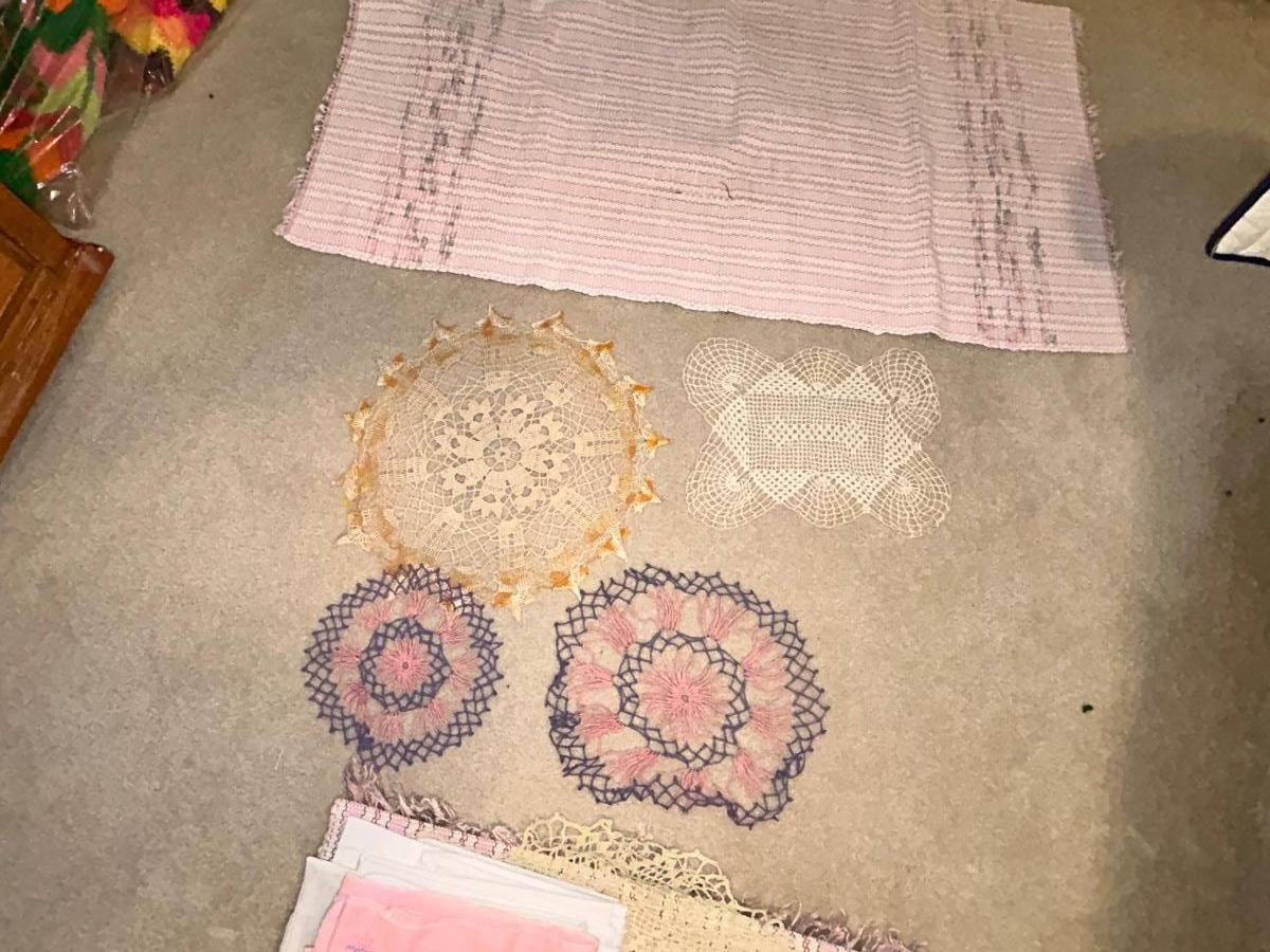 PARTIALLY FINISHED EMBROIDERED ITEMS, HAND WOVEN RUG AND DOILIES