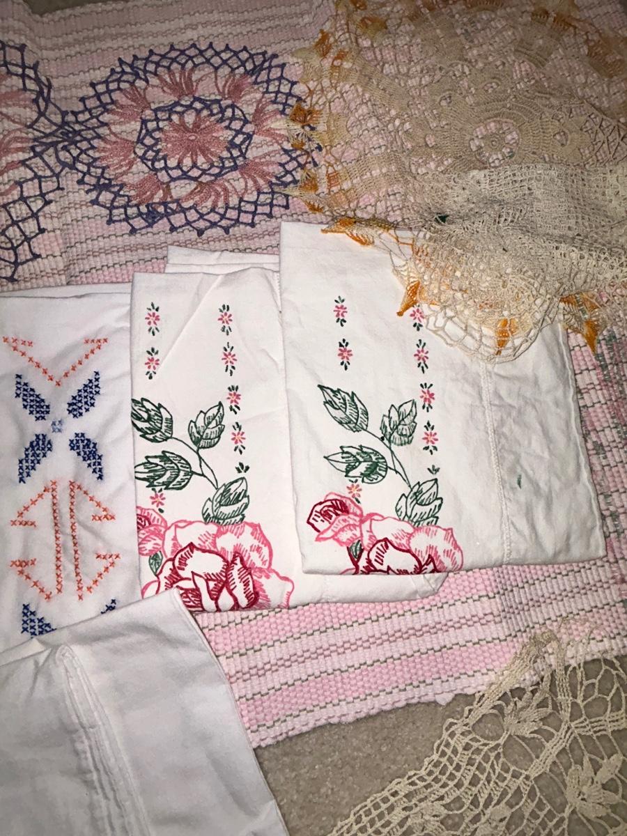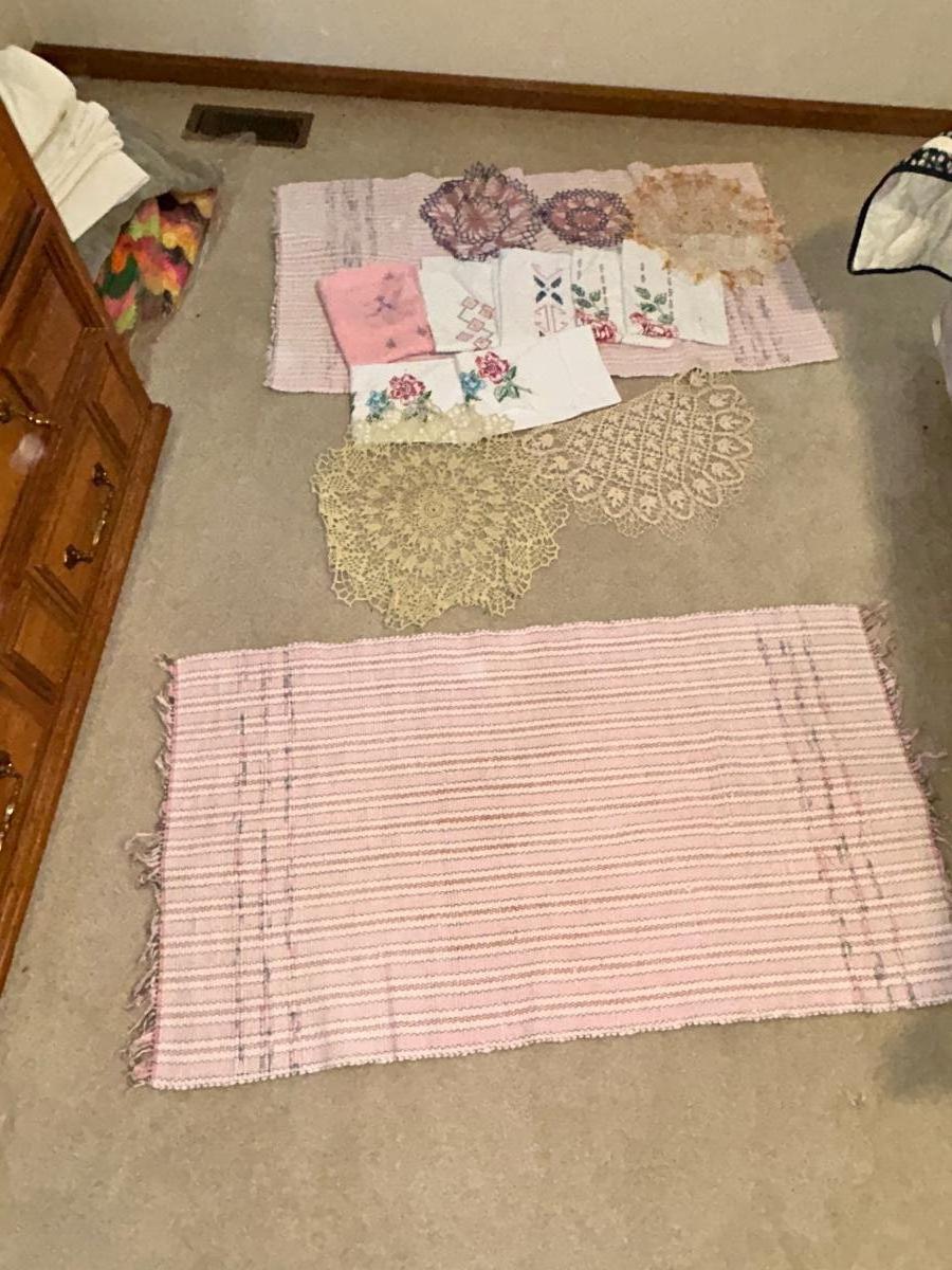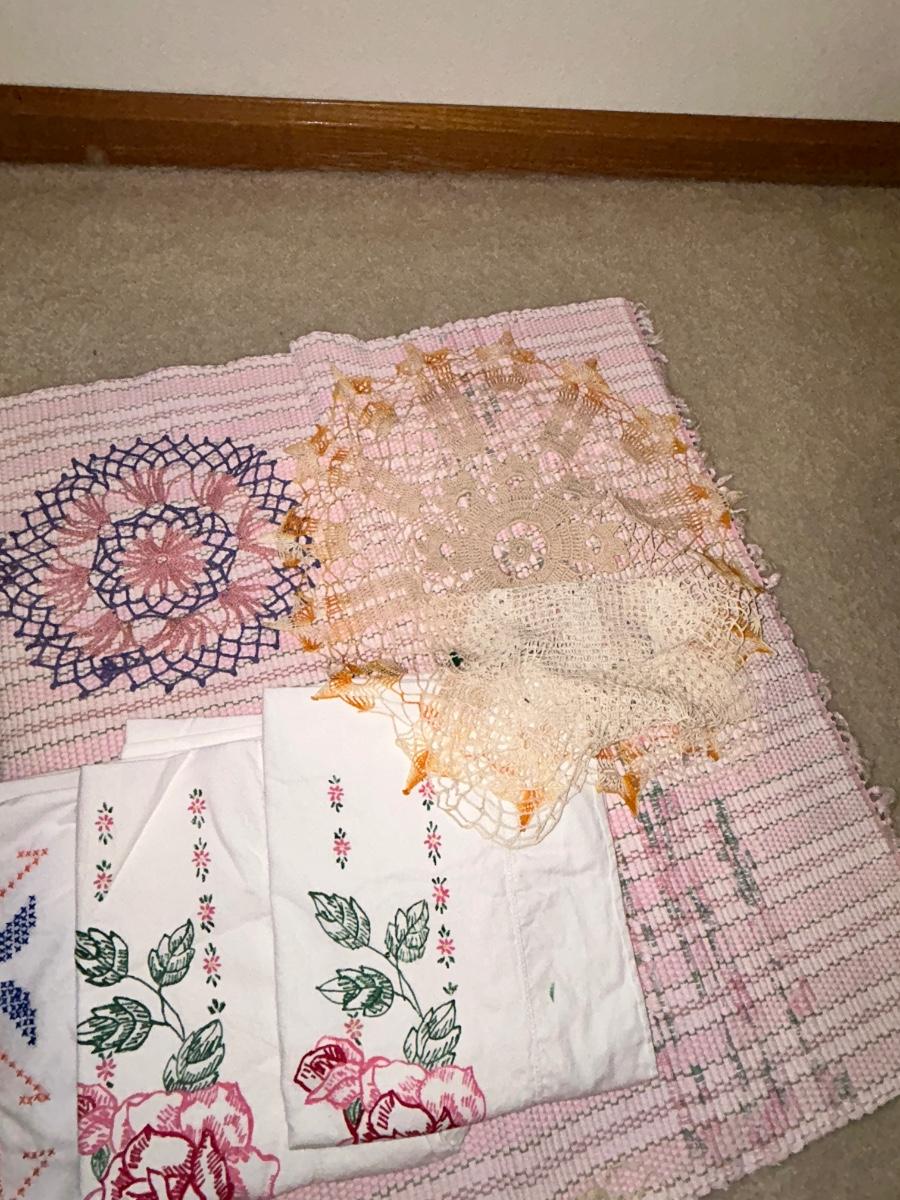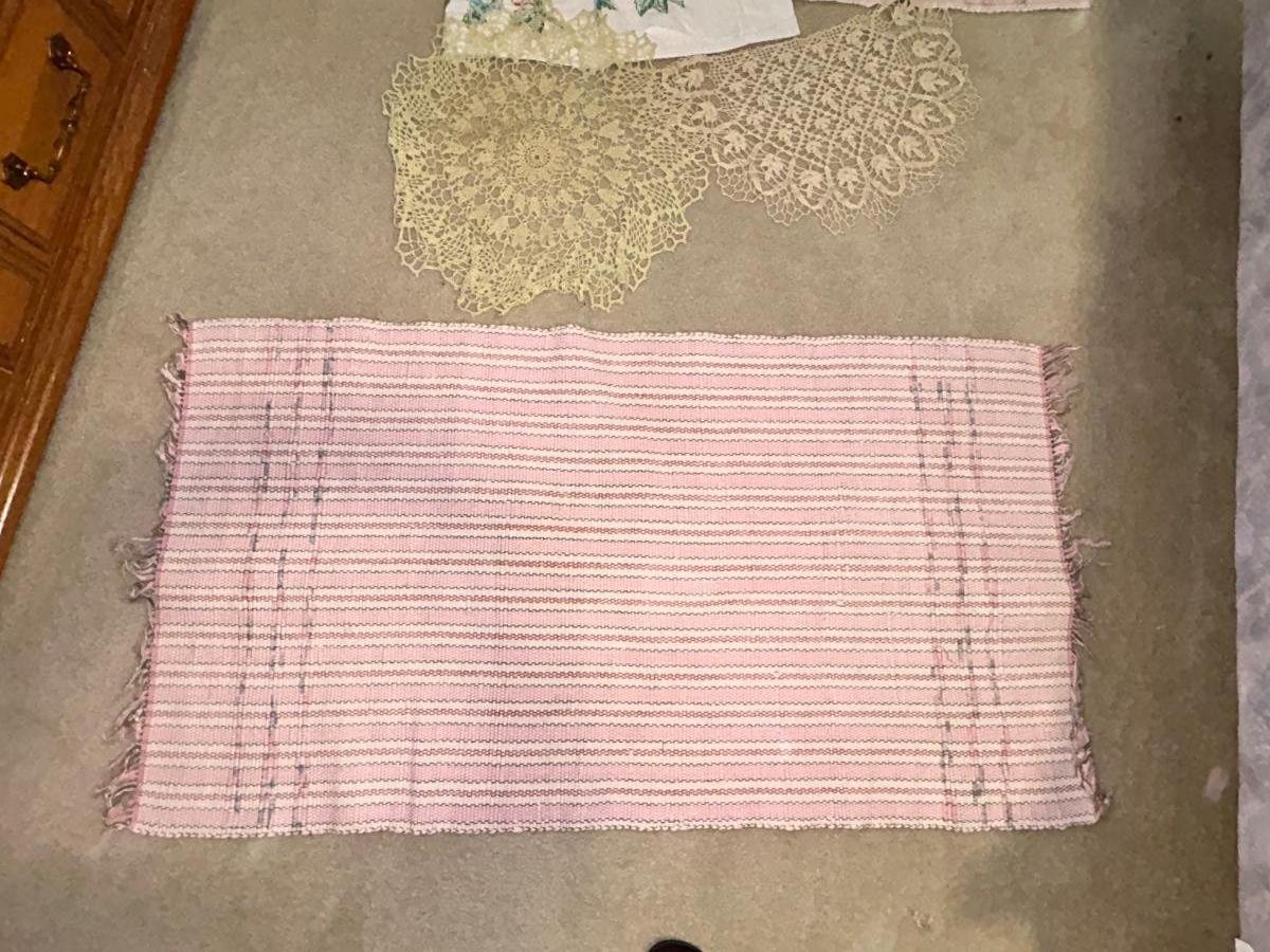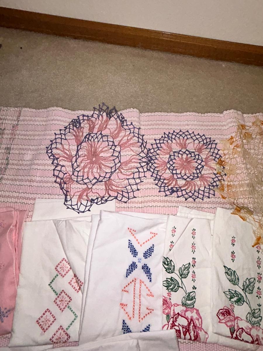 PARTIALLY FINISHED EMBROIDERED ITEMS, HAND WOVEN RUG AND DOILIES