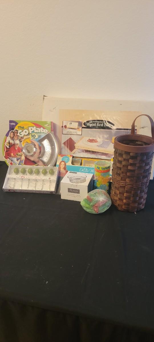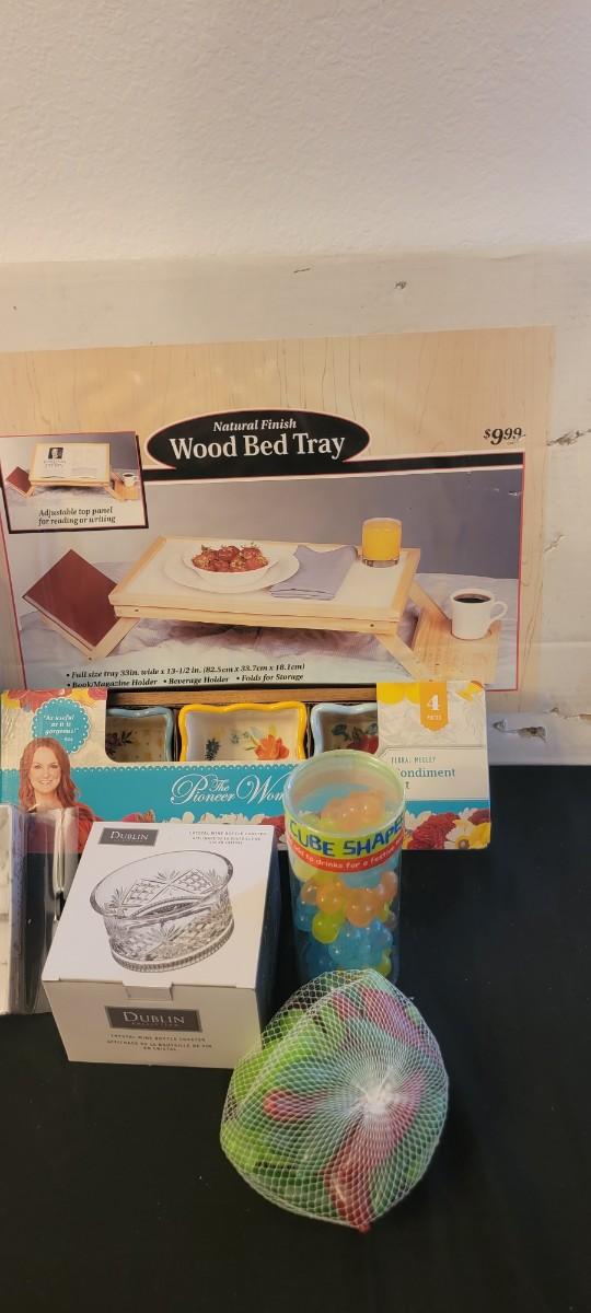 NIB wood bed tray, DumlinCrystal Wine Coaster, condiment set, plus