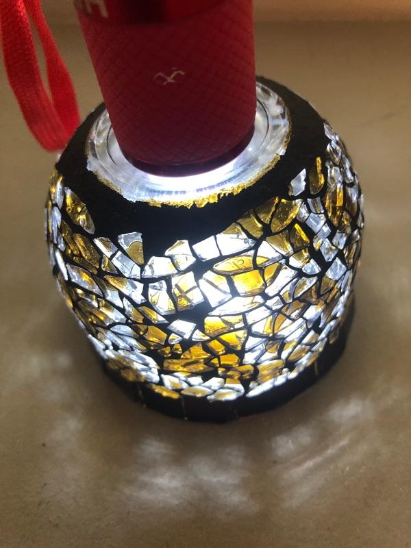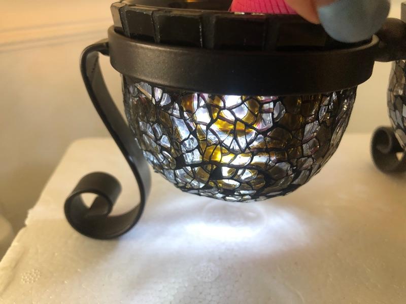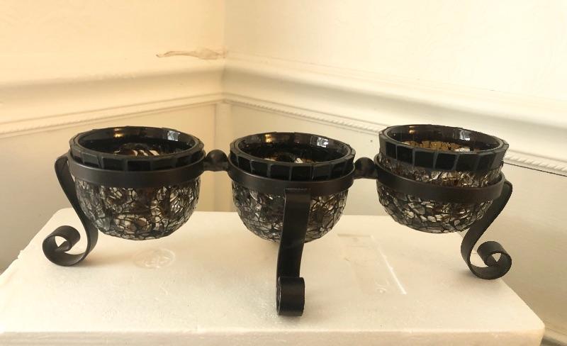 New in box metal holder and 3 glass small candle holders / took pictures with flashlight so you can see color