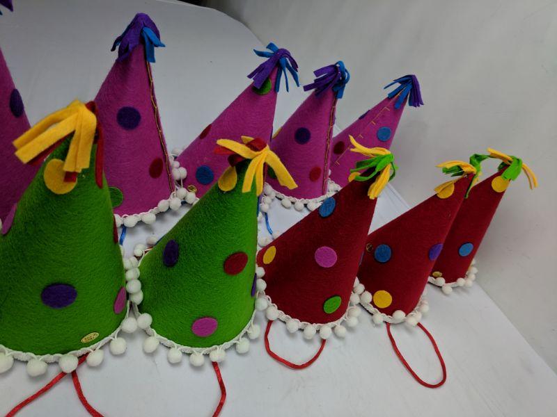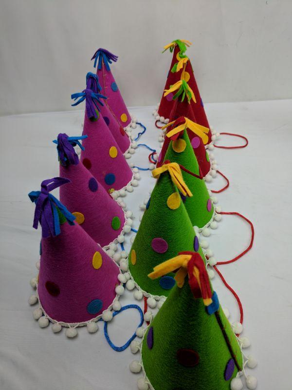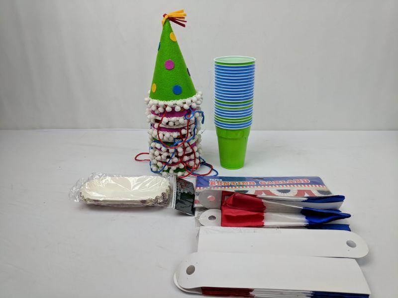 Party Lot, 11 Felt Party Hats, Hot Dog Trays, Paper Bunting Garland, 24 Plastic Cups