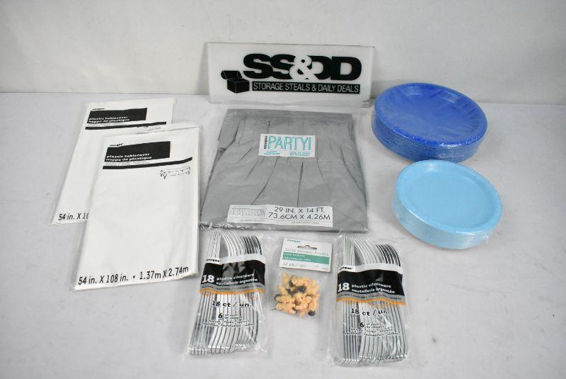 Party Lot - Plates, Plasticware, Charms, Tablecloth, Skirt, & More - New