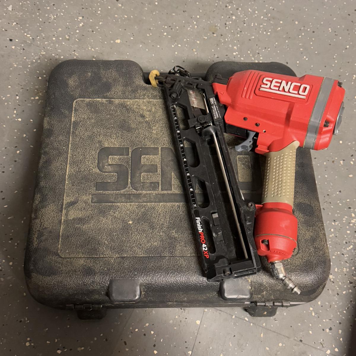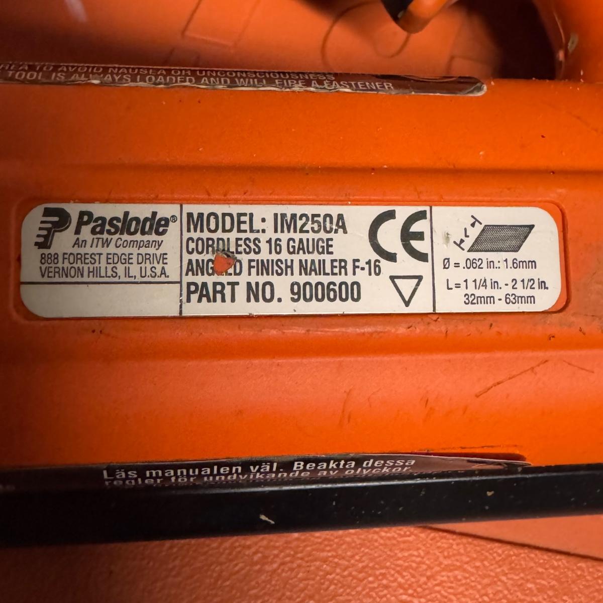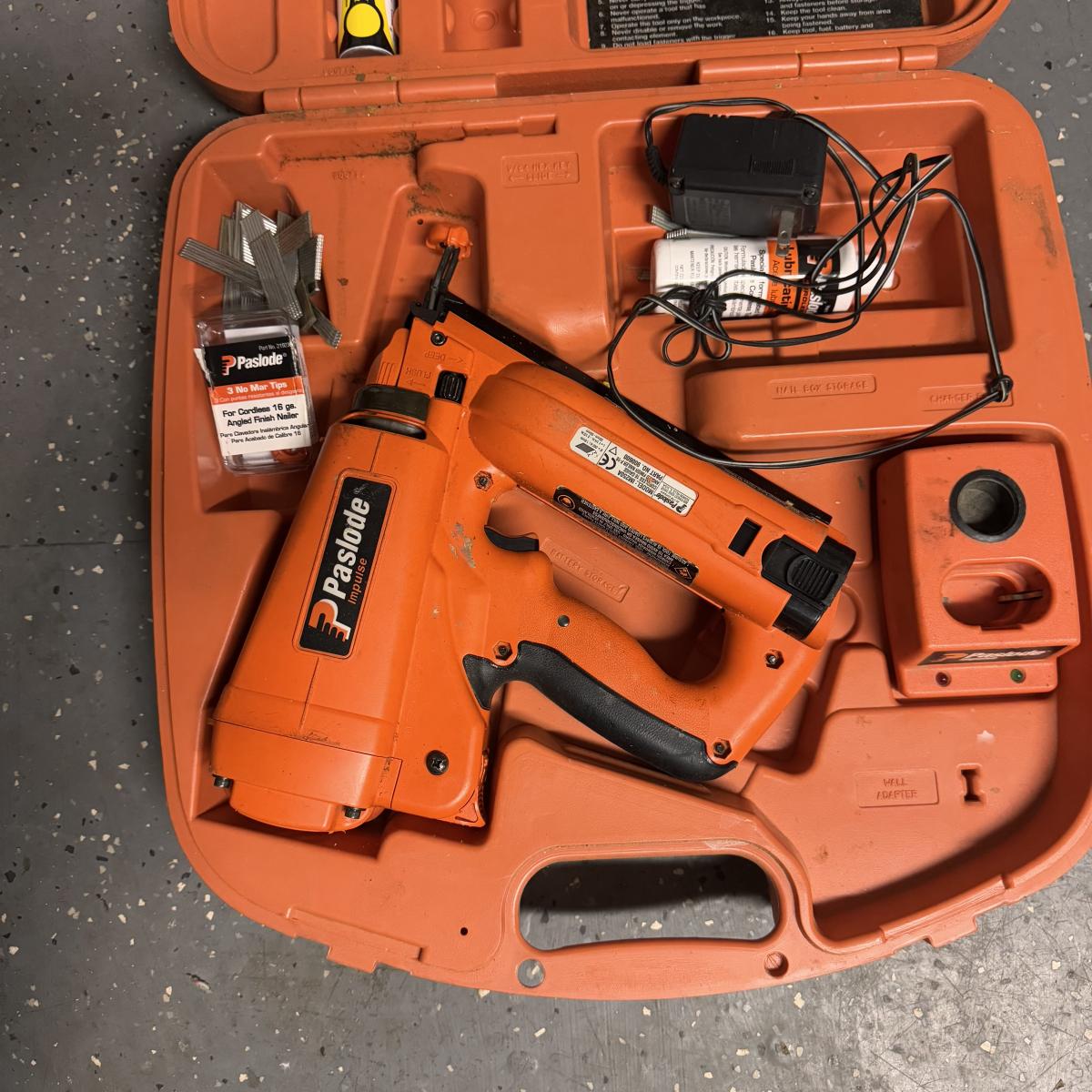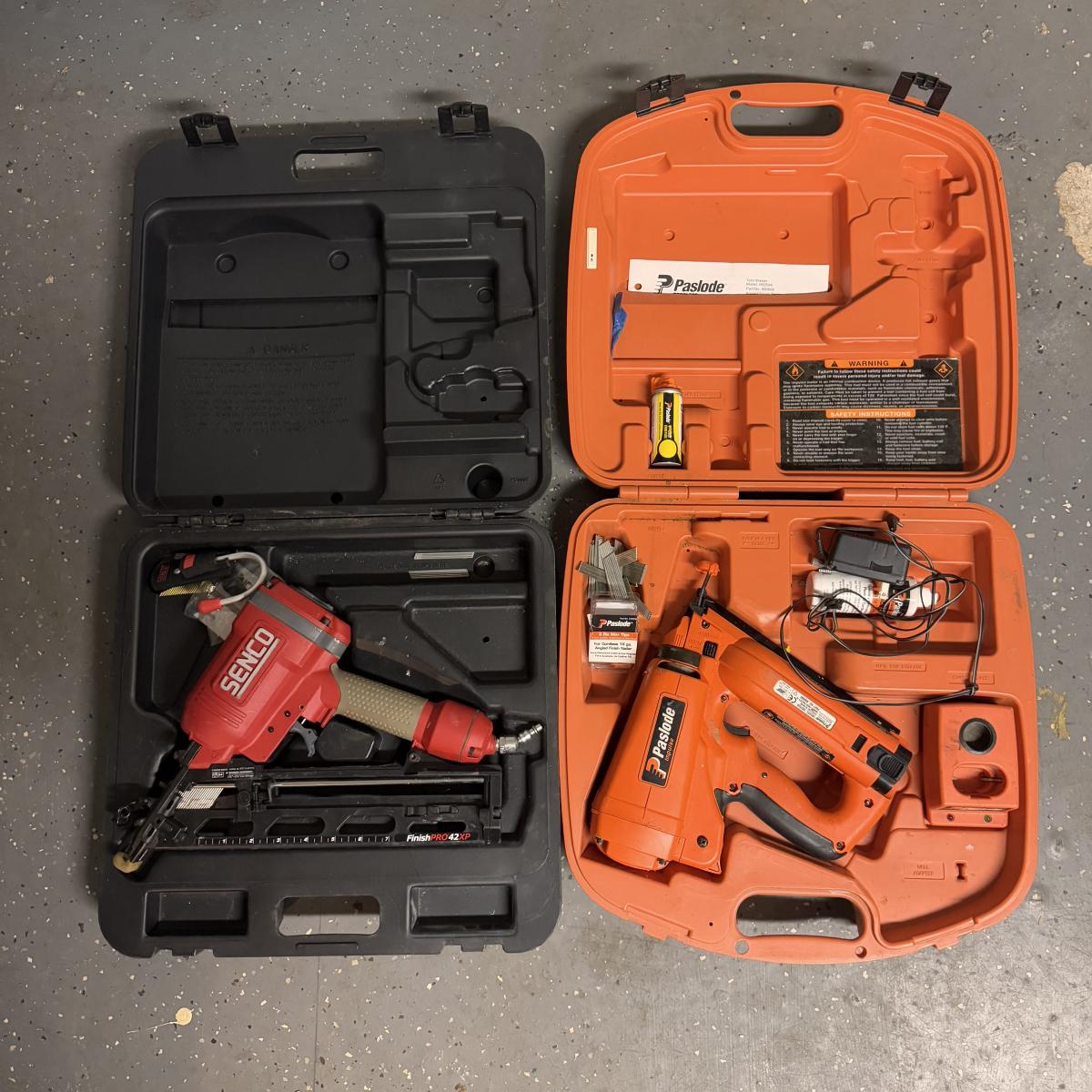 Lot includes one Paslode Impulse Angled Finish nailer and one Senco FinishPro 42XP Nailer. They both have some accessories included and they come in their original cases (bottle of lubricant appears to unopened). The Paslode Impulse comes with a wall charger that powered on when plugged in. The Senco appears to be pneumatically powered.