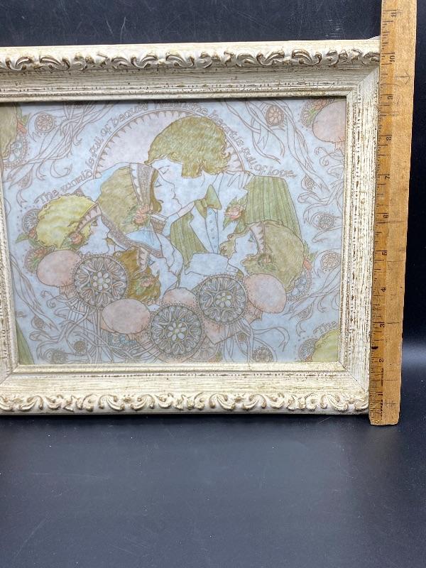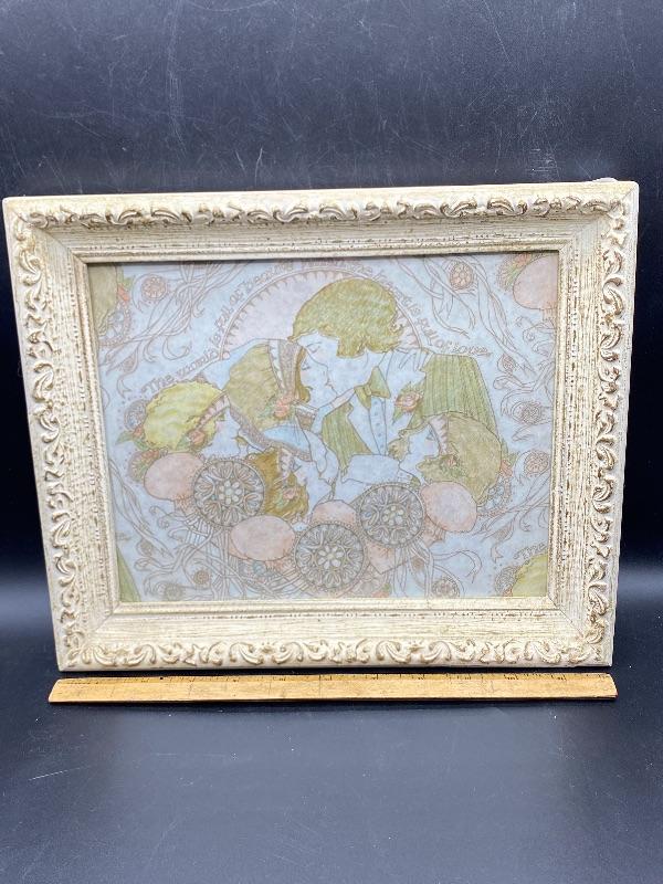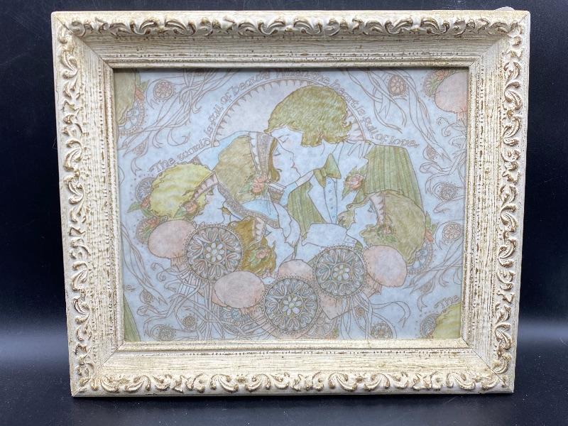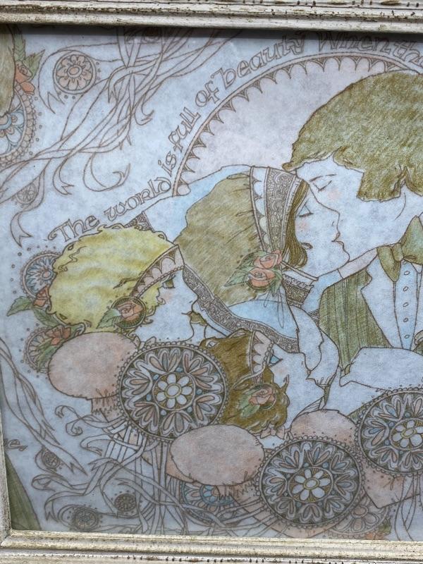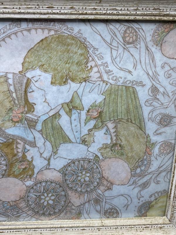 Pastel wedding art. Has an Art Deco Art Nouveau look to it. Framed about 12"x10". Unsure actual age. It looks like it may have been gift wrap it looks like the image repeats itself along the edges.