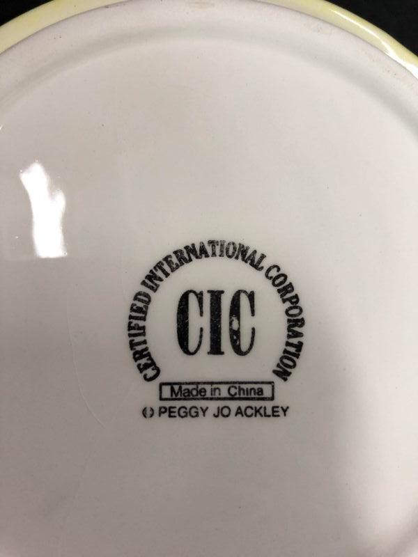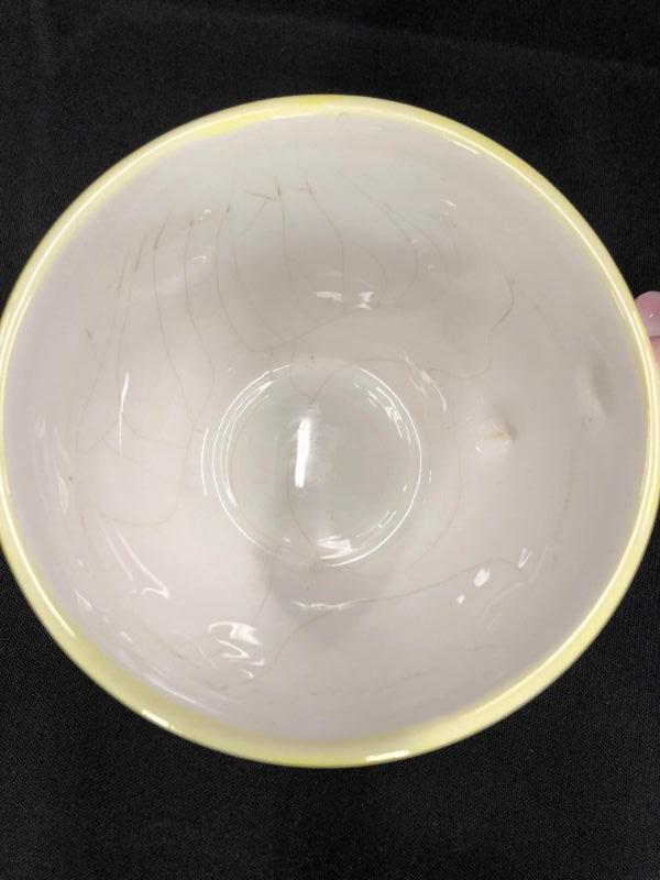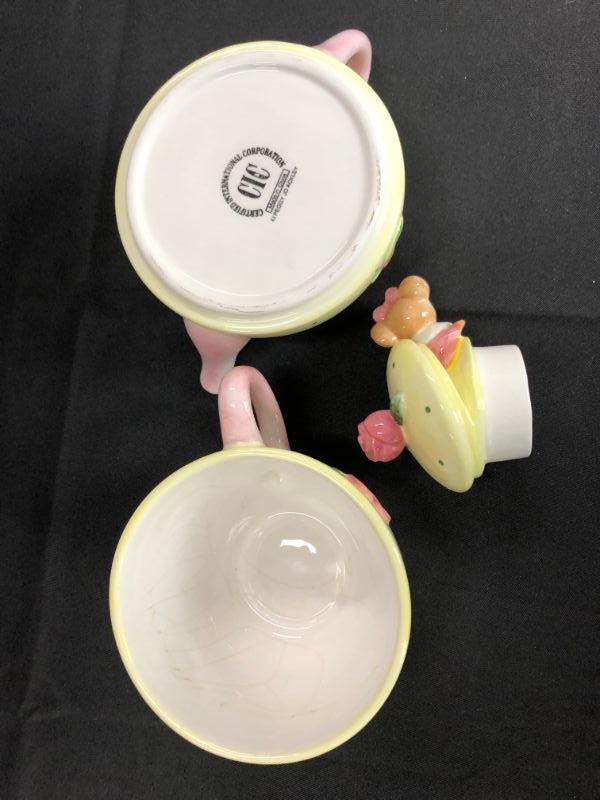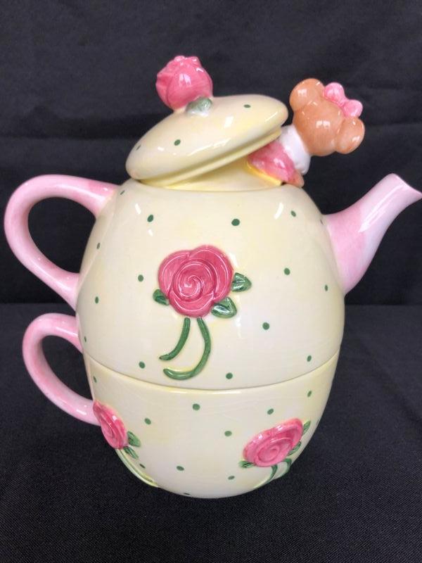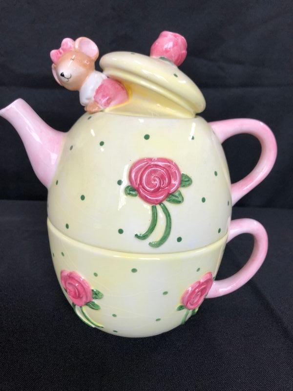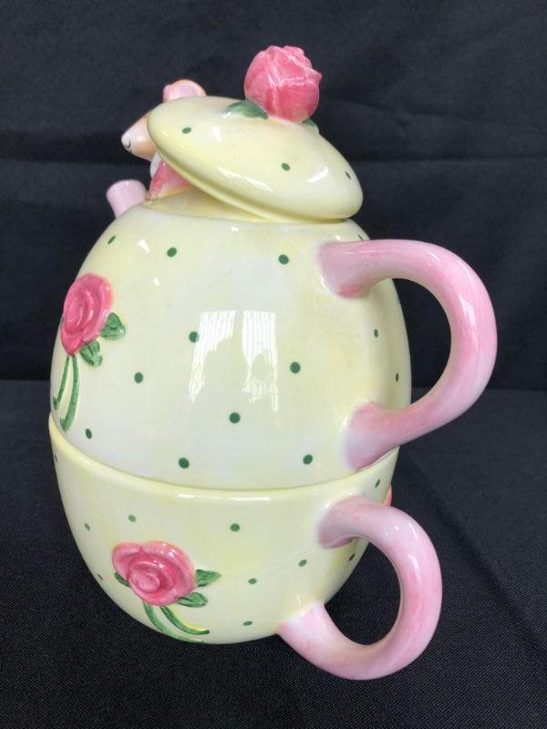 Pastel yellow & pink Tea for one set. Features a stacking teapot and cup. Yellow with pink handles, green polka dots, and roses. A cute little mouse peaking out of the top. Good condition, no chips or repairs.