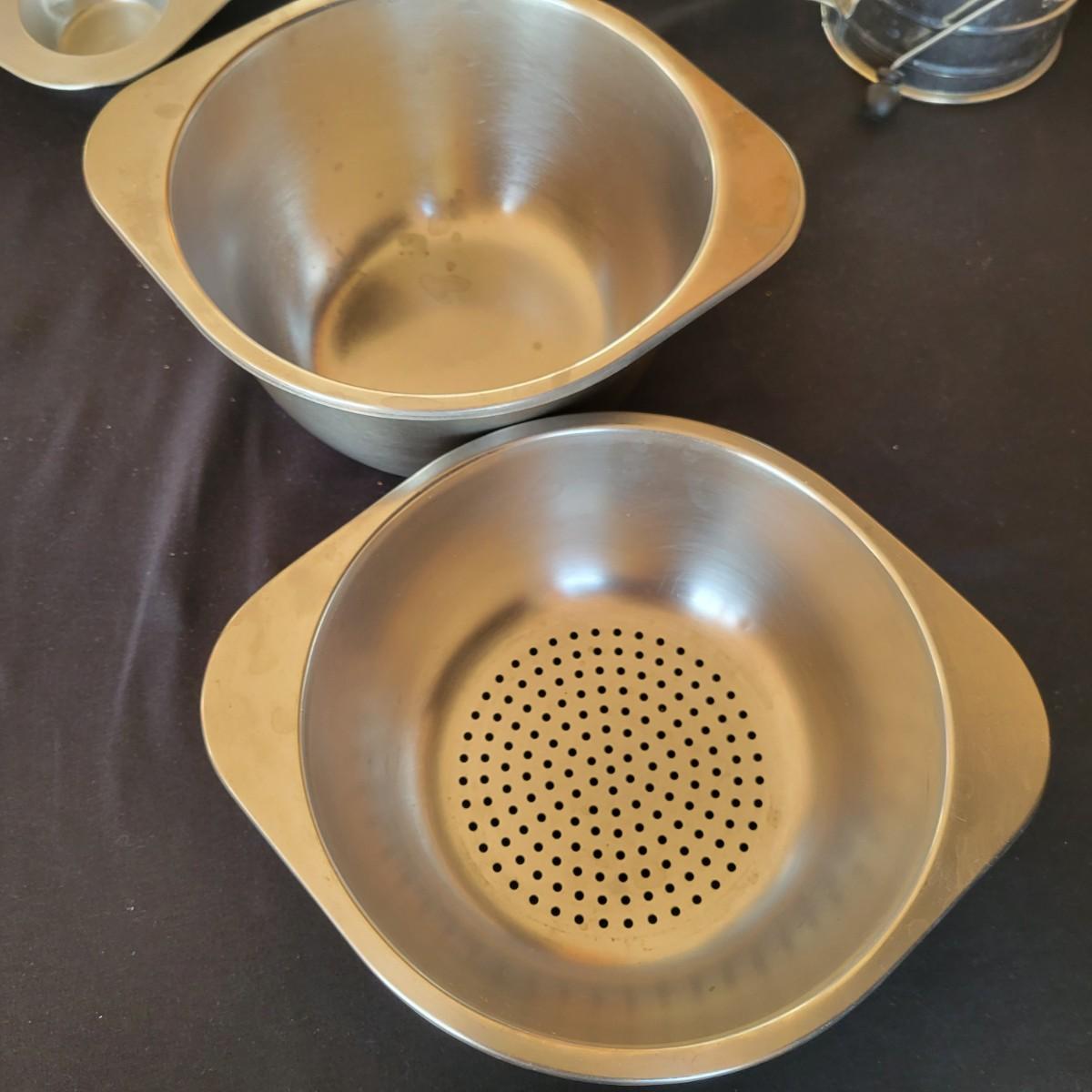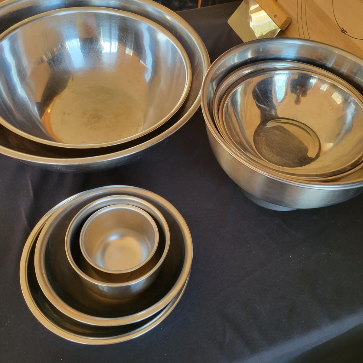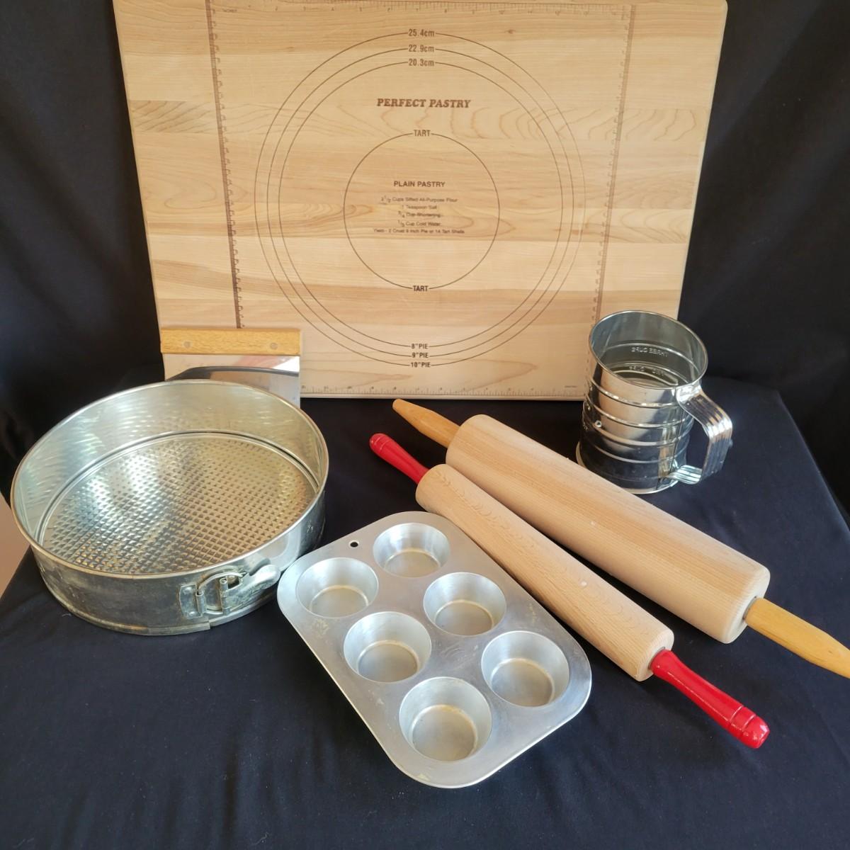 An assortment of baking and cooking items. Included is a large assortment of mixing bowls, rolling pins, baking pans, a pastry knife, a pastry board and more. The pastry board measures approximately 22" x 16" x .75"H. Local pickup only