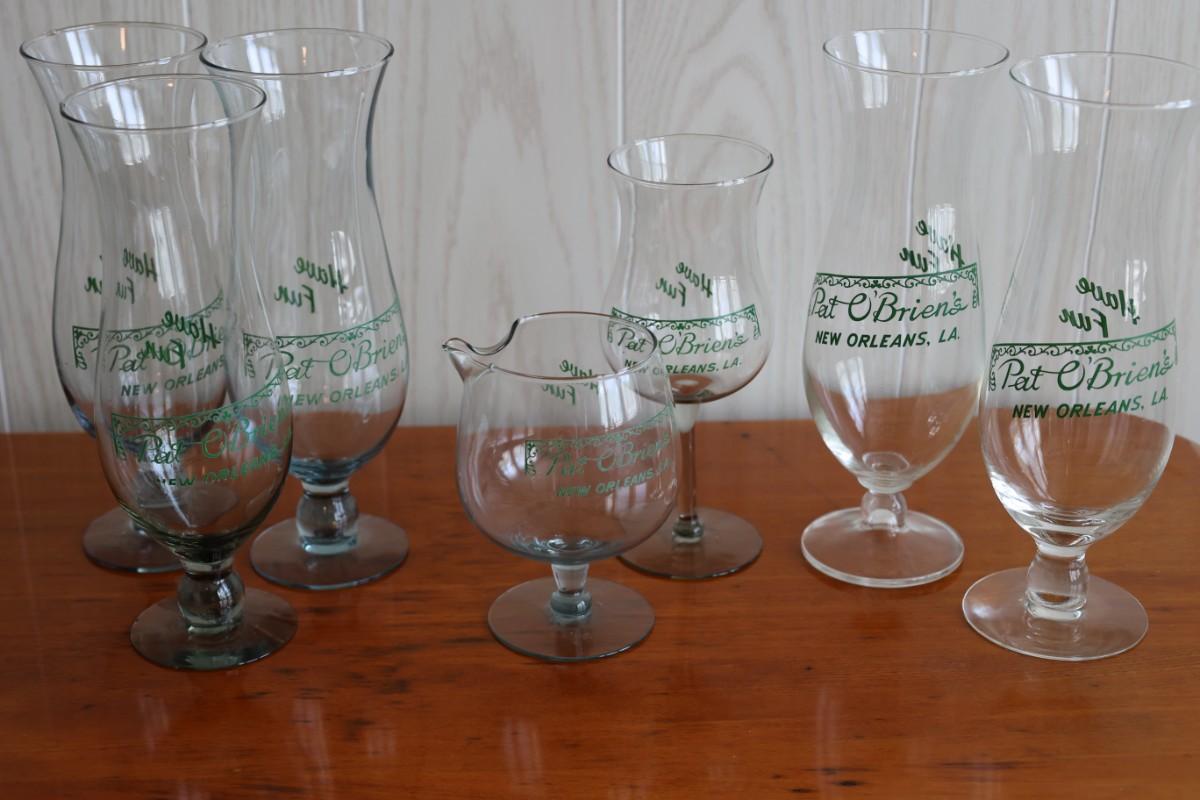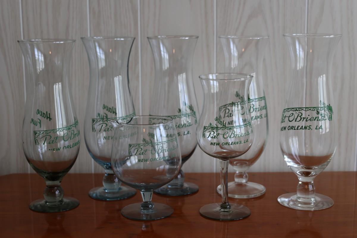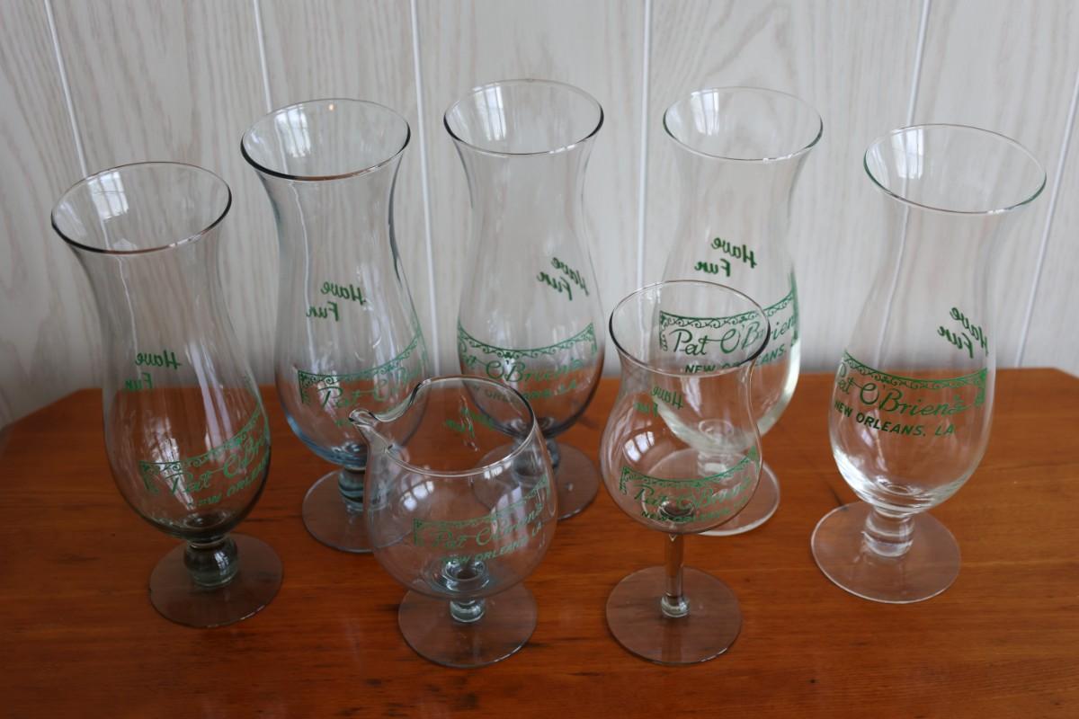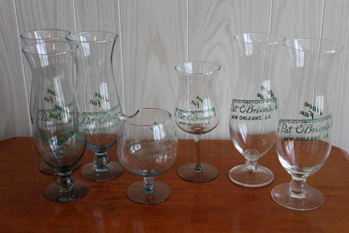 (1) Pat O'Brien's cyclone glass. (3) Blue stemmed Pat O'Brien's hurricane glasses. (2) Clear stemmed hurricane glasses. (1) Vintage daiquiri glass.