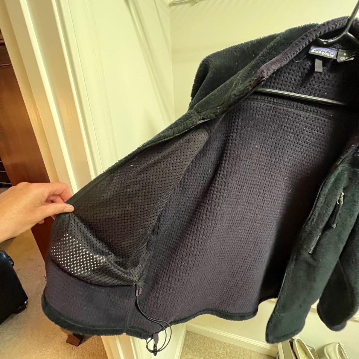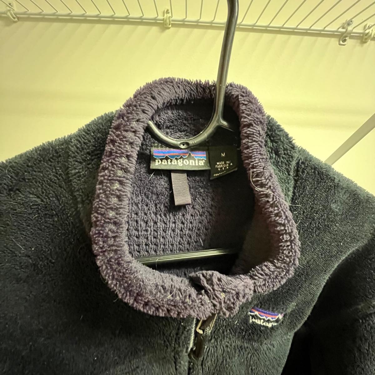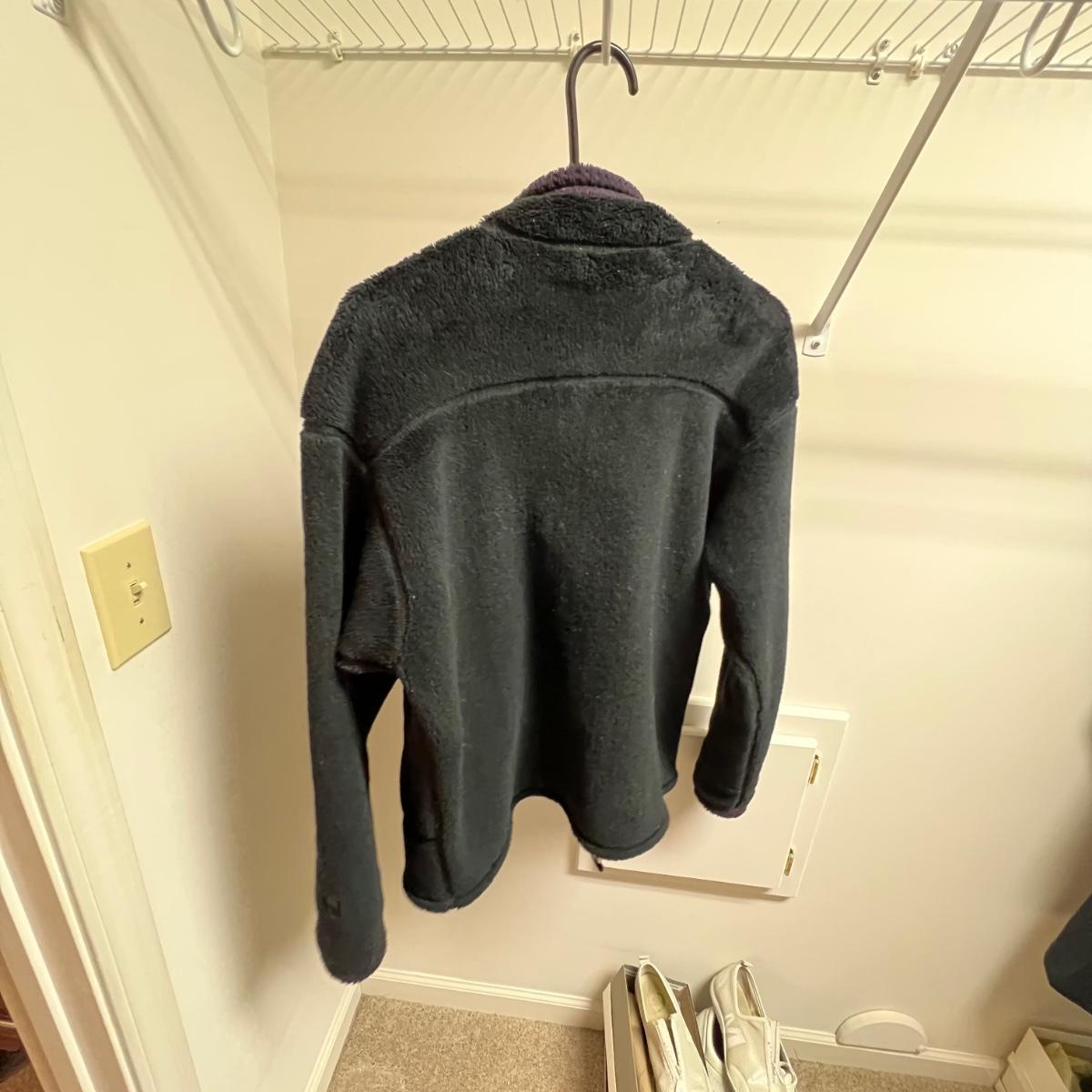 This Patagonia fleece jacket is black with purple lining and comes with multiple zippered pockets.