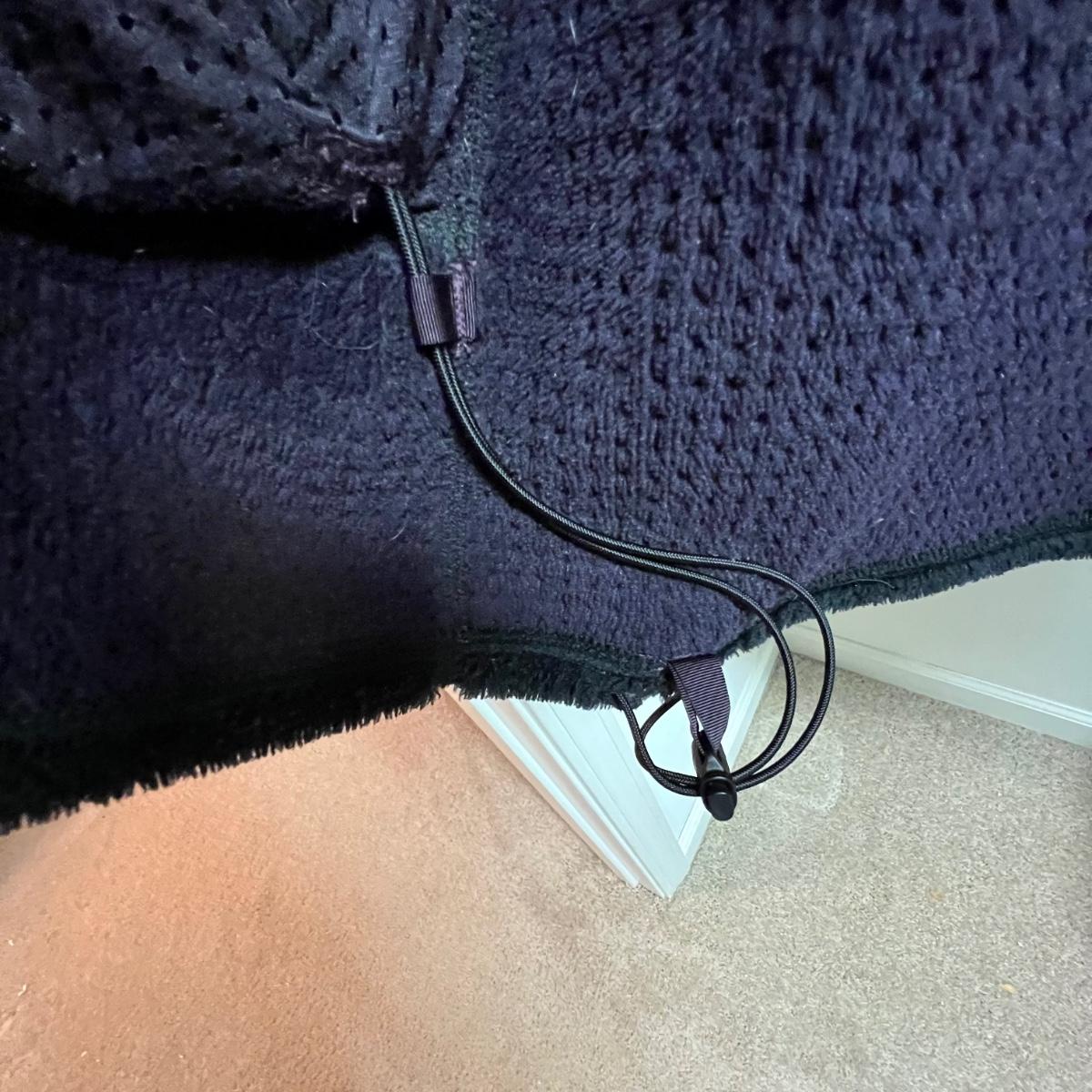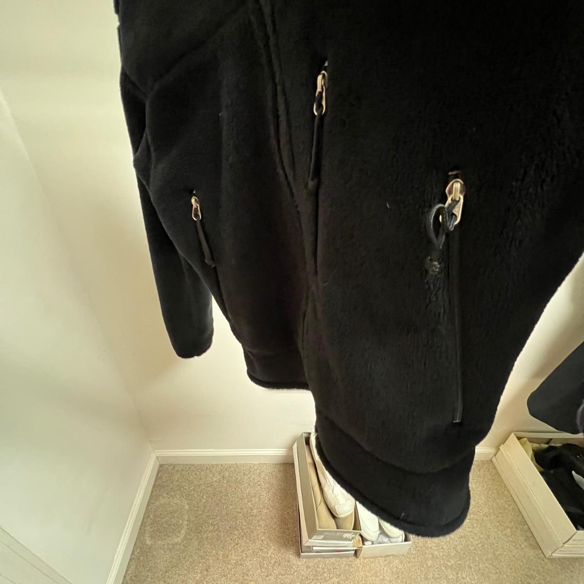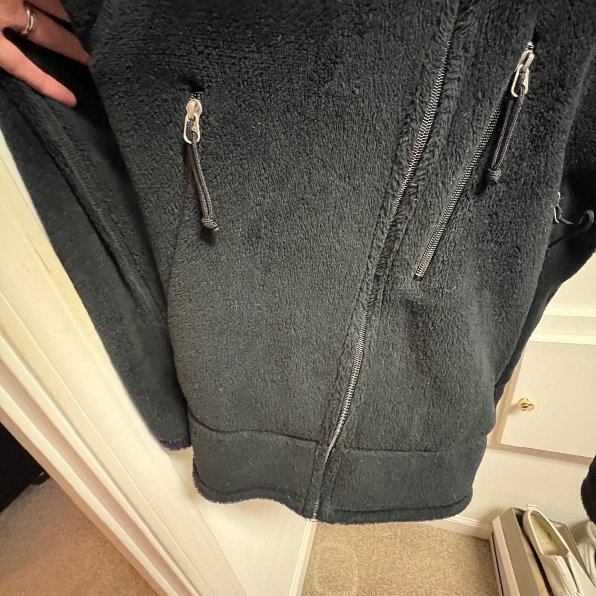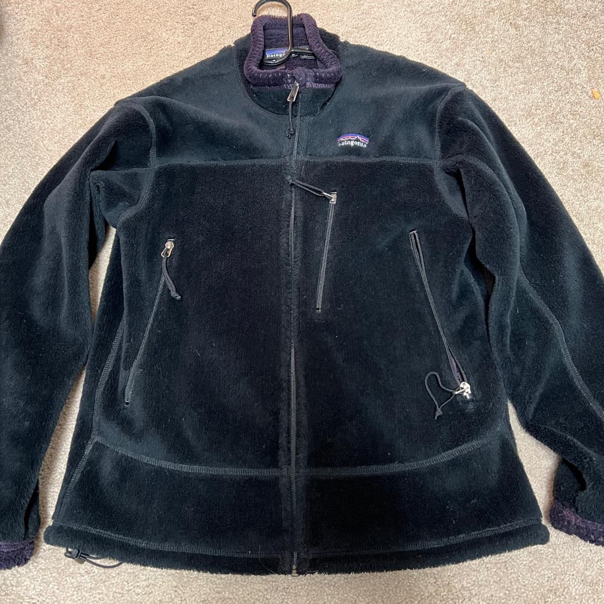 This Patagonia fleece jacket is black with purple lining and comes with multiple zippered pockets.