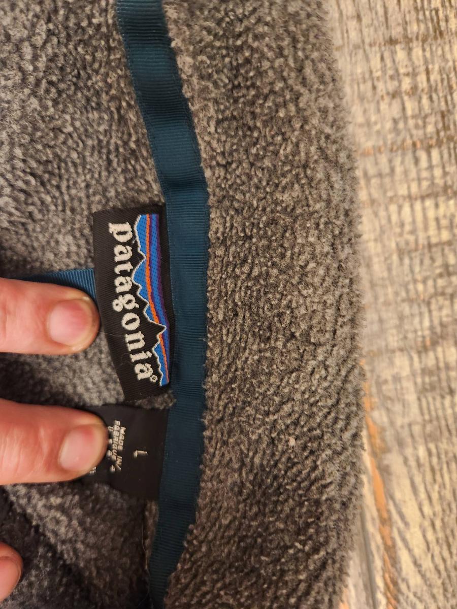 Patagonia men’s full-zip fleece jacket in gray, size L. Features two zippered front pockets for secure storage and a stand-up collar. Made from a textured fleece material, it provides warmth and comfort. The Patagonia logo tag is present near the collar. Suitable for casual or outdoor wear.