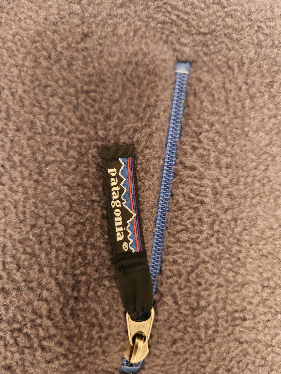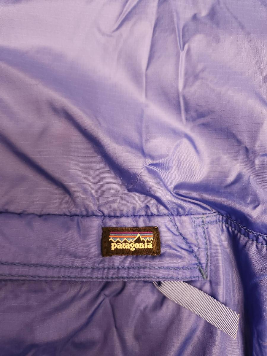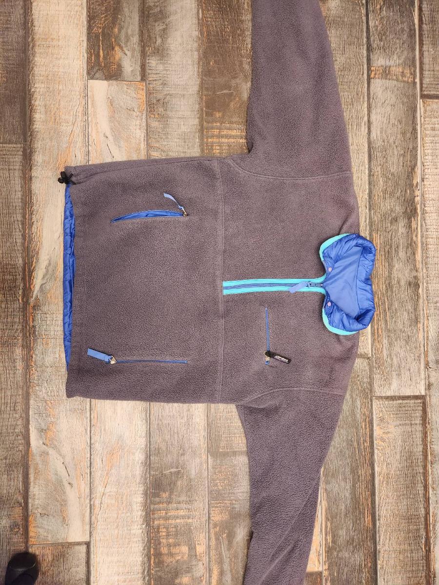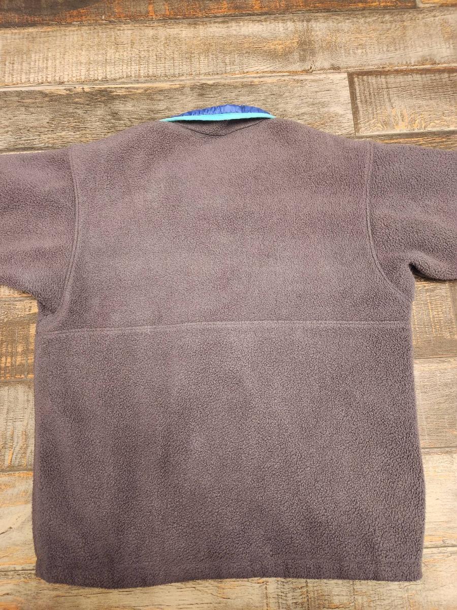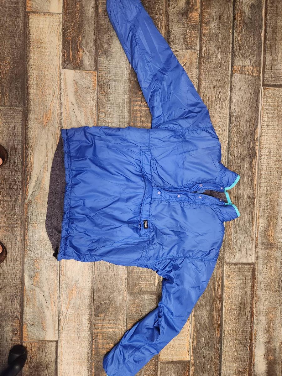 Patagonia reversible jacket featuring a gray fleece side with zippered pockets and a blue nylon side with a smooth finish. Includes full-length sleeves, zip-up closure, and durable stitching. The Patagonia branding is visible on zippers and inner tags. The jacket is in good condition, with minor signs of wear consistent with use.