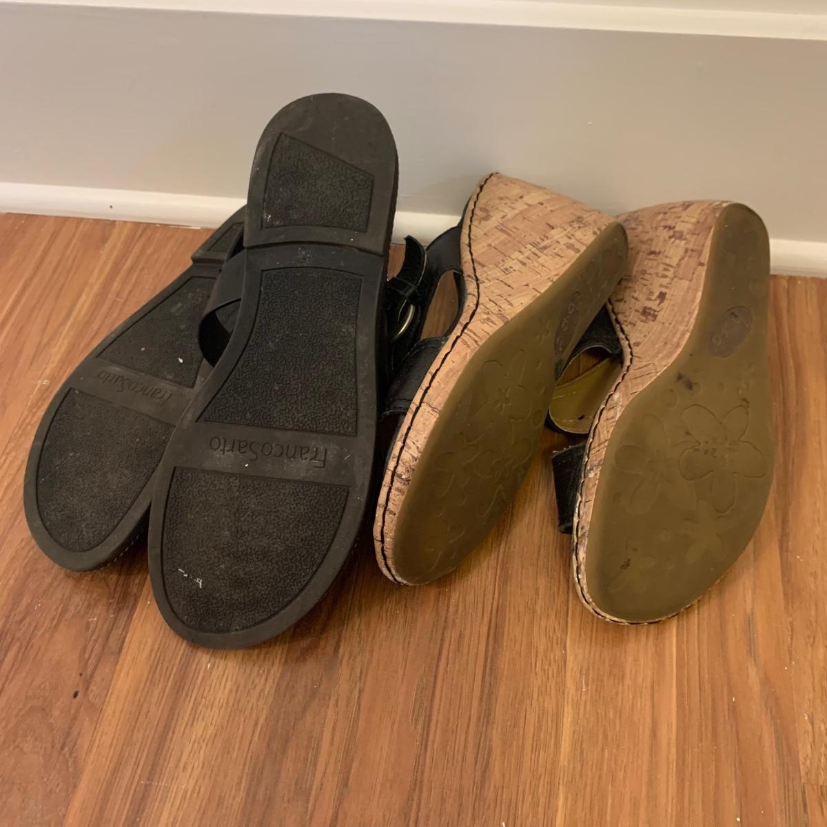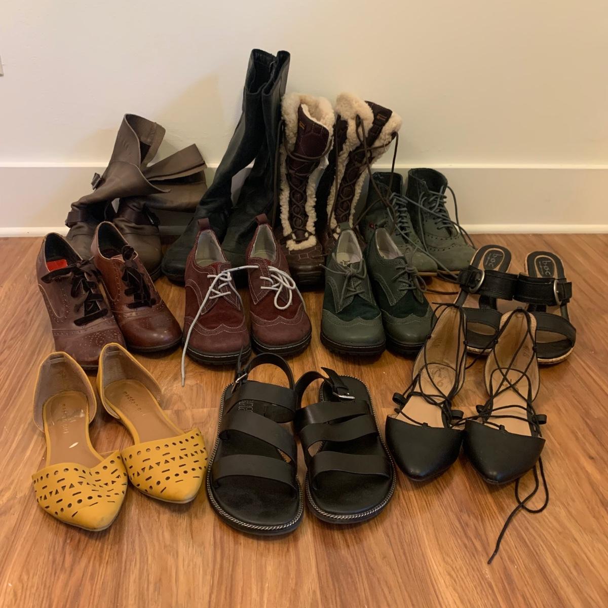11 pairs of size 7 ladies sandals, shoes, and boots. Please see photos for full inventory and details.