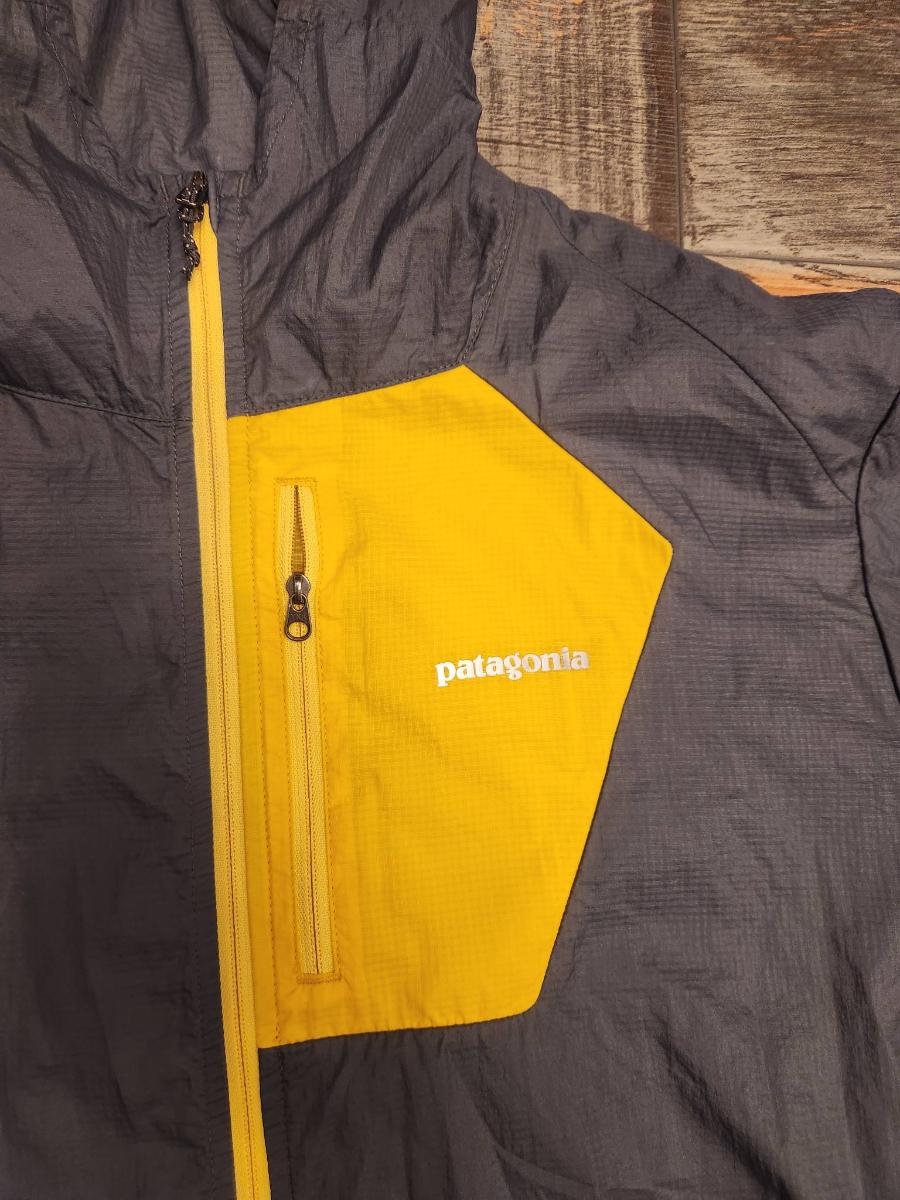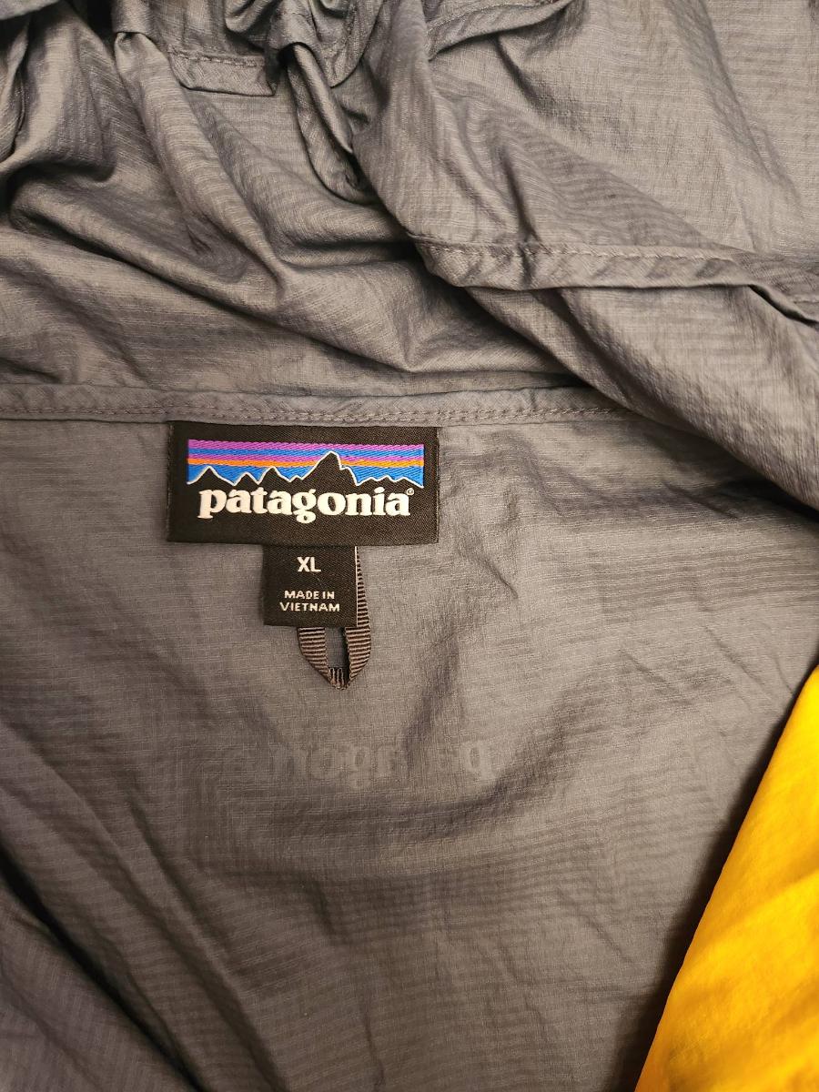 Patagonia lightweight windbreaker jacket in size XL. The jacket features a two-tone color design, with a gray base and yellow accents, including a zipper and a zippered chest pocket. The material is thin, as described, functioning as a wind-resistant layer. The interior label indicates the brand and size. It also has a hood and long sleeves for added coverage.