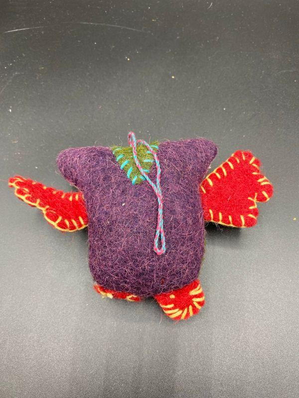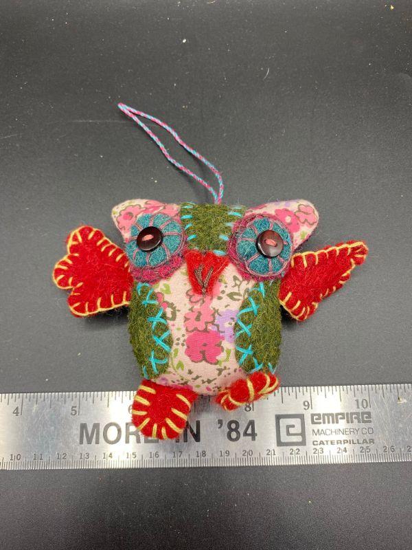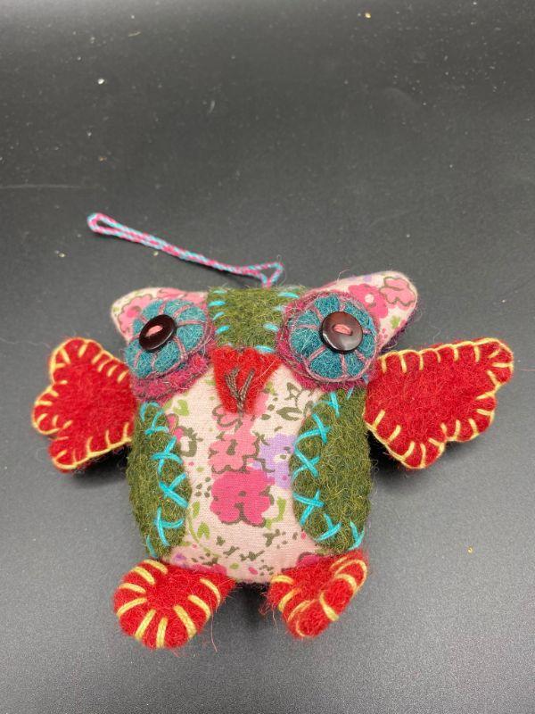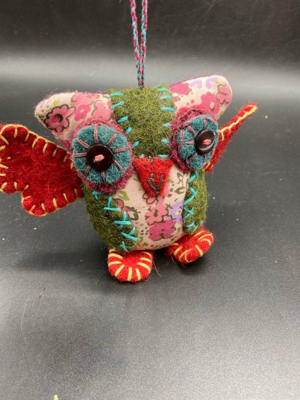 Small colorful felt patchwork owl. Hang on tree or year round decor. About 5" wing to wing.