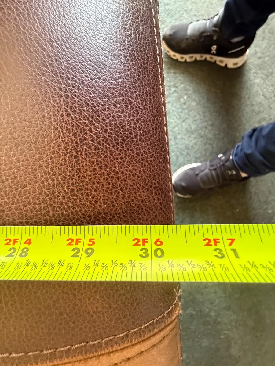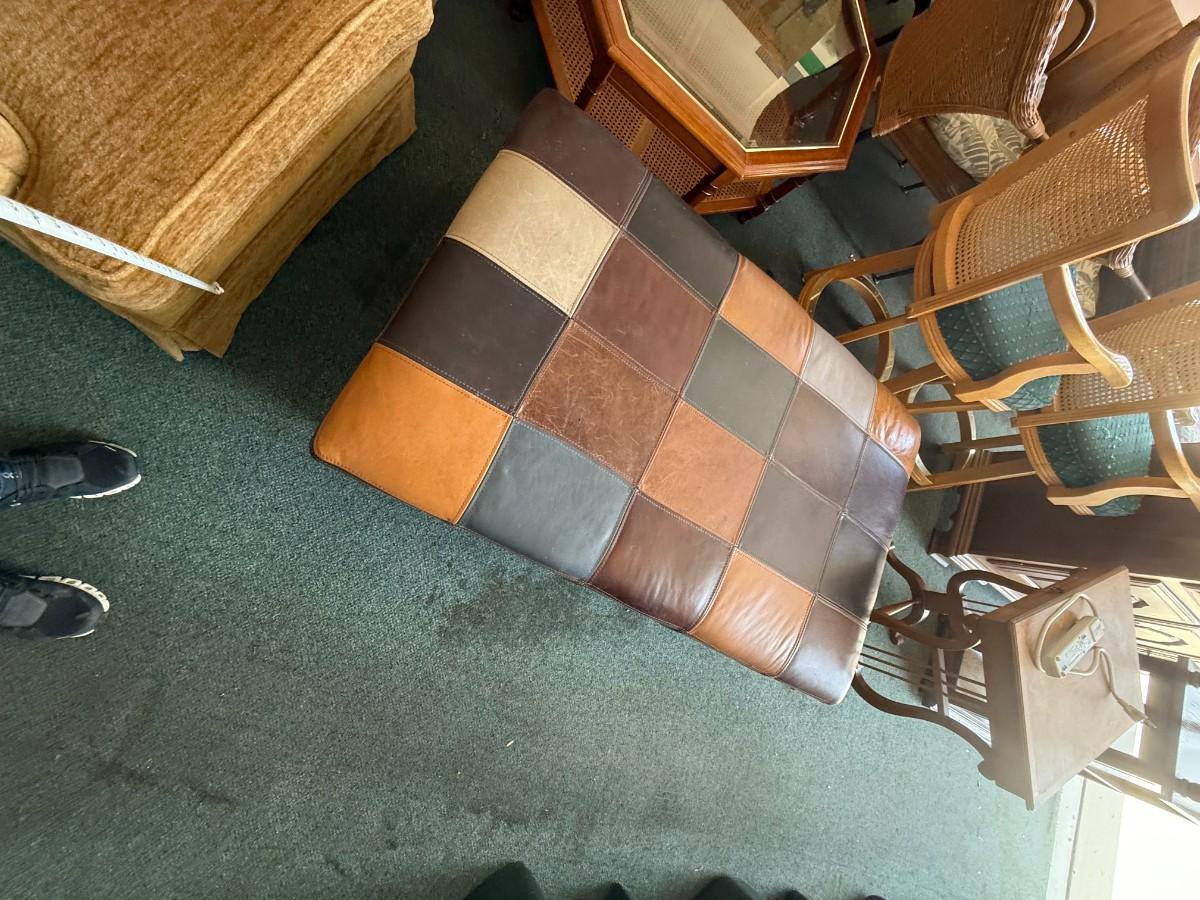 A beautifully crafted patchwork leather ottoman that serves as a stylish accent piece and additional seating.