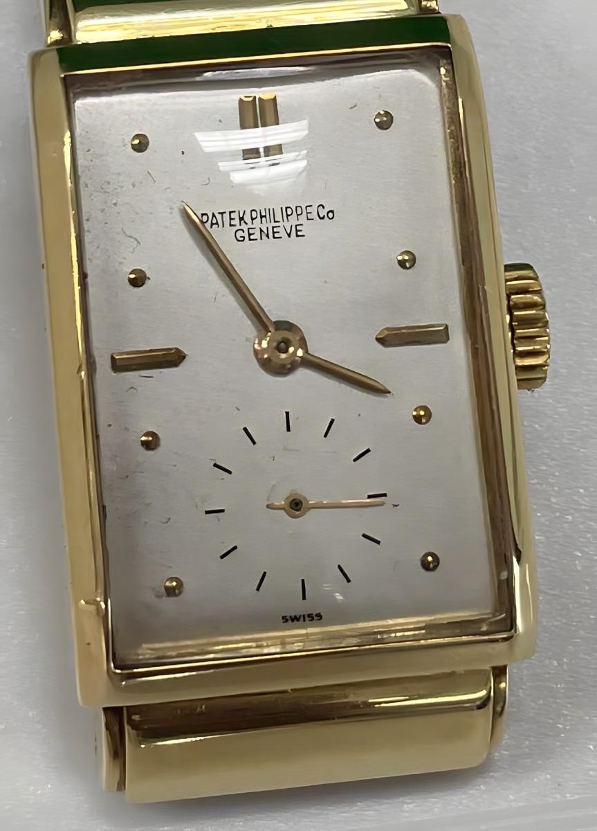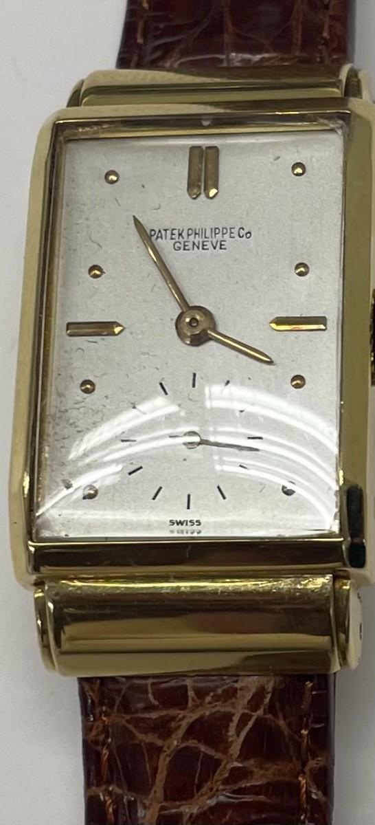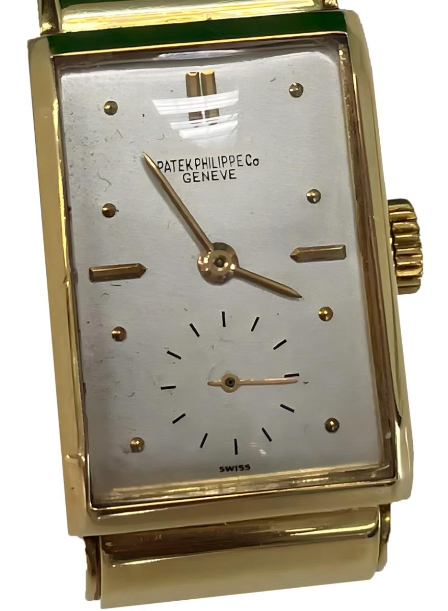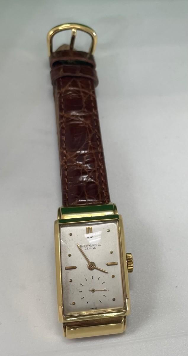 Description: Patek Philippe Male watch. Year: 1950s. 18 Jewels. 8 Adjustments. Swiss. 18 Karat Gold.