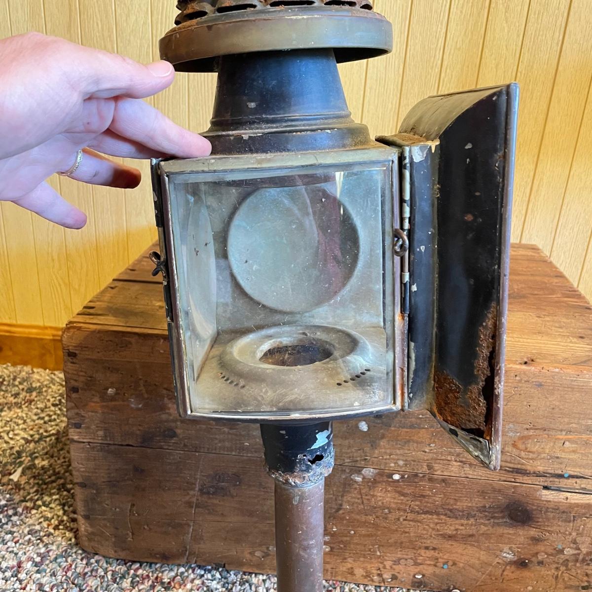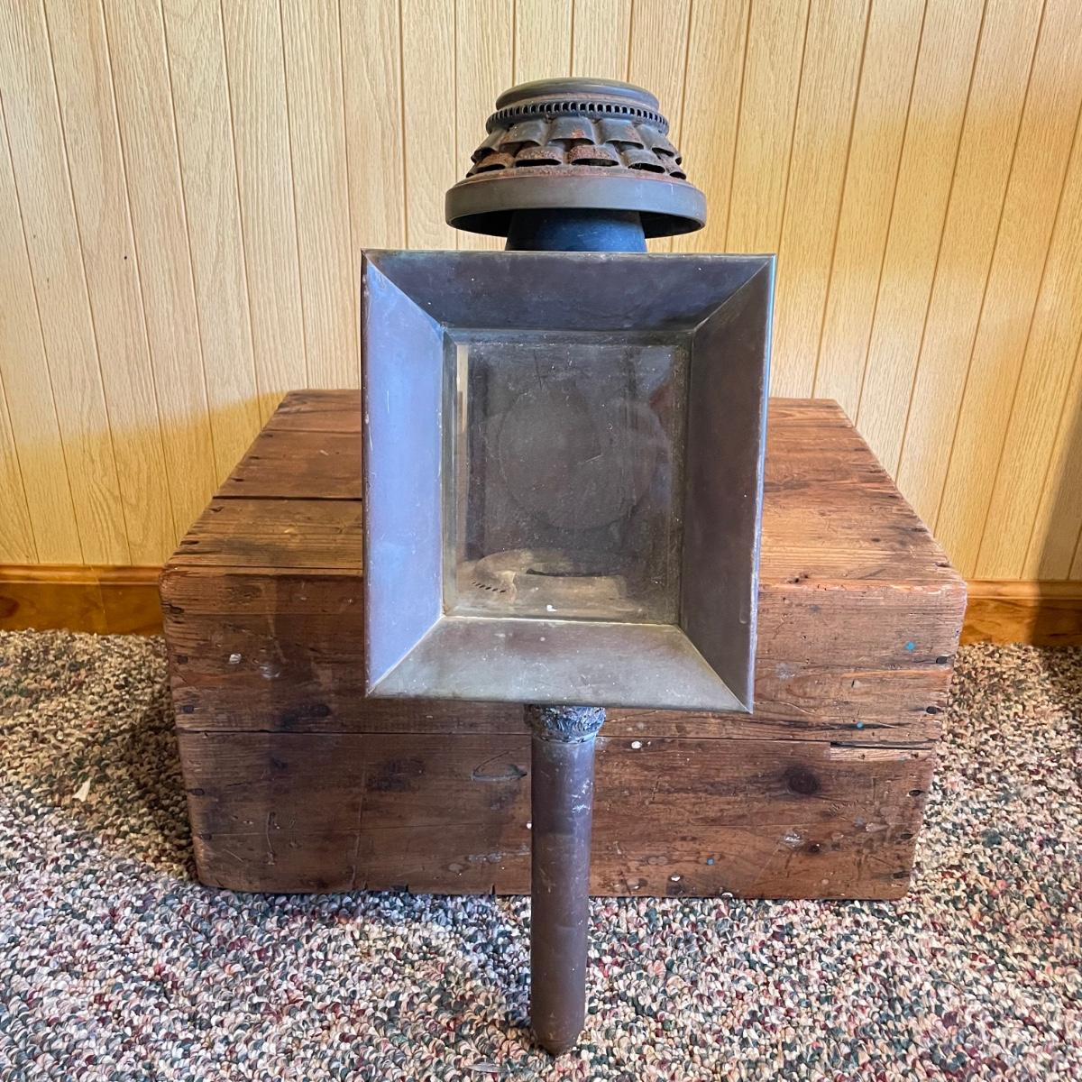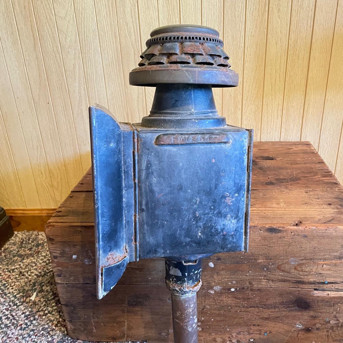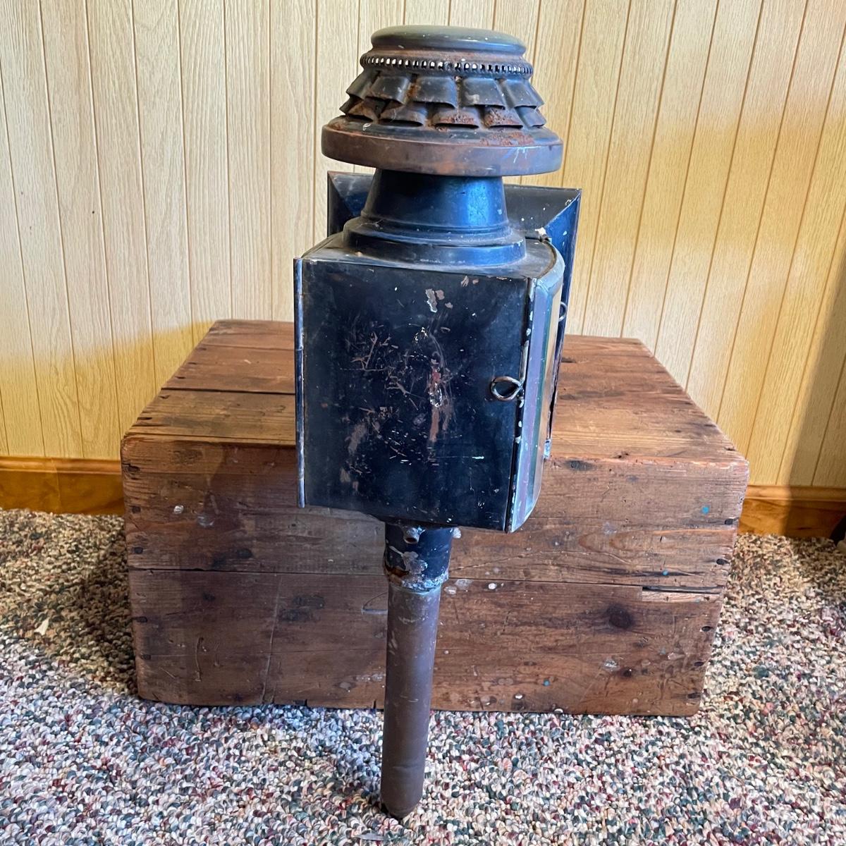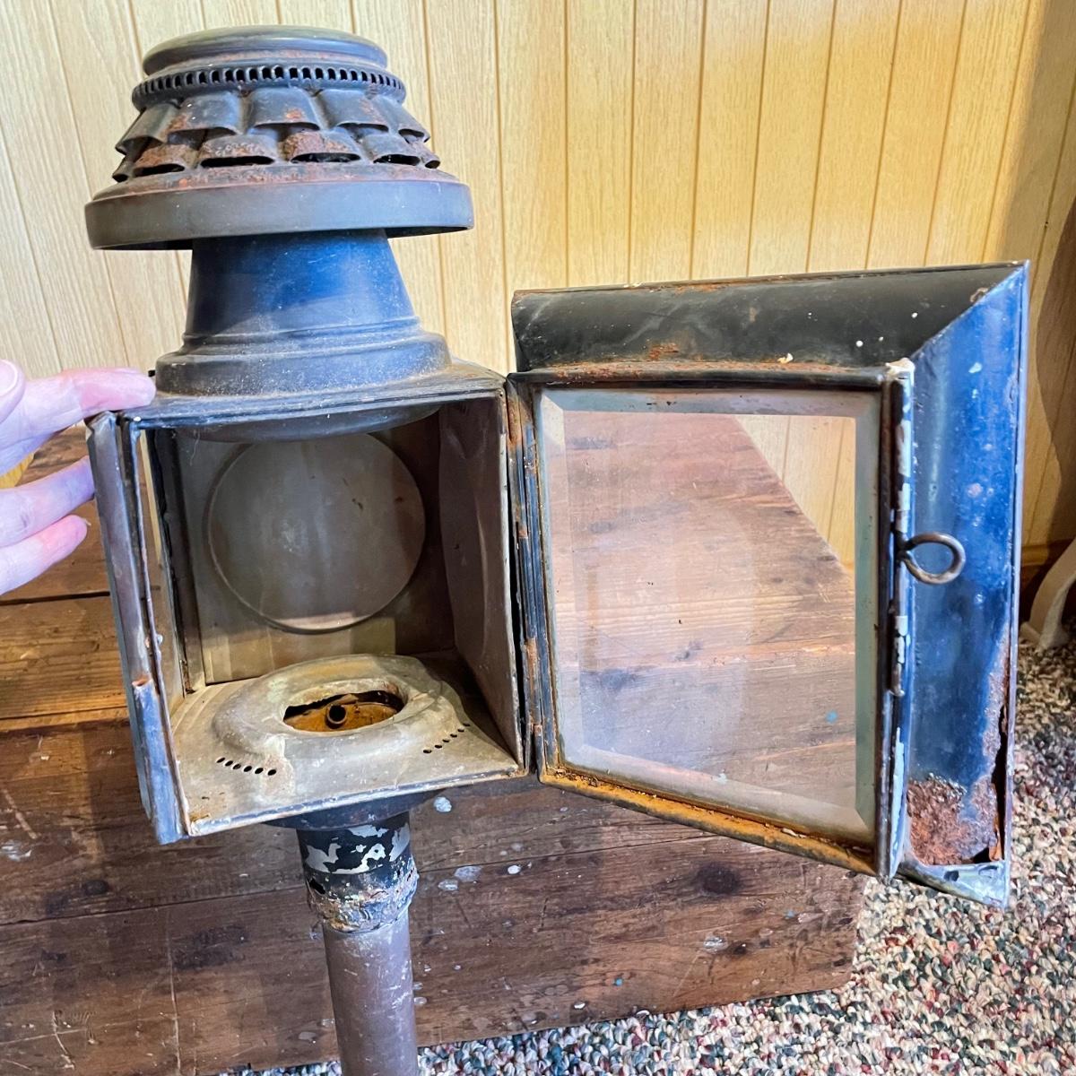 Vintage patented carriage lamp measures 7.5” x 8” x 23”. The lamp has operating doors for the front and back. The front has one beveled glass panel. There is minor rust throughout, but only the tail shows wear through the metal. See images. Shipping available.