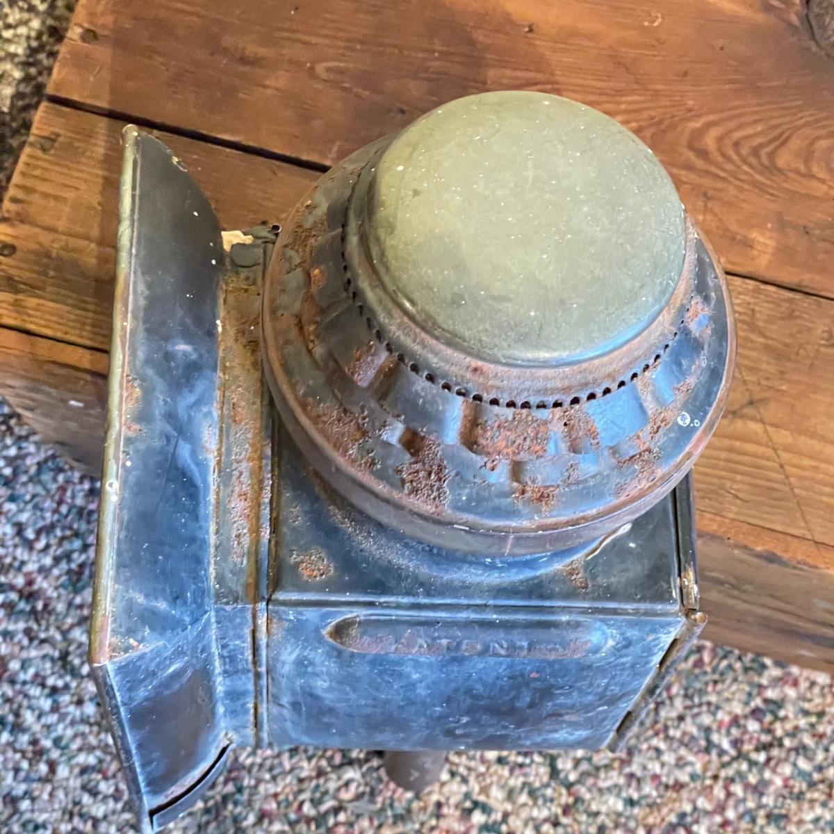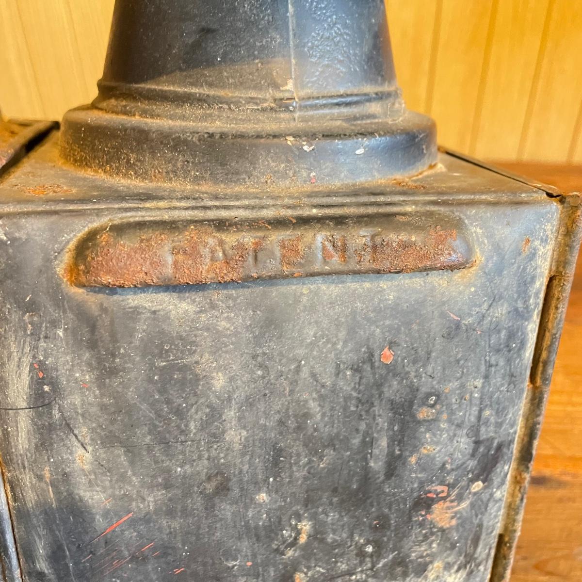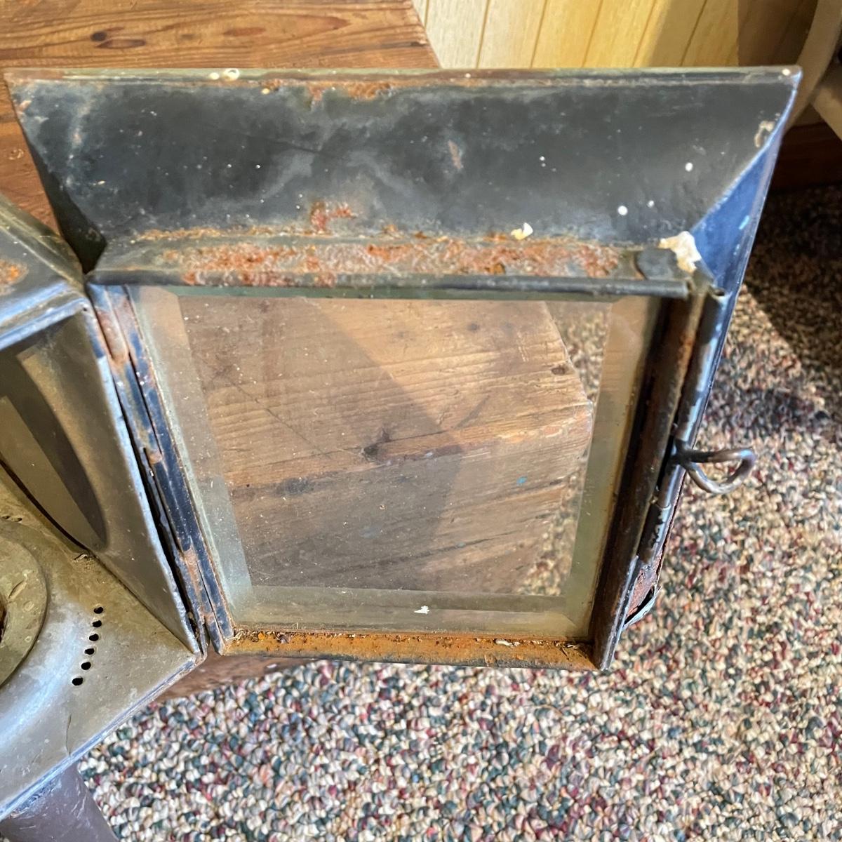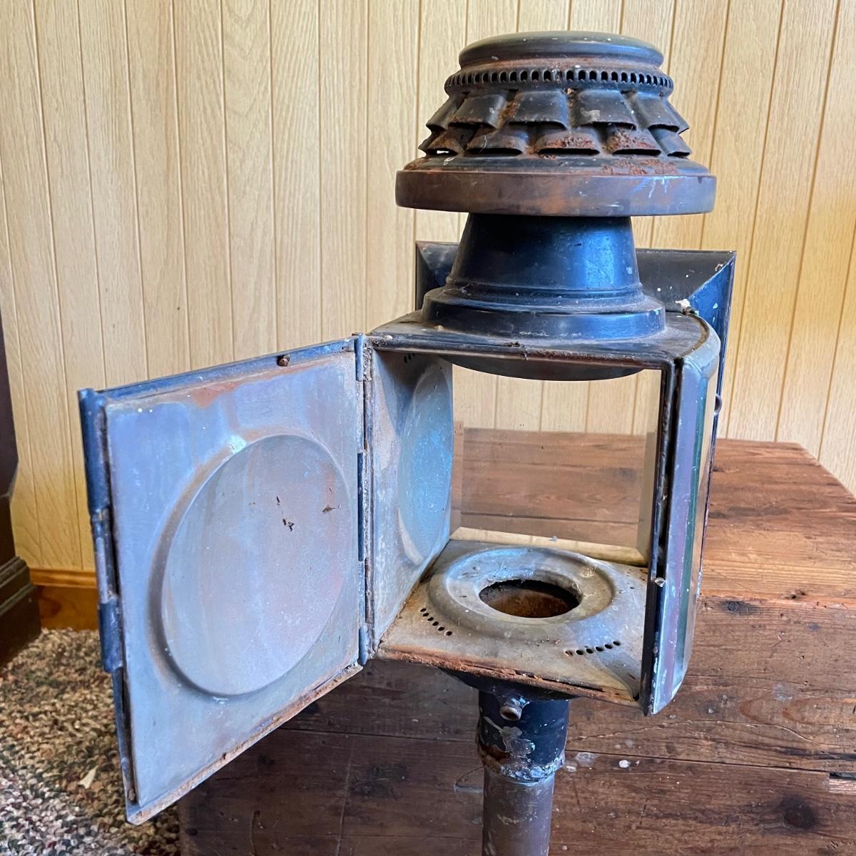 Vintage patented carriage lamp measures 7.5” x 8” x 23”. The lamp has operating doors for the front and back. The front has one beveled glass panel. There is minor rust throughout, but only the tail shows wear through the metal. See images. Shipping available.