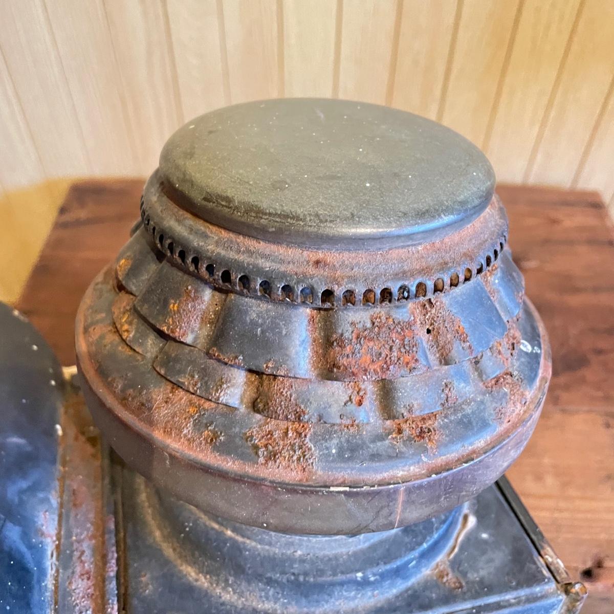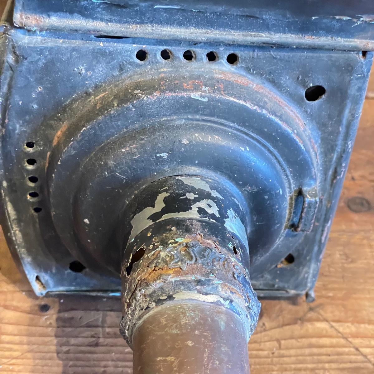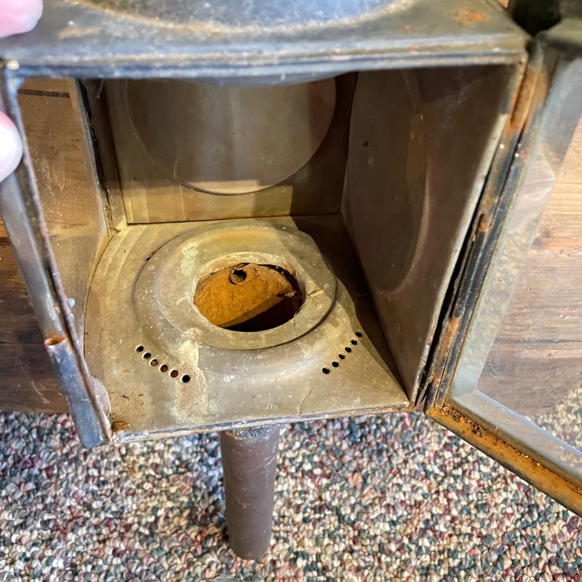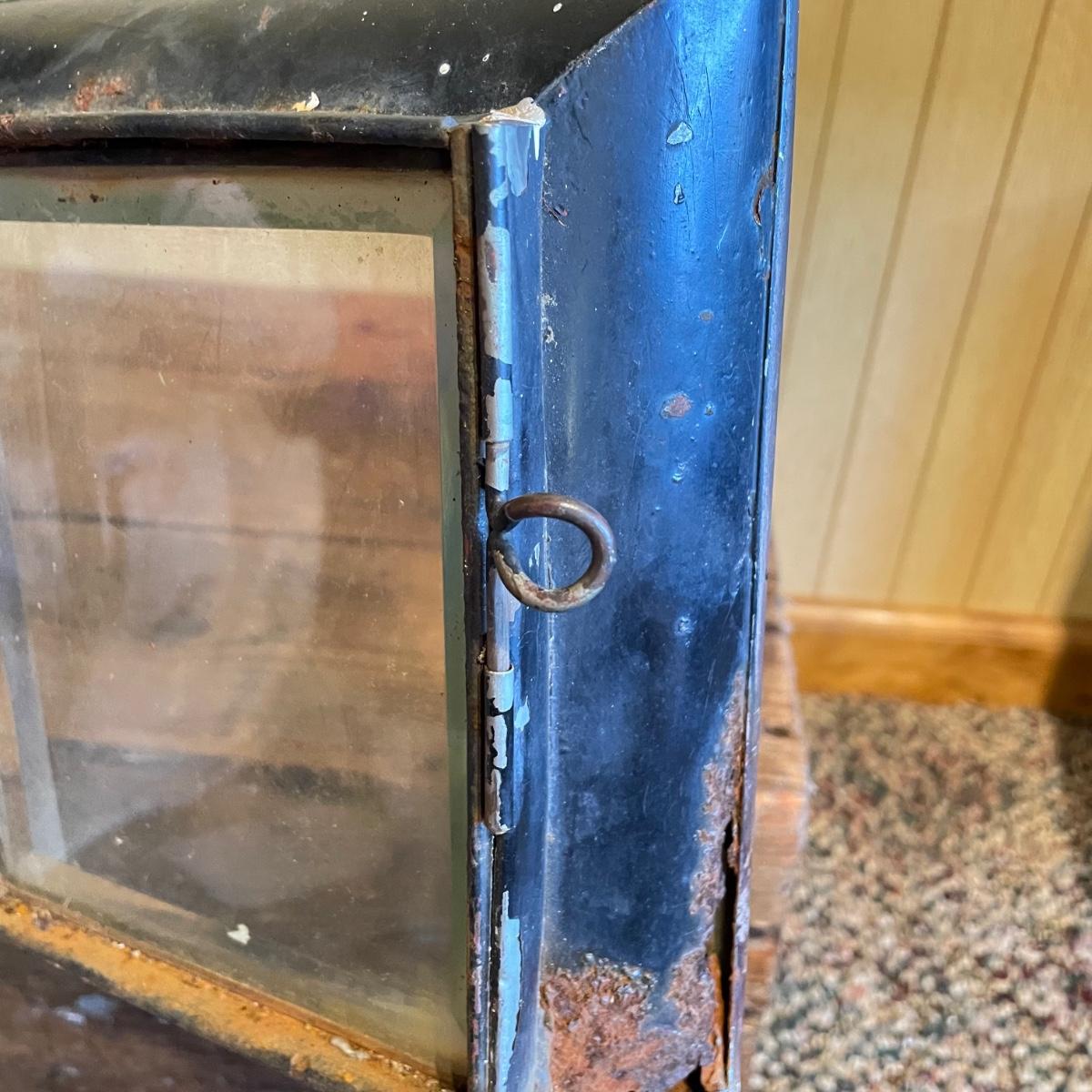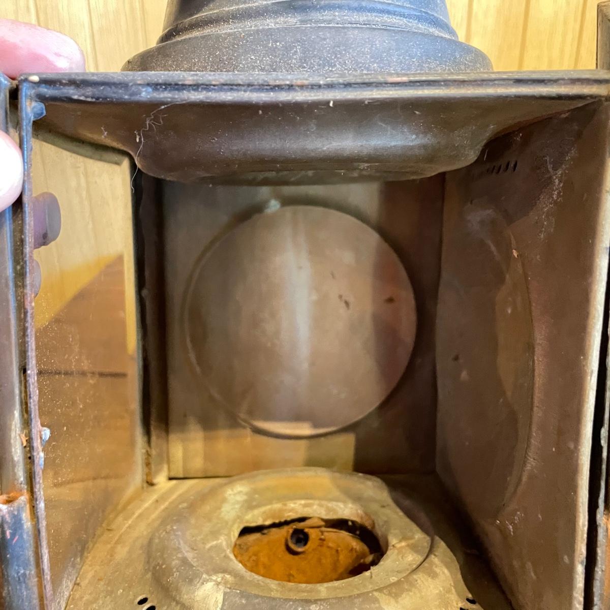 Vintage patented carriage lamp measures 7.5” x 8” x 23”. The lamp has operating doors for the front and back. The front has one beveled glass panel. There is minor rust throughout, but only the tail shows wear through the metal. See images. Shipping available.