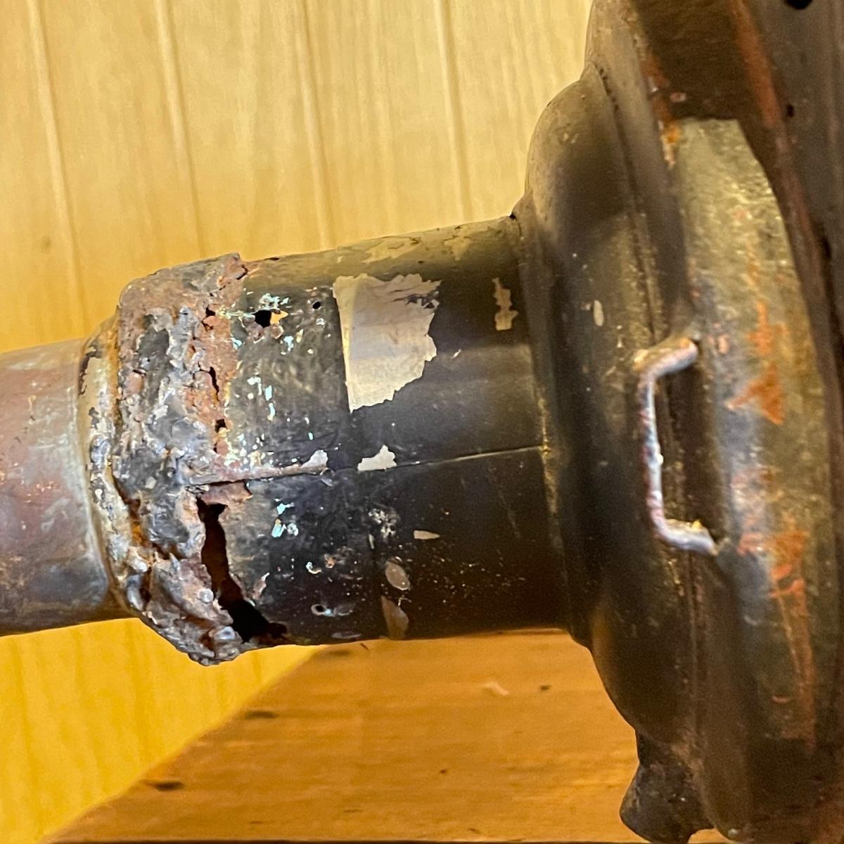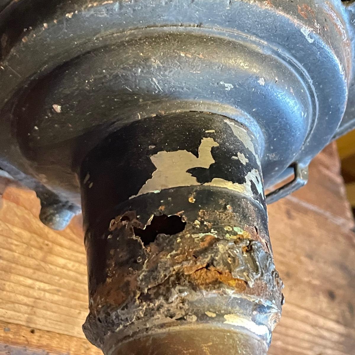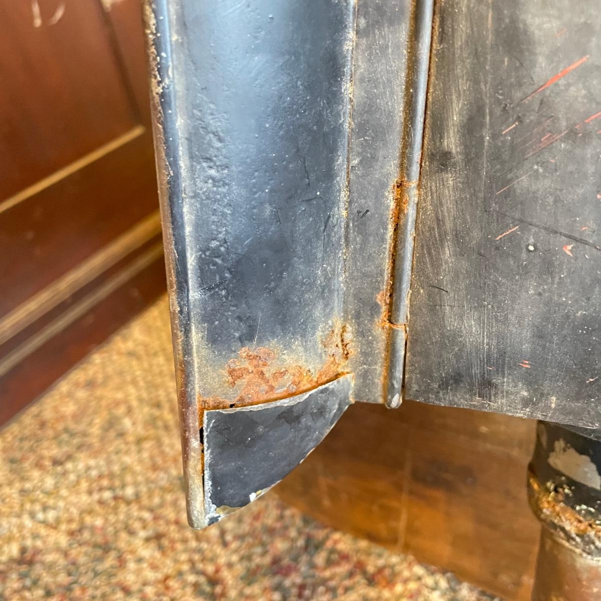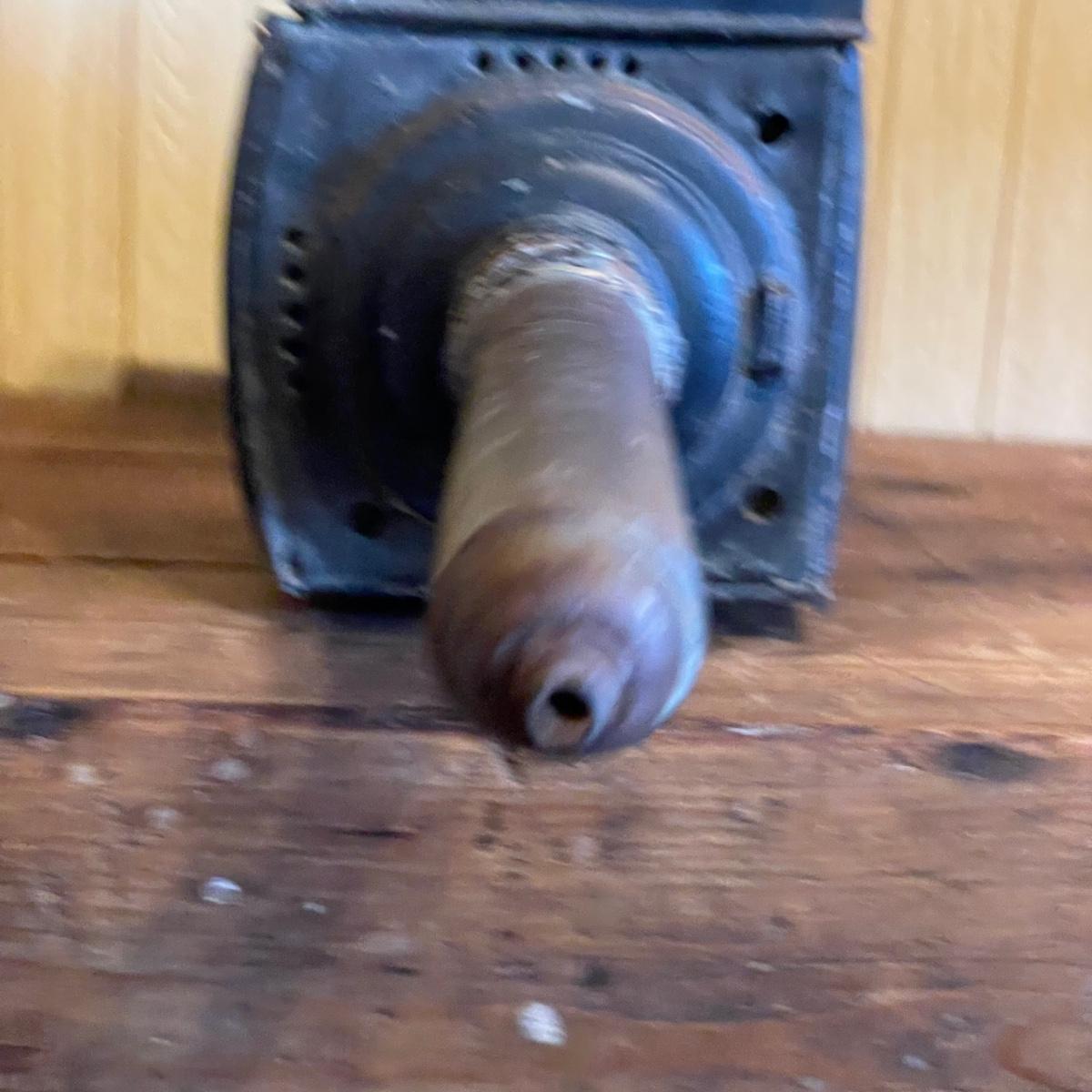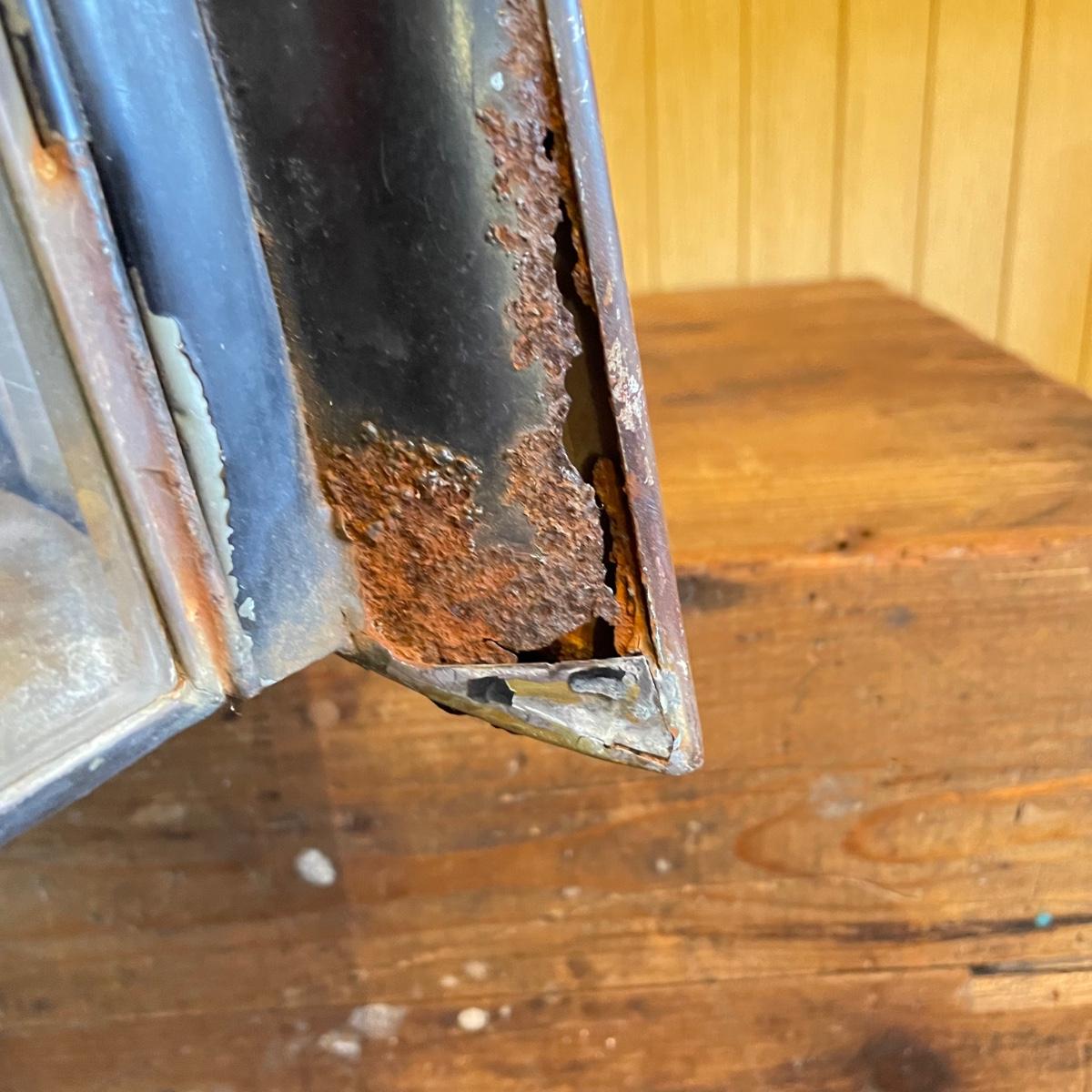 Vintage patented carriage lamp measures 7.5” x 8” x 23”. The lamp has operating doors for the front and back. The front has one beveled glass panel. There is minor rust throughout, but only the tail shows wear through the metal. See images. Shipping available.