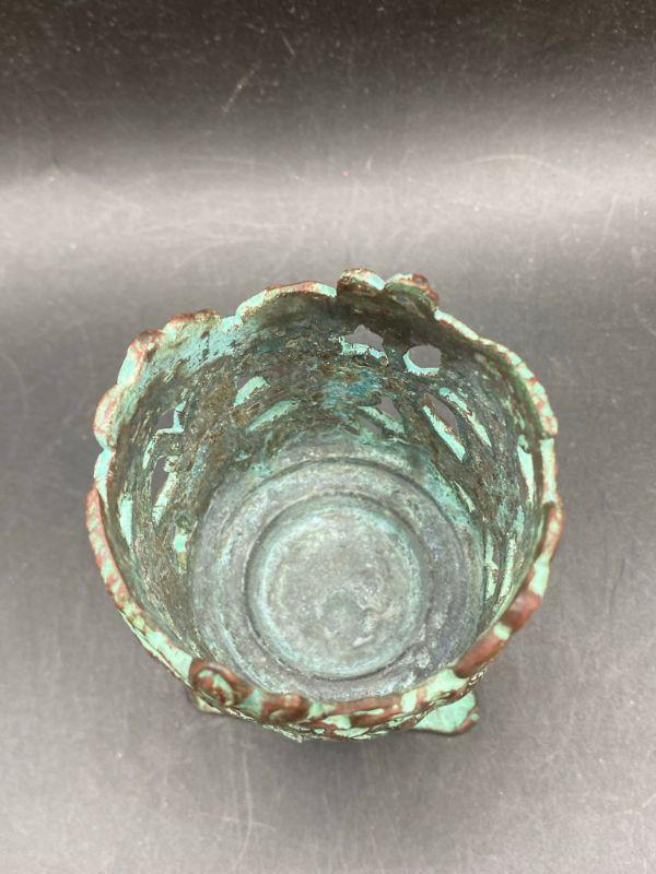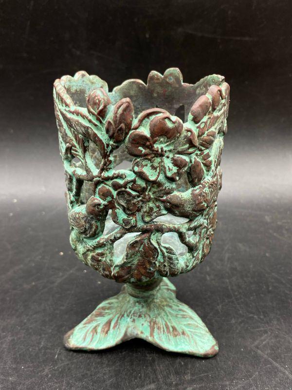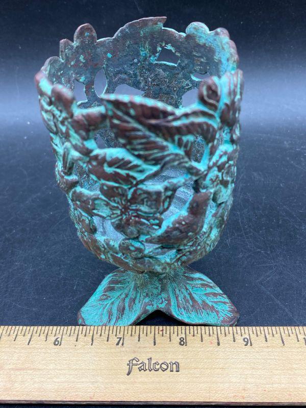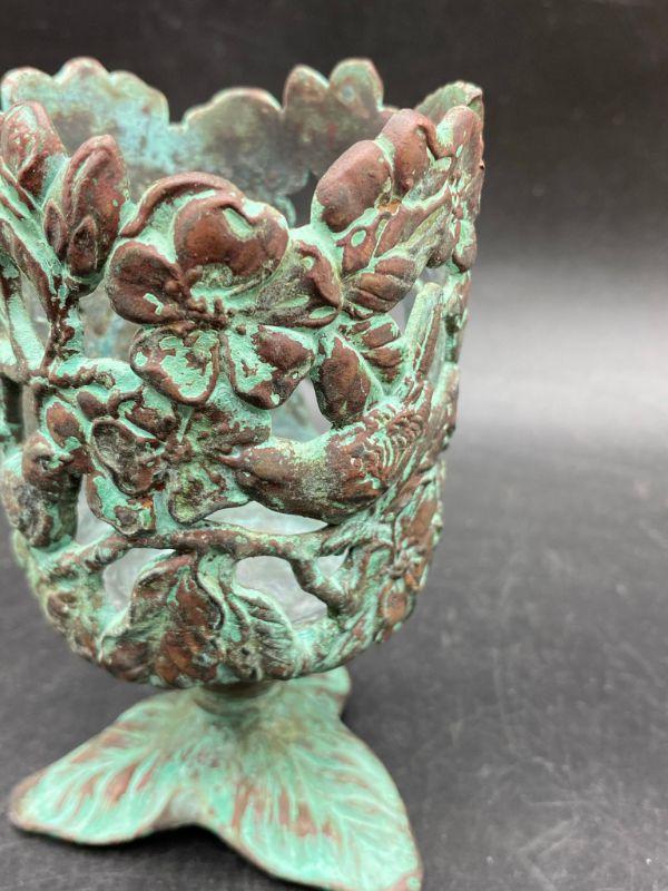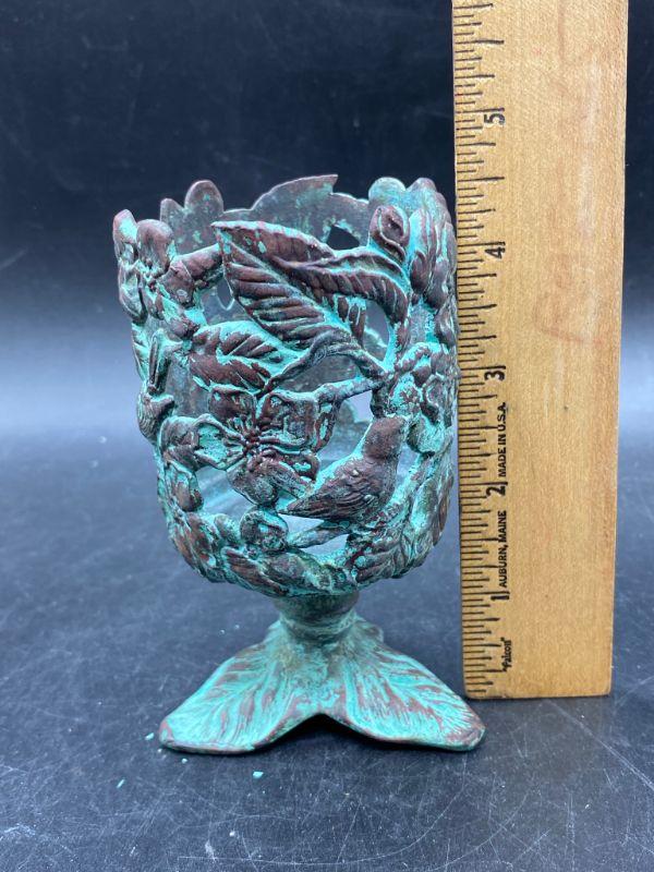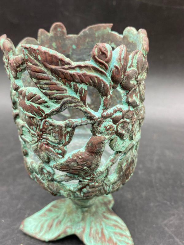 Flowers & birds metal candle holder. Green patina on copper, maybe bronze. Heavy for the size, about 4.5" tall. Fits votive size candles.