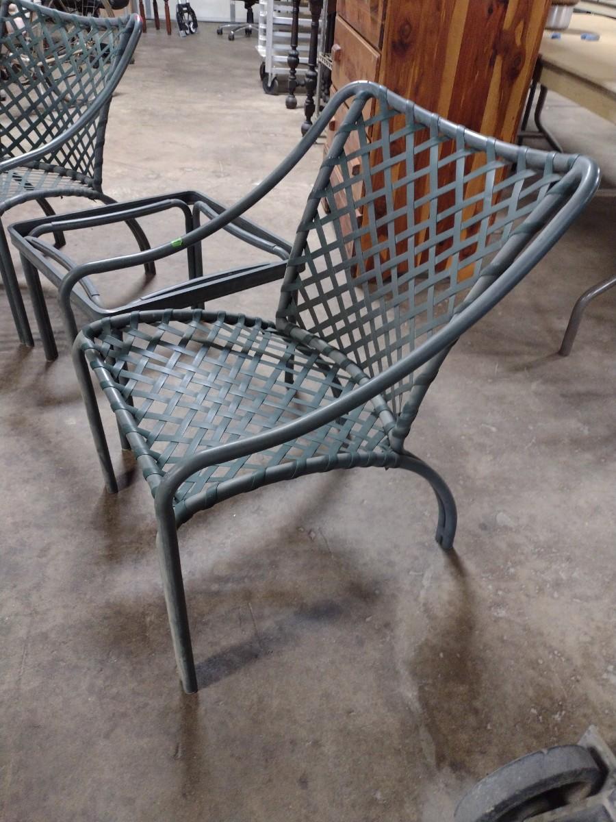 Metal Frame Patio Chair and Table Set webbing is vinyl straps. Table has no glass top