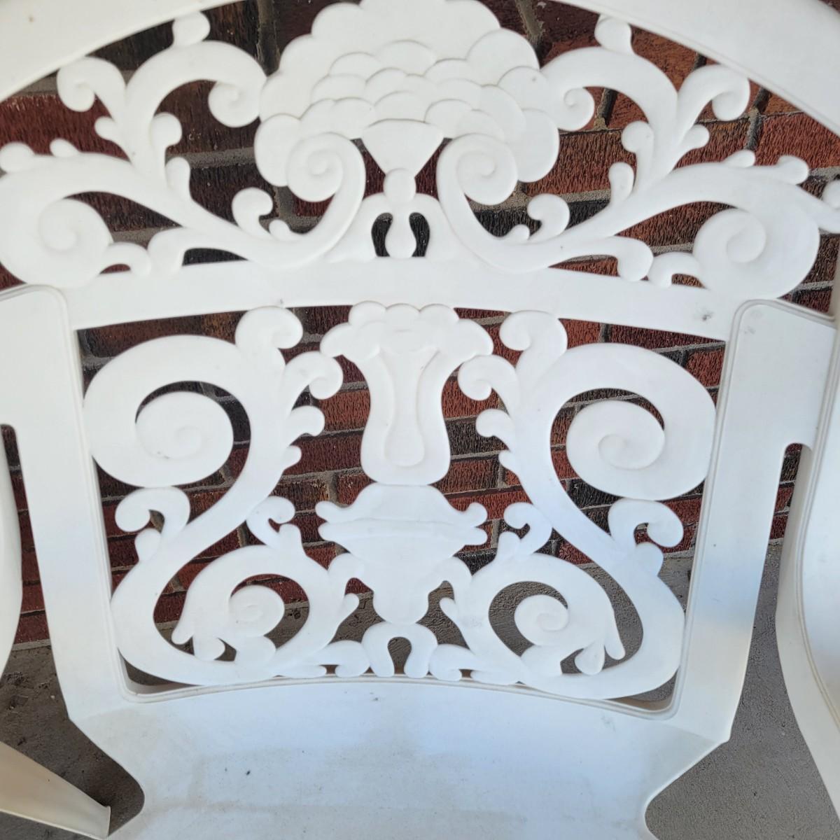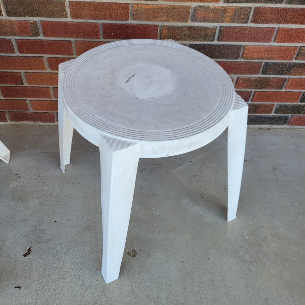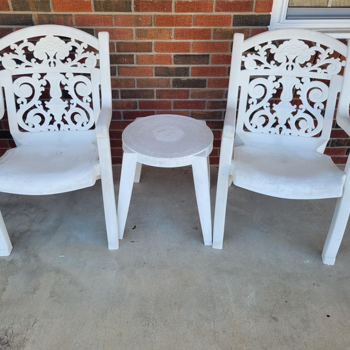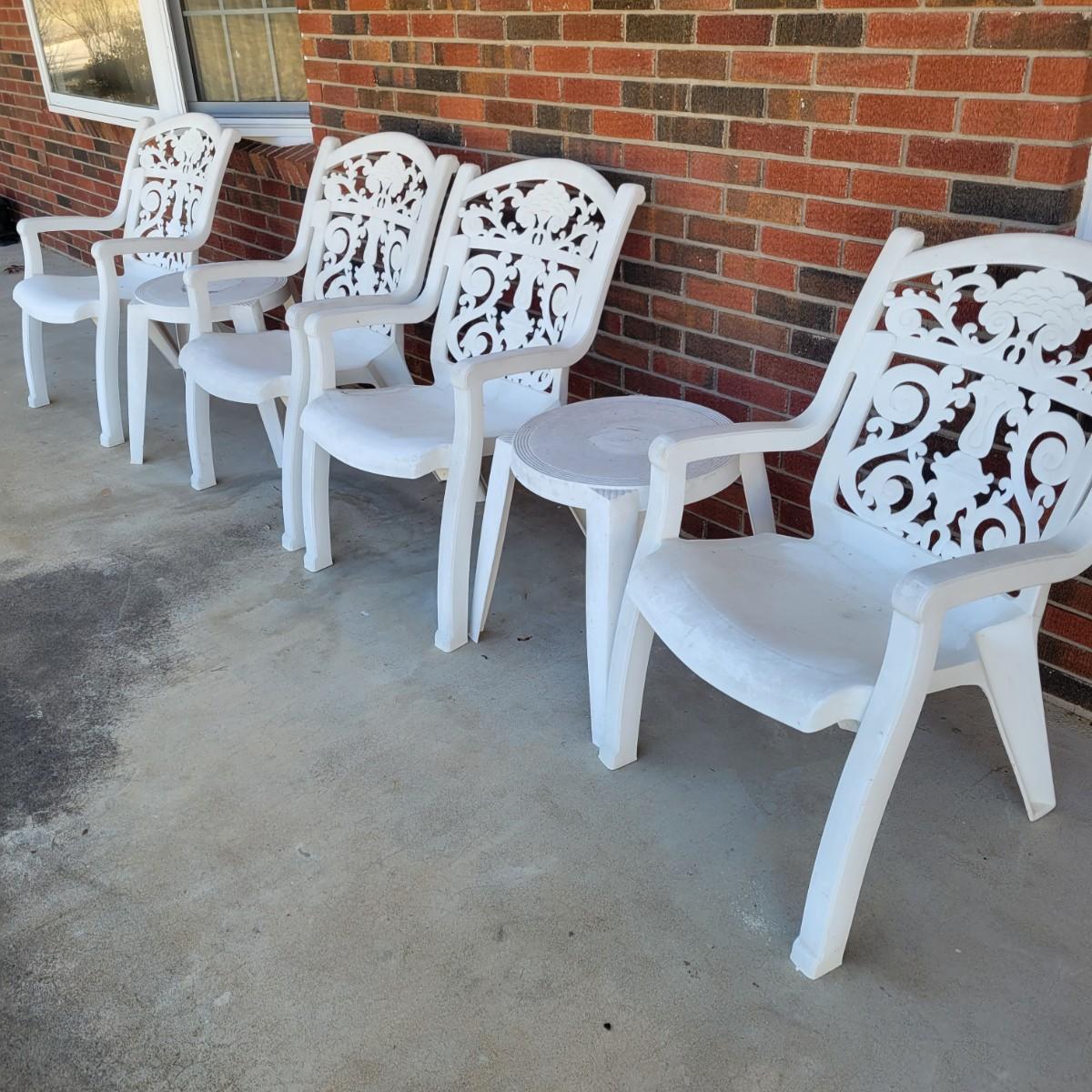 Four chairs and two side tables in good condition, but there is some staining from extended outdoor use. Included is four stackable plastic chairs that have decorative backs. Each chair measures approximately 23.5" x 23" x 36.5" with a seat height of 17.5". Also includes two matching side tables that are approximately 18"D x 20"H. Local pickup only