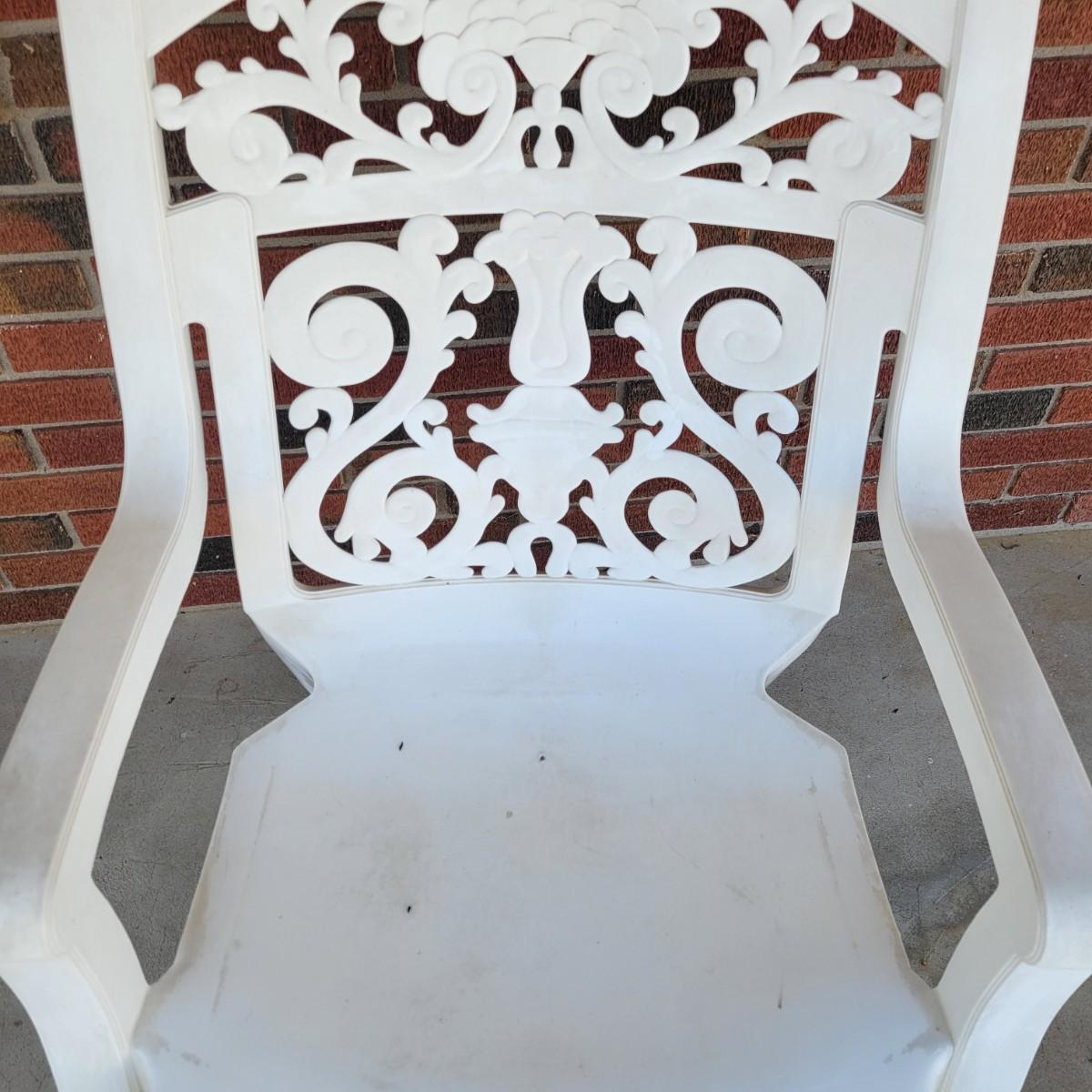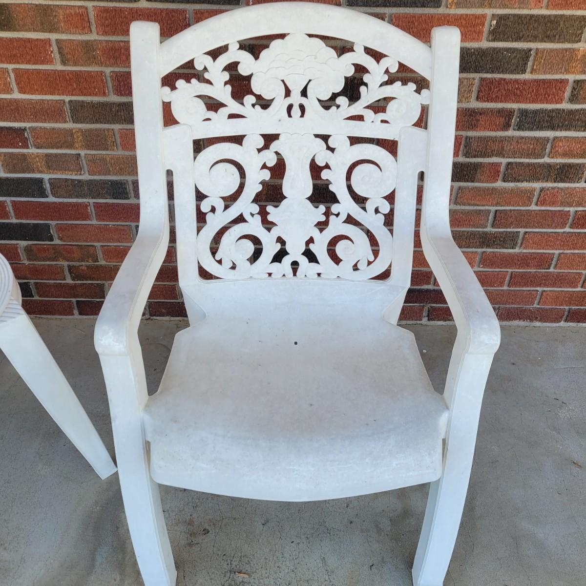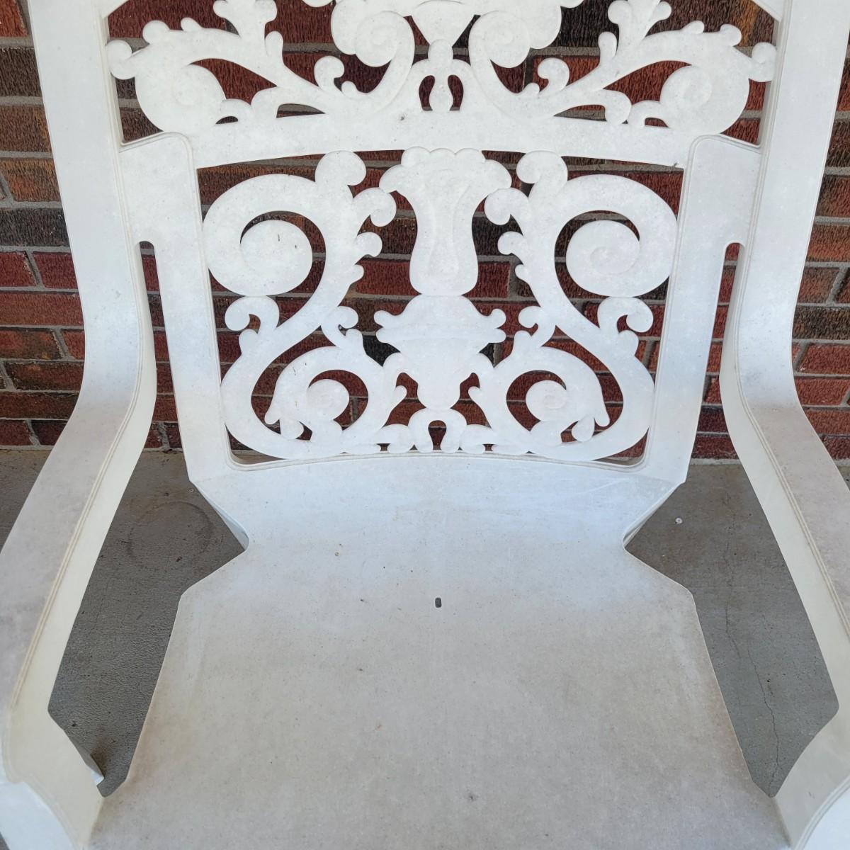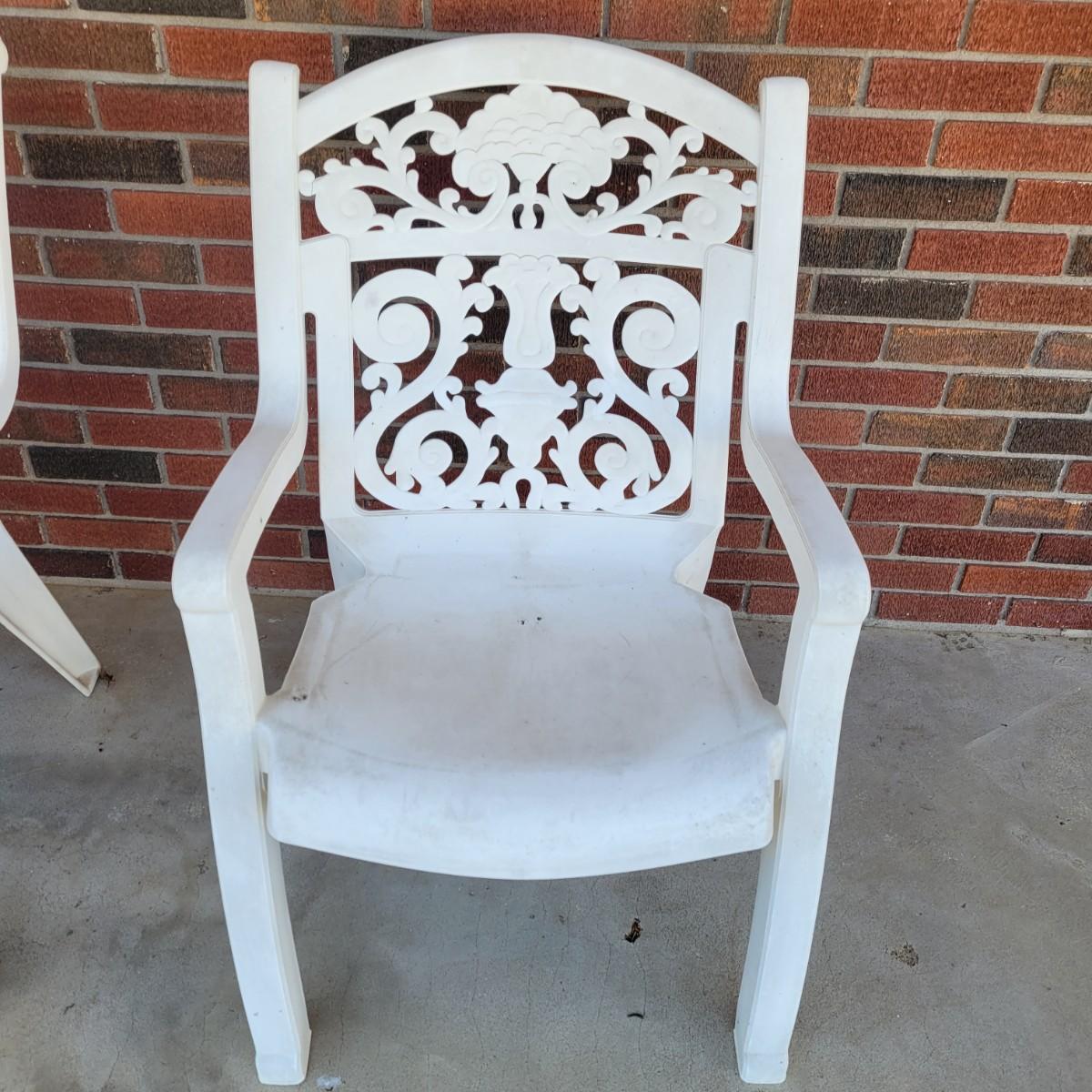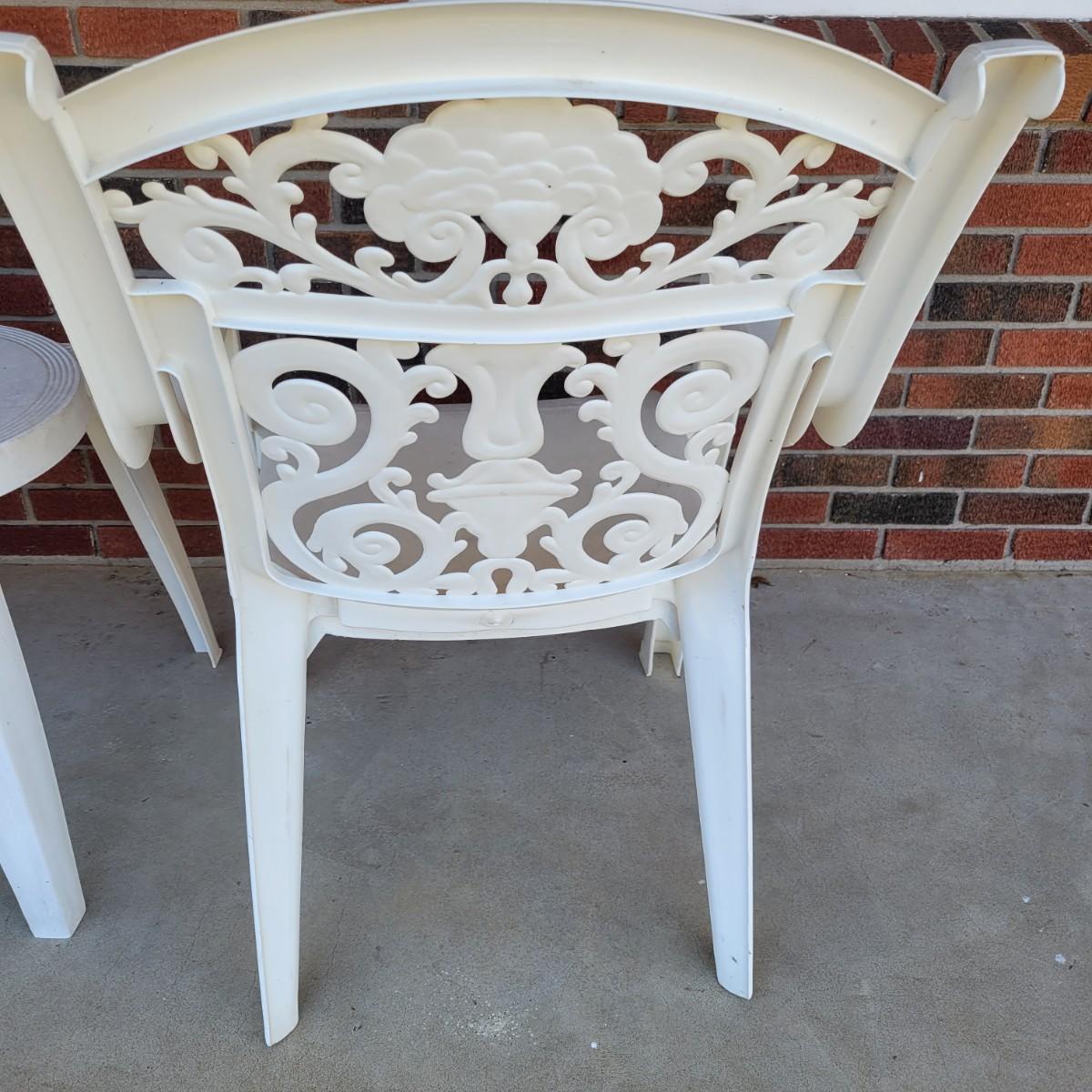 Four chairs and two side tables in good condition, but there is some staining from extended outdoor use. Included is four stackable plastic chairs that have decorative backs. Each chair measures approximately 23.5" x 23" x 36.5" with a seat height of 17.5". Also includes two matching side tables that are approximately 18"D x 20"H. Local pickup only