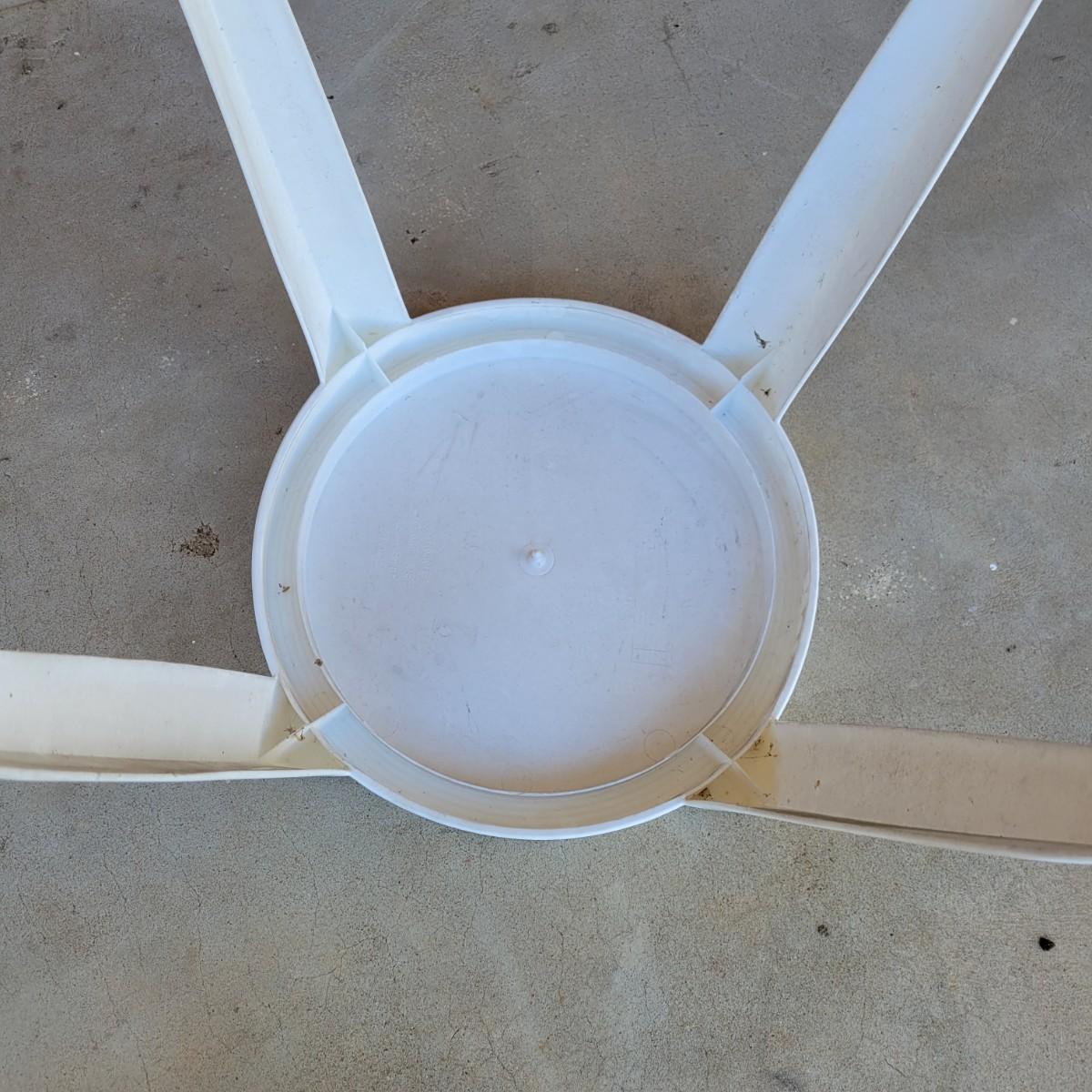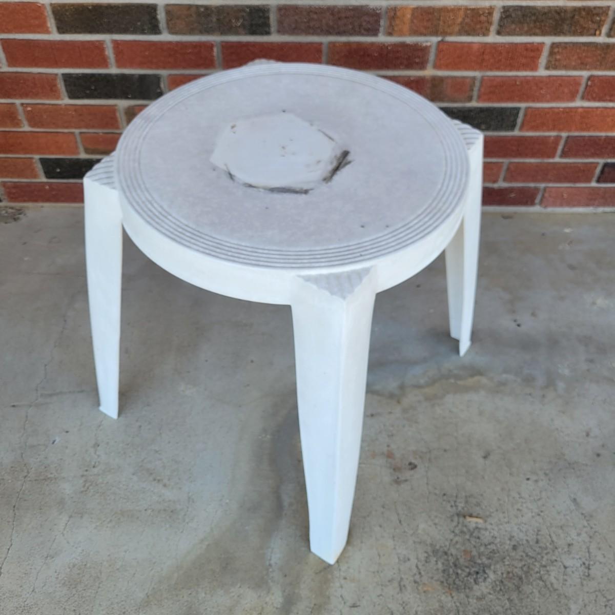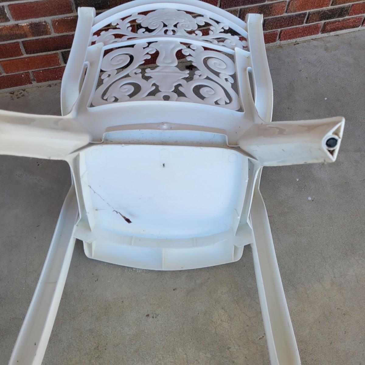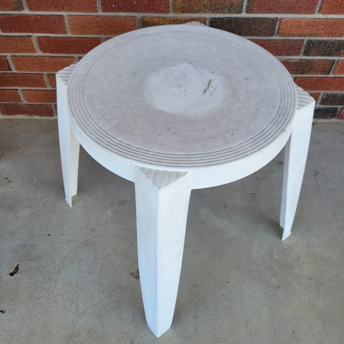 Four chairs and two side tables in good condition, but there is some staining from extended outdoor use. Included is four stackable plastic chairs that have decorative backs. Each chair measures approximately 23.5" x 23" x 36.5" with a seat height of 17.5". Also includes two matching side tables that are approximately 18"D x 20"H. Local pickup only