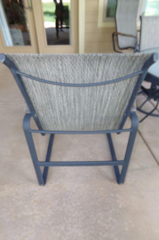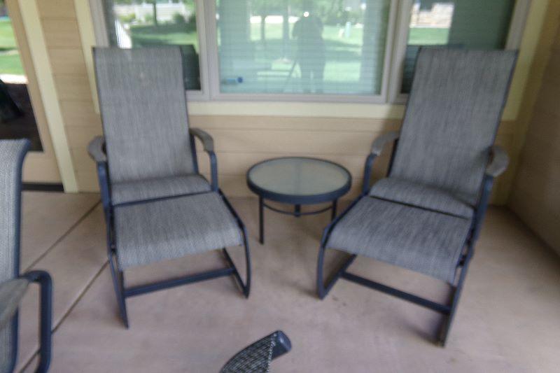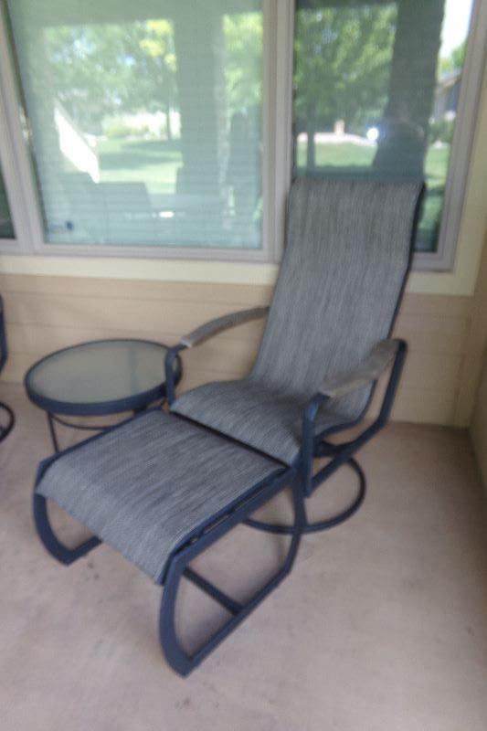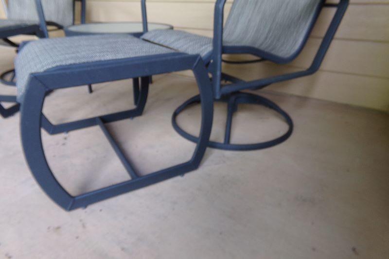 Metal framed, Chairs rock and swivel with matching ottomans. One glass top side table. All in very good condition with no rips or tears.