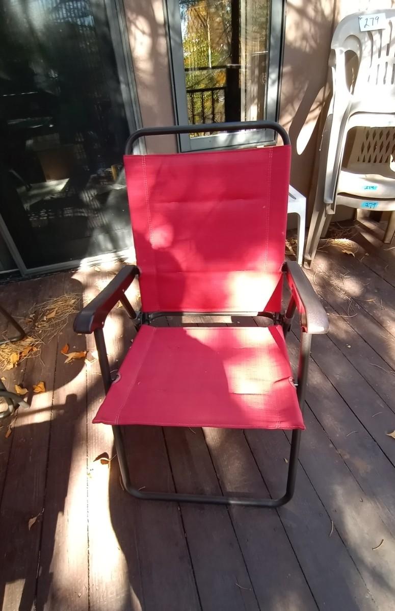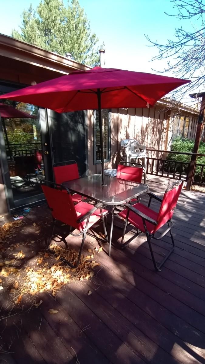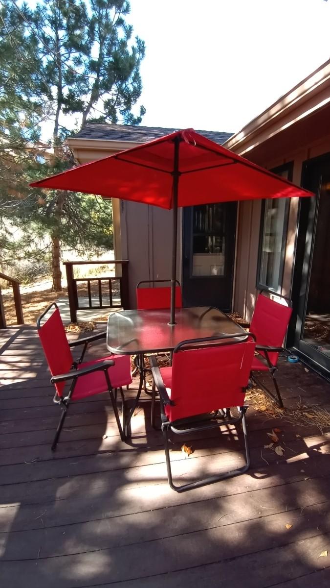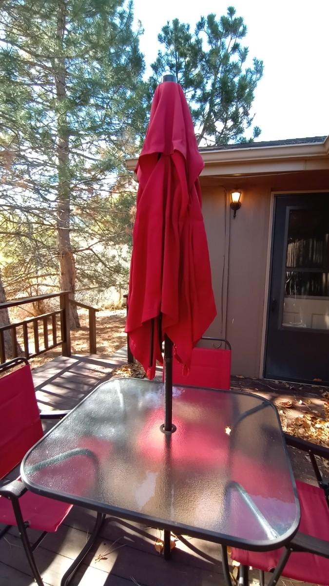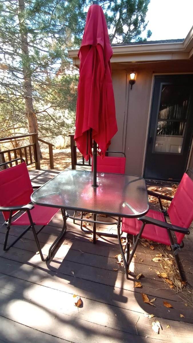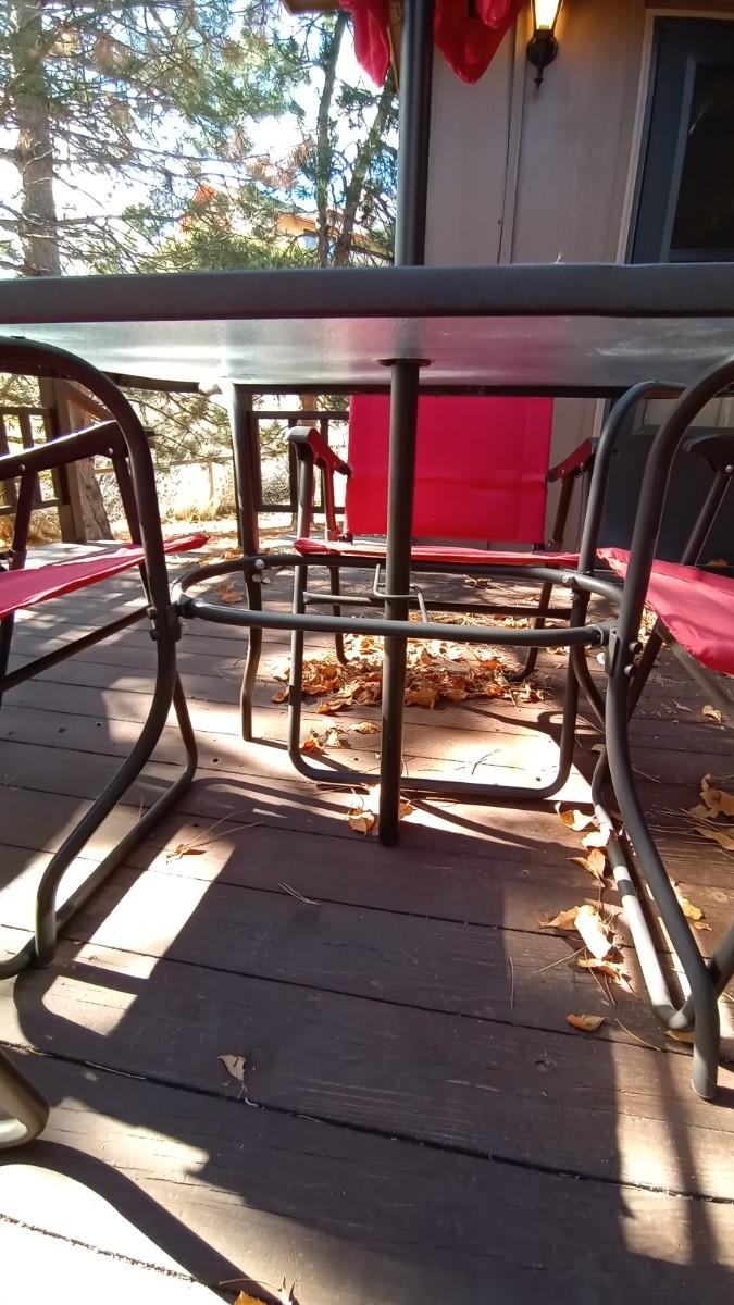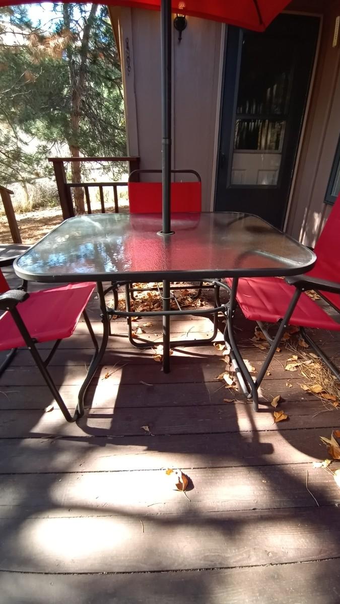 FROSTED GLASS PATIO TABLE MEASURES APPROX. 27X31X38 -UMBRELLA-FOUR FOLDING CHAIRS IN GOOD CONDITION