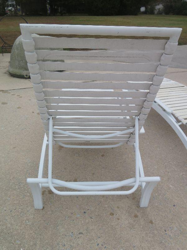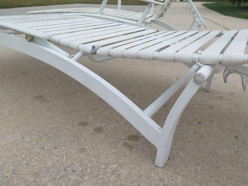 Two outside lounge chairs. Backs recline and arms can be up or down. Some rust. Please review all photos and read Terms and Conditions before placing a bid. Pick up is Wednesday, November 20 from 4-7pm and Saturday, November 23 from 9am-2pm in Mantua, New Jersey. All sales are final. All sales are as is, where is. Please bring all boxes, tools, and muscle needed to remove your items. Any photo props are not included. All measurements are approximate. Items come from dog-friendly home.