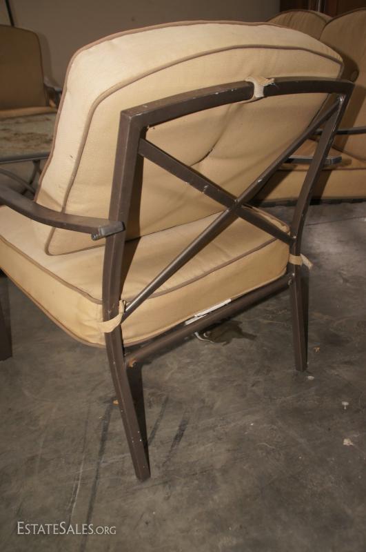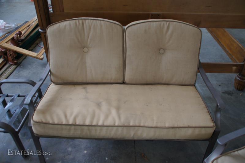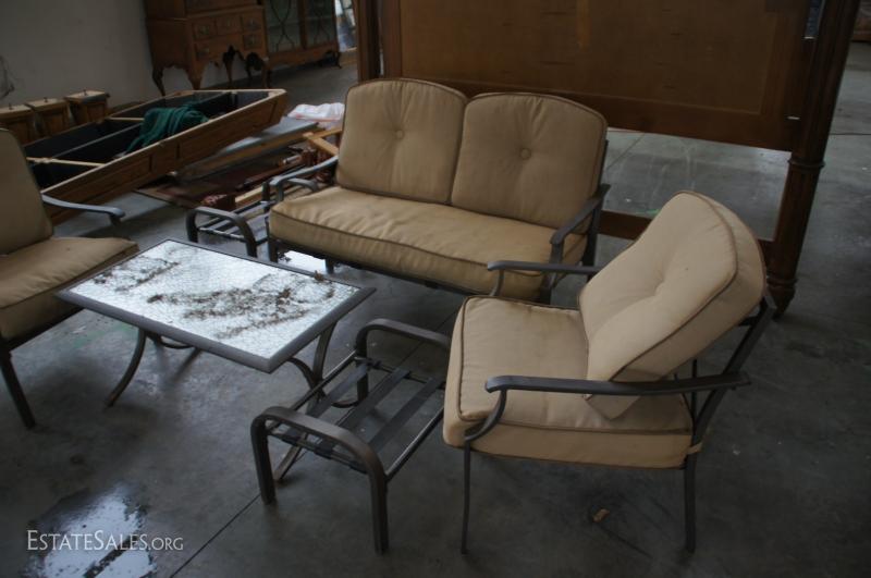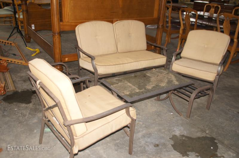 Patio furniture set with armchairs, table with glass top and settee, 6 pieces all together