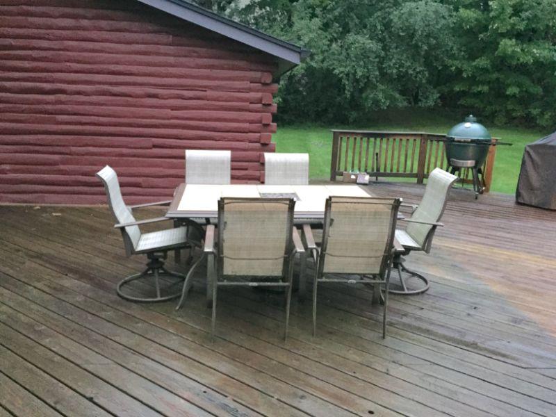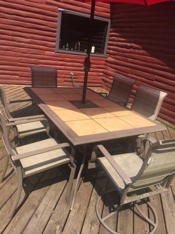 NOW ON SALE - TAKE 25% OFF LISTED PRICE! Patio Set with Tile Top. Sells with (5) Chairs, (one chair was removed due to damage)