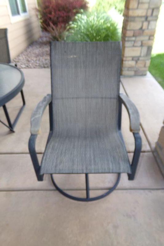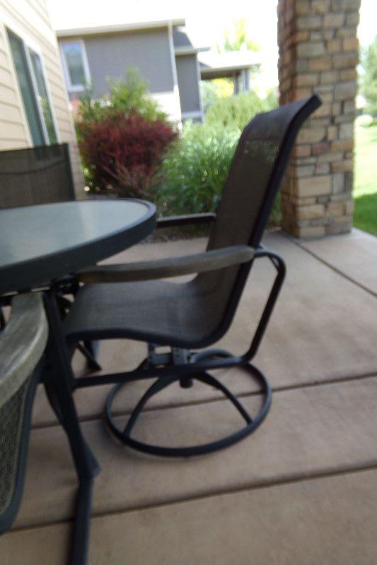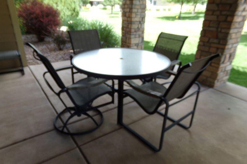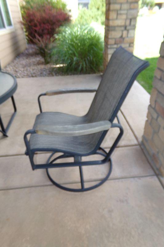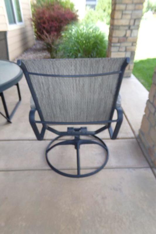 Metal framed. Table measures 49" round and has a place for an umbrella.. Two chairs are swivel rockers with round base, the other 2 are standard armchairs. They all match and are In very good condition.