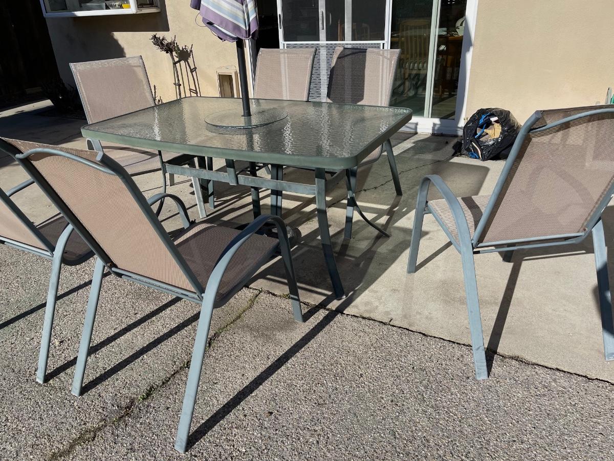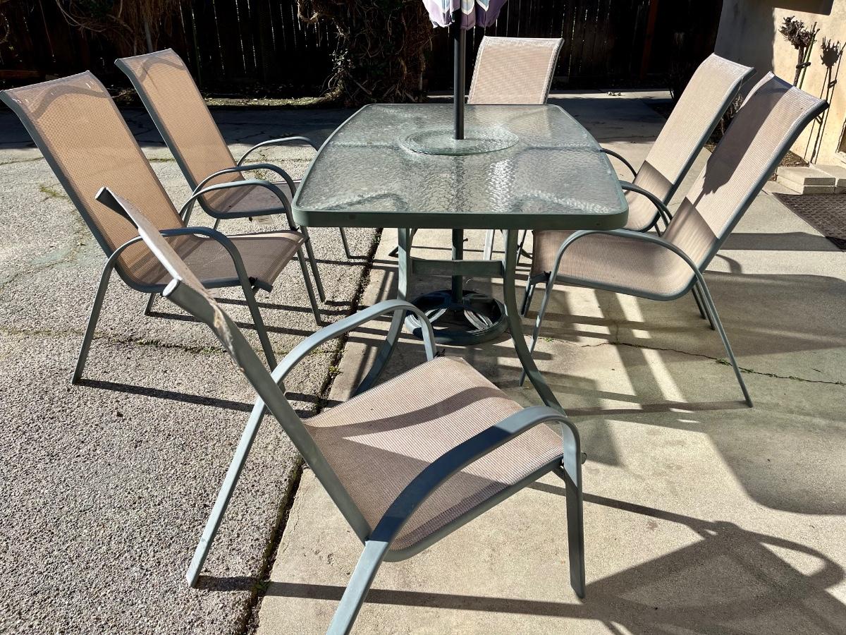 Metal and glass table with hole for umbrella (umbrella is not included). 6 chairs of fabric and metal. All in good condition.