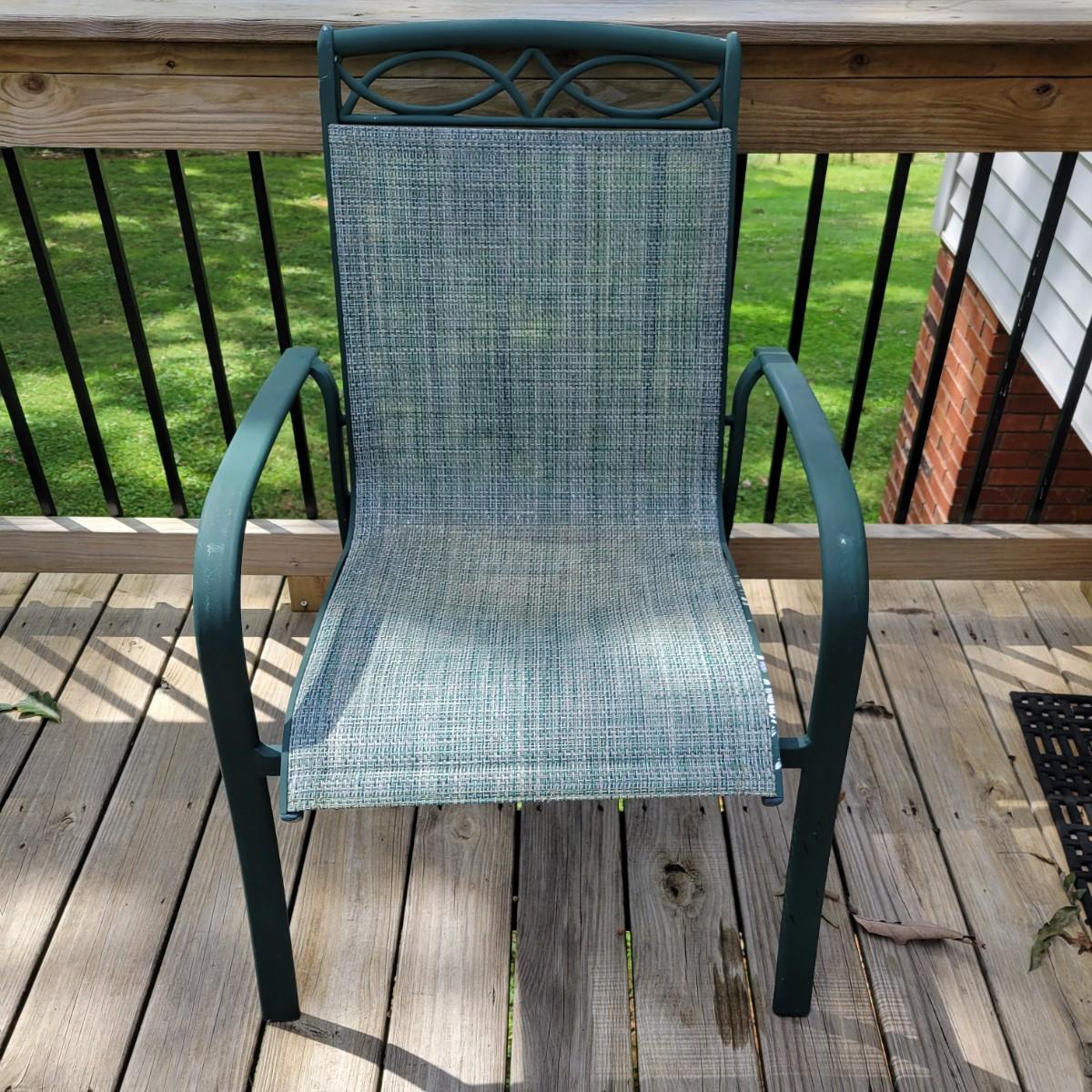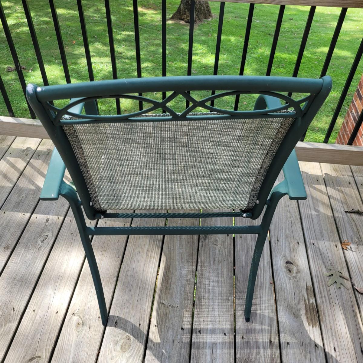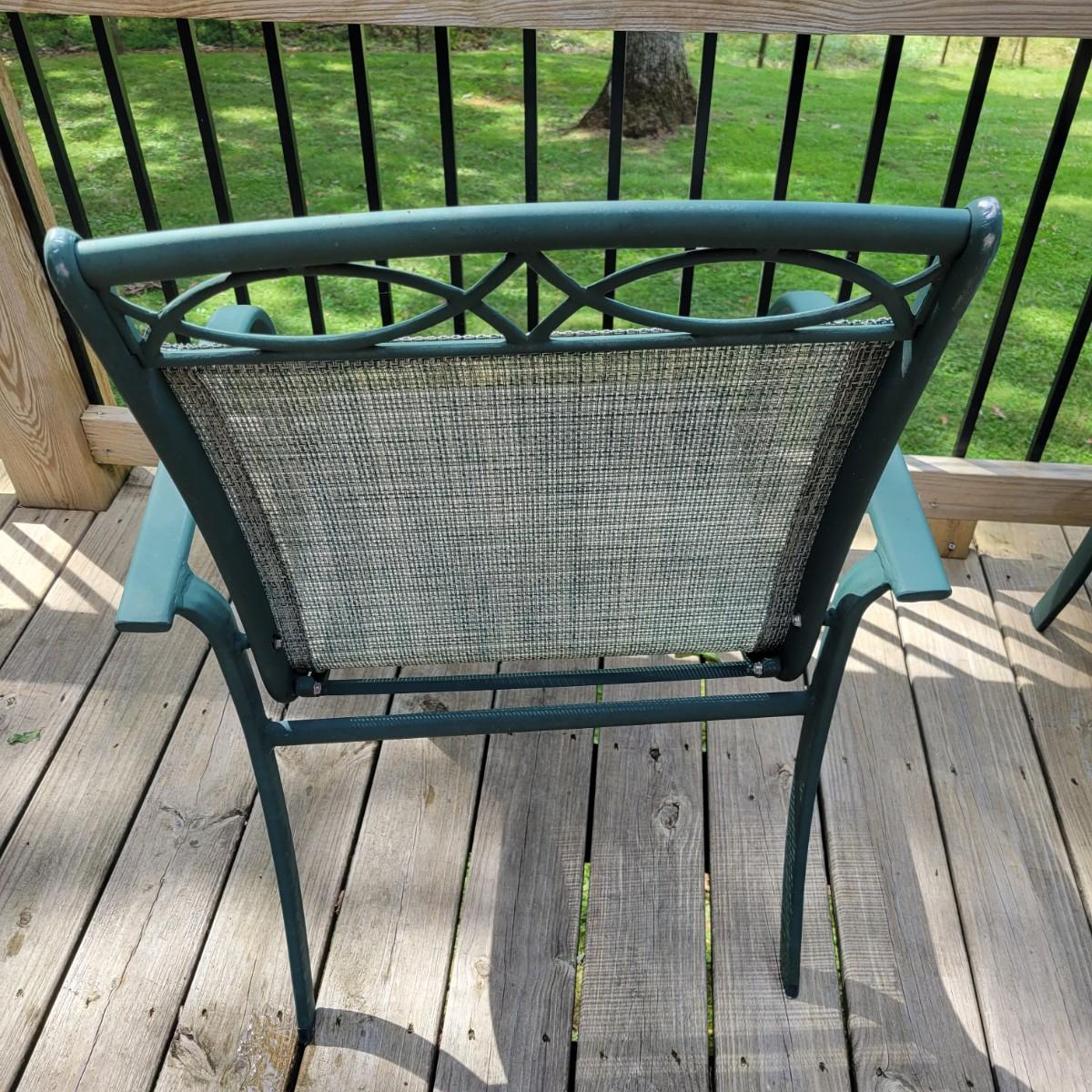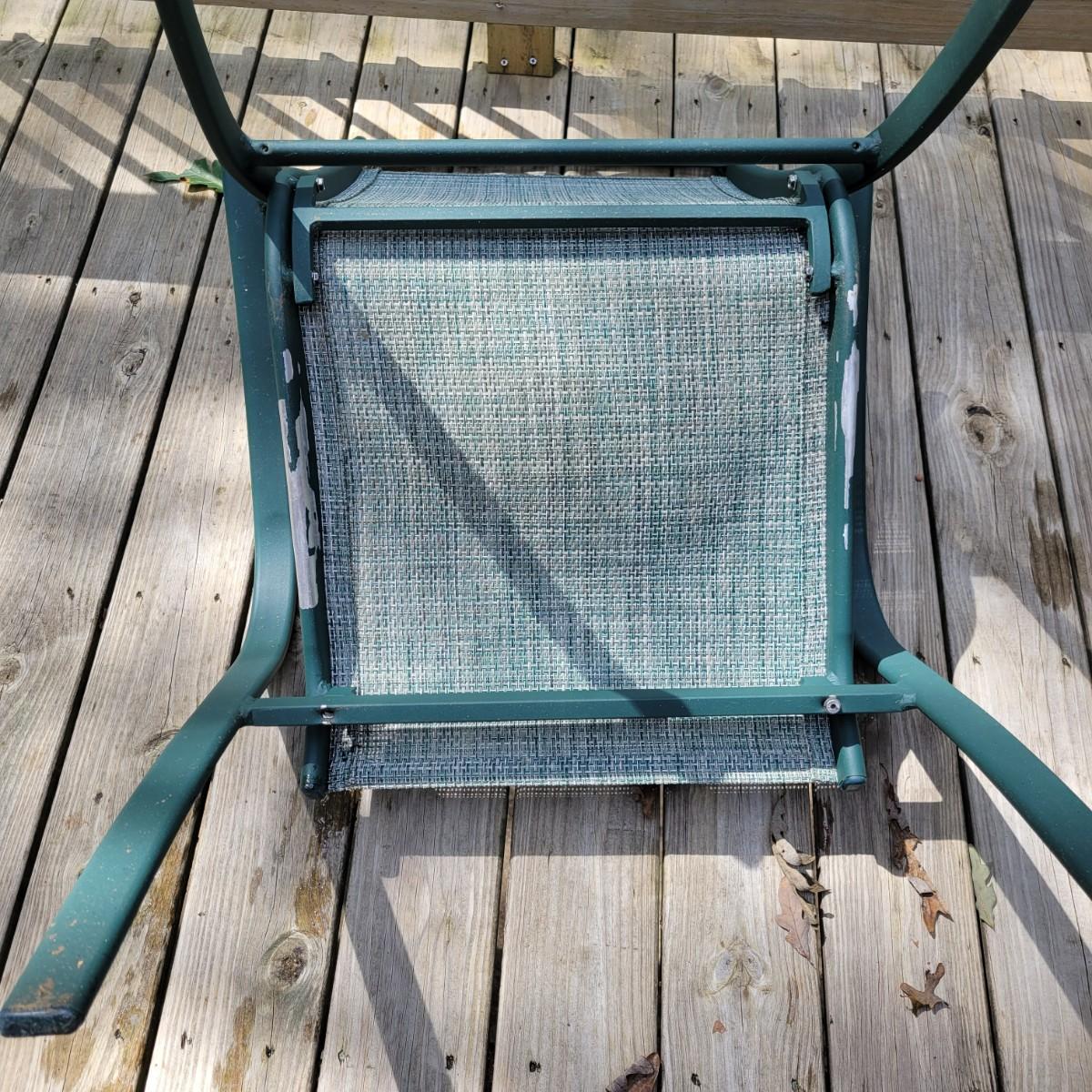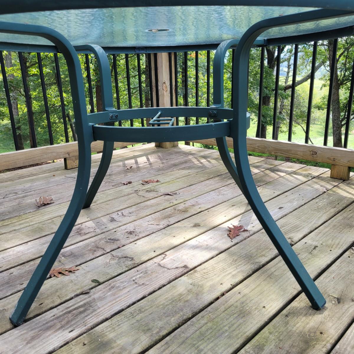 A round, glass topped patio table with matching chairs. The table measures approximately 48.5"D x 28.5"H and has a tempered glass top with a hole for an umbrella. The frame is made of aluminum and is painted green. Also included are four matching chairs, also made of aluminum that have fabric seats. They measure approximately 25.5" x 23" x 37.5"H with a seat height of 17". The chairs have some notable cosmetic scratches and blemishes, please see attached pictures for more detail. Local pickup only