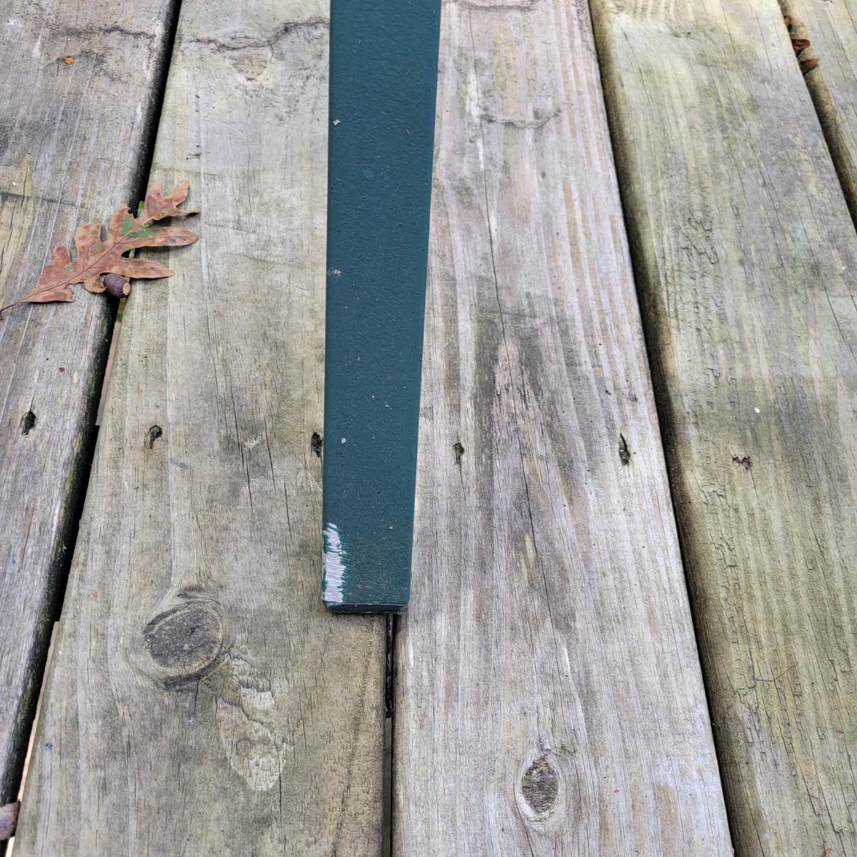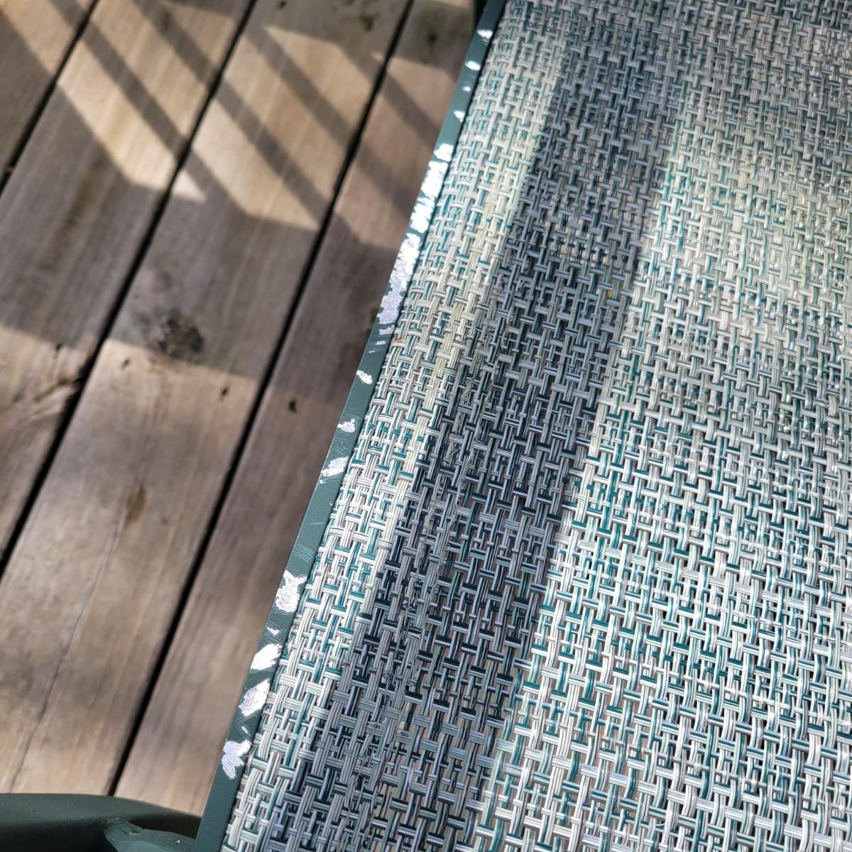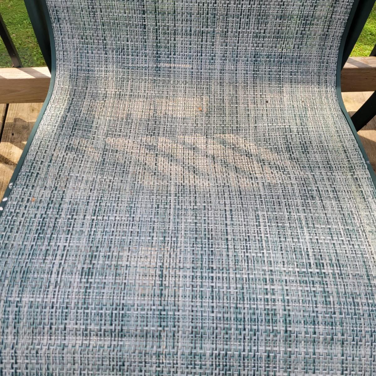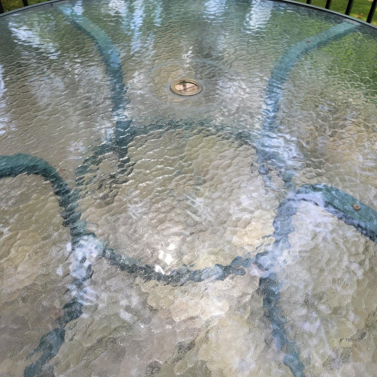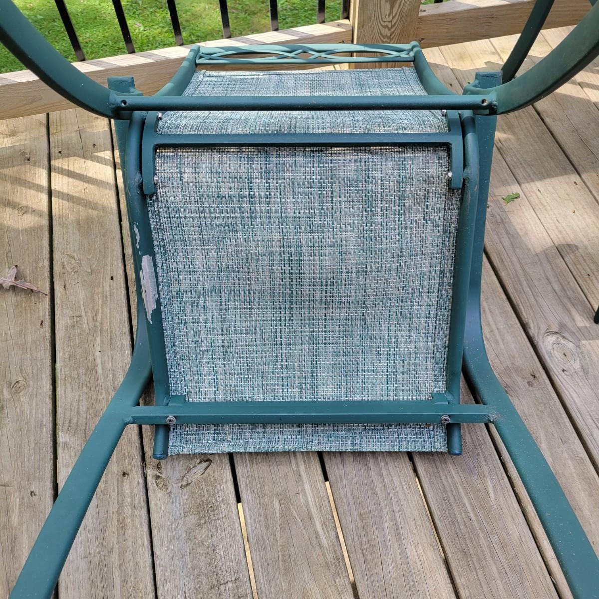 A round, glass topped patio table with matching chairs. The table measures approximately 48.5"D x 28.5"H and has a tempered glass top with a hole for an umbrella. The frame is made of aluminum and is painted green. Also included are four matching chairs, also made of aluminum that have fabric seats. They measure approximately 25.5" x 23" x 37.5"H with a seat height of 17". The chairs have some notable cosmetic scratches and blemishes, please see attached pictures for more detail. Local pickup only