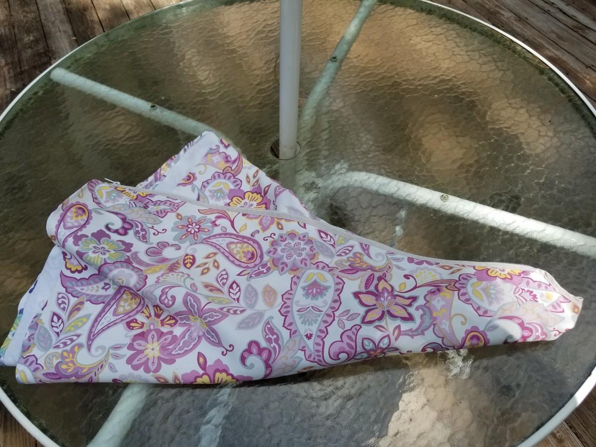 Glass top patio table with custom made zippered table cloth 47" diameter x 27" tall with umbrella and base