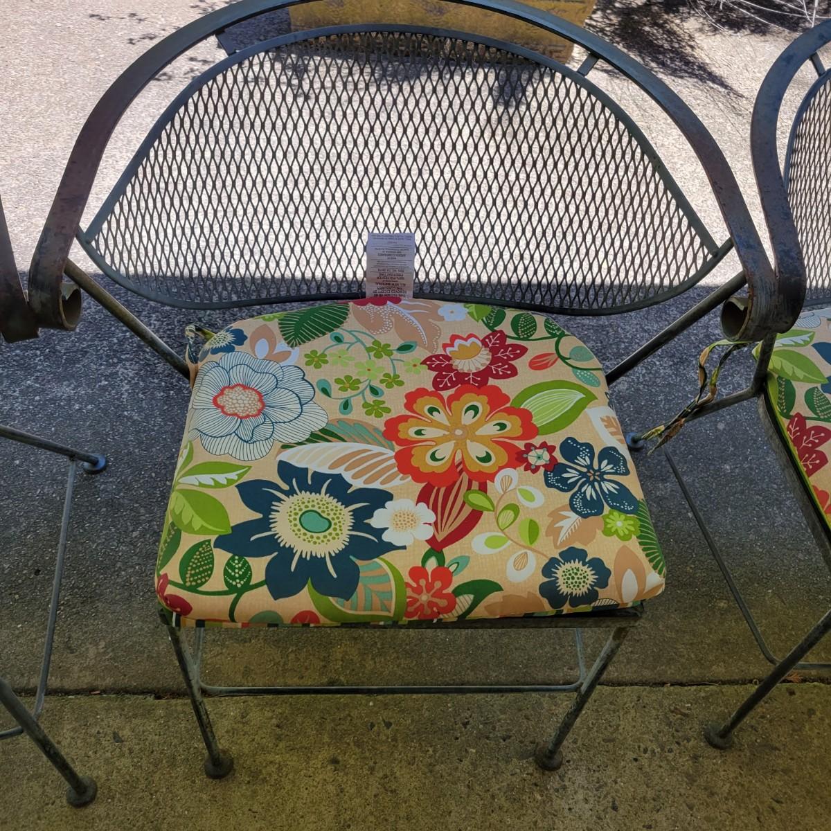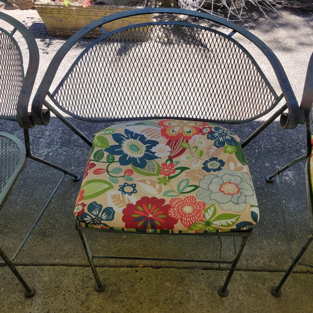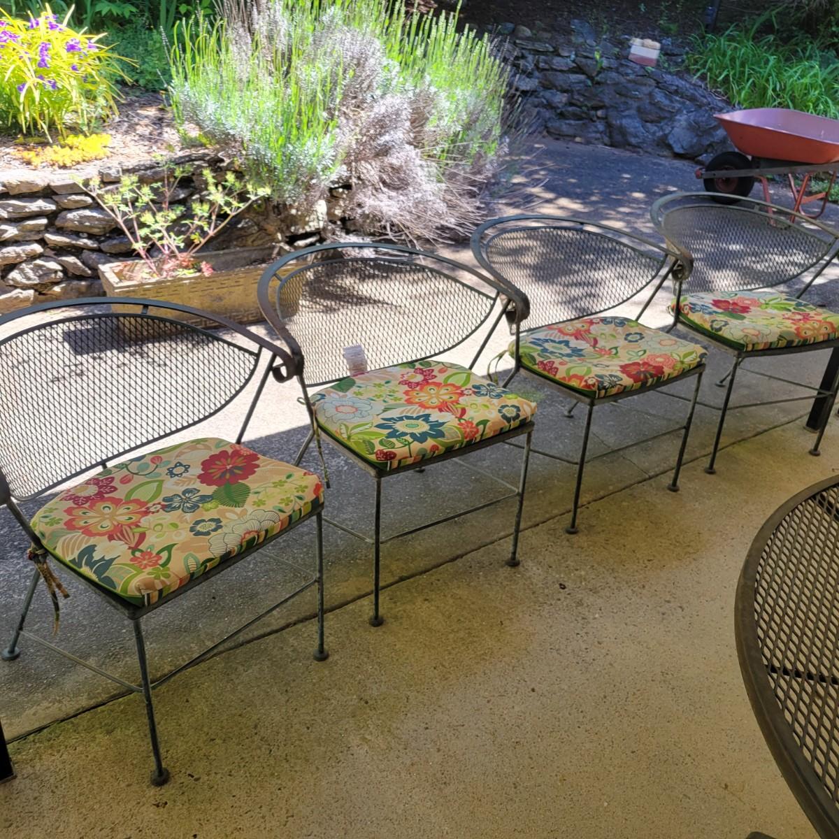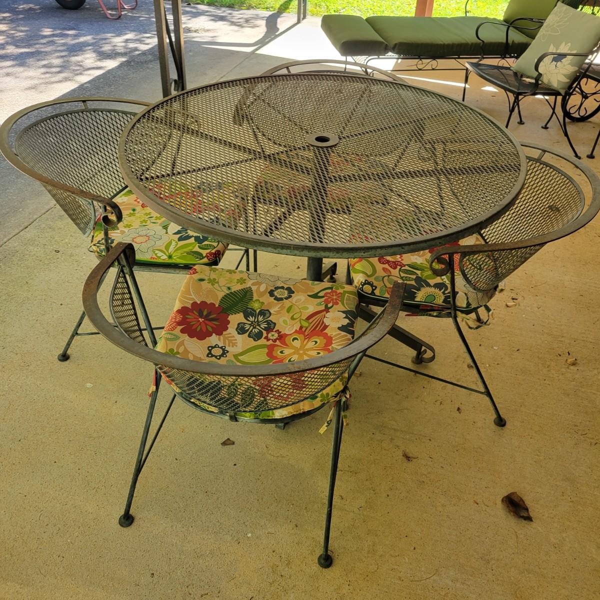 An outdoor patio set that include four chairs that measure approximately 25.5" x 24.5" x 28"H with a seat height of 16.5". These chairs also include double sided outdoor cushions and the chairs do have some rust. The table measures approximately 42"D x 29"H. Local pickup only
