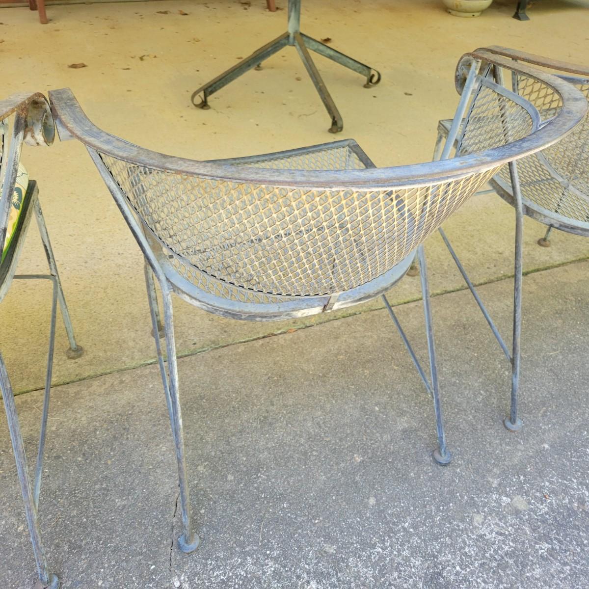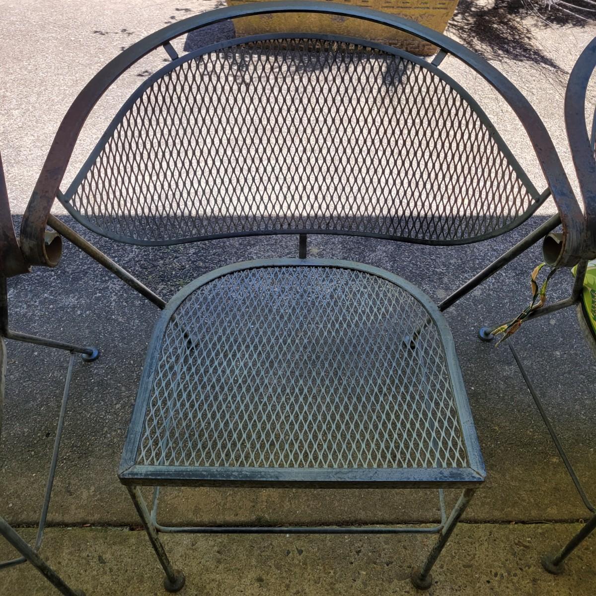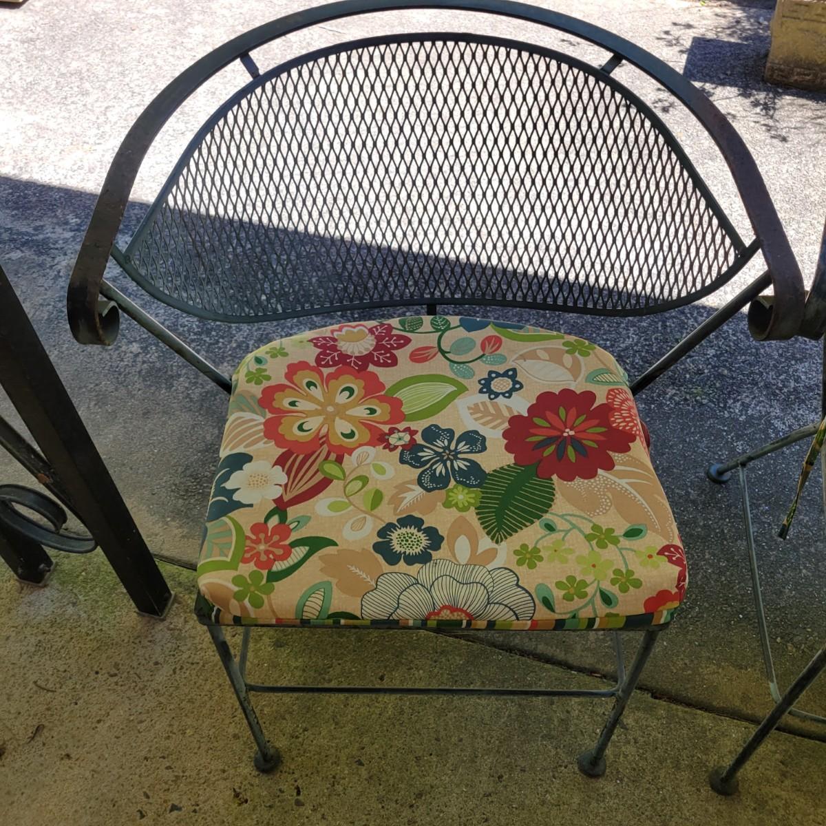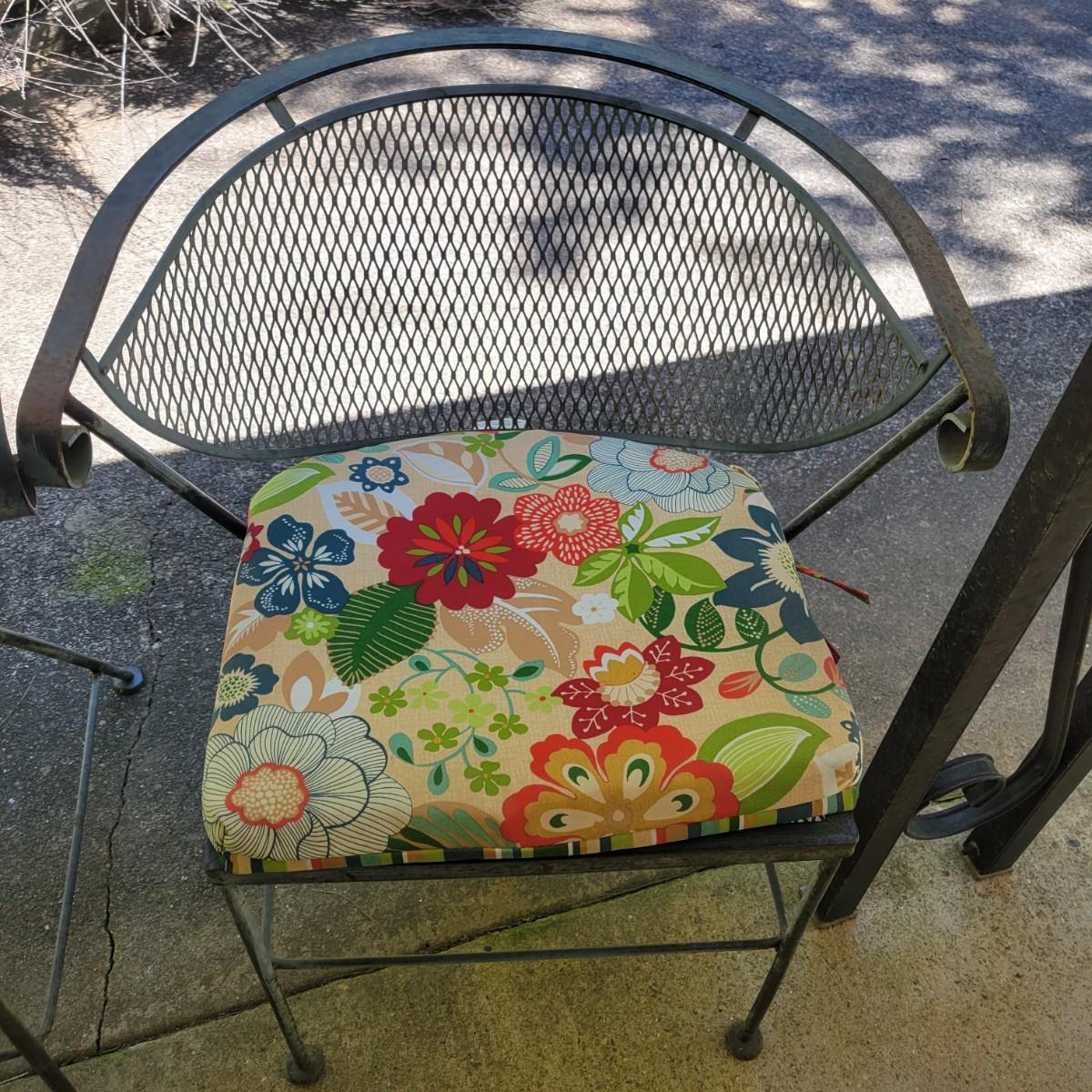 An outdoor patio set that include four chairs that measure approximately 25.5" x 24.5" x 28"H with a seat height of 16.5". These chairs also include double sided outdoor cushions and the chairs do have some rust. The table measures approximately 42"D x 29"H. Local pickup only