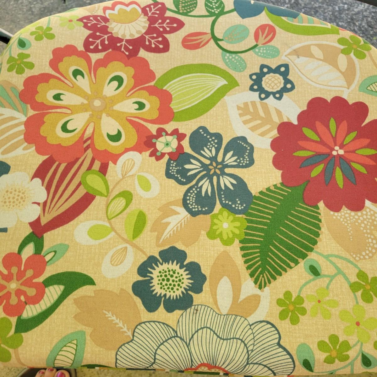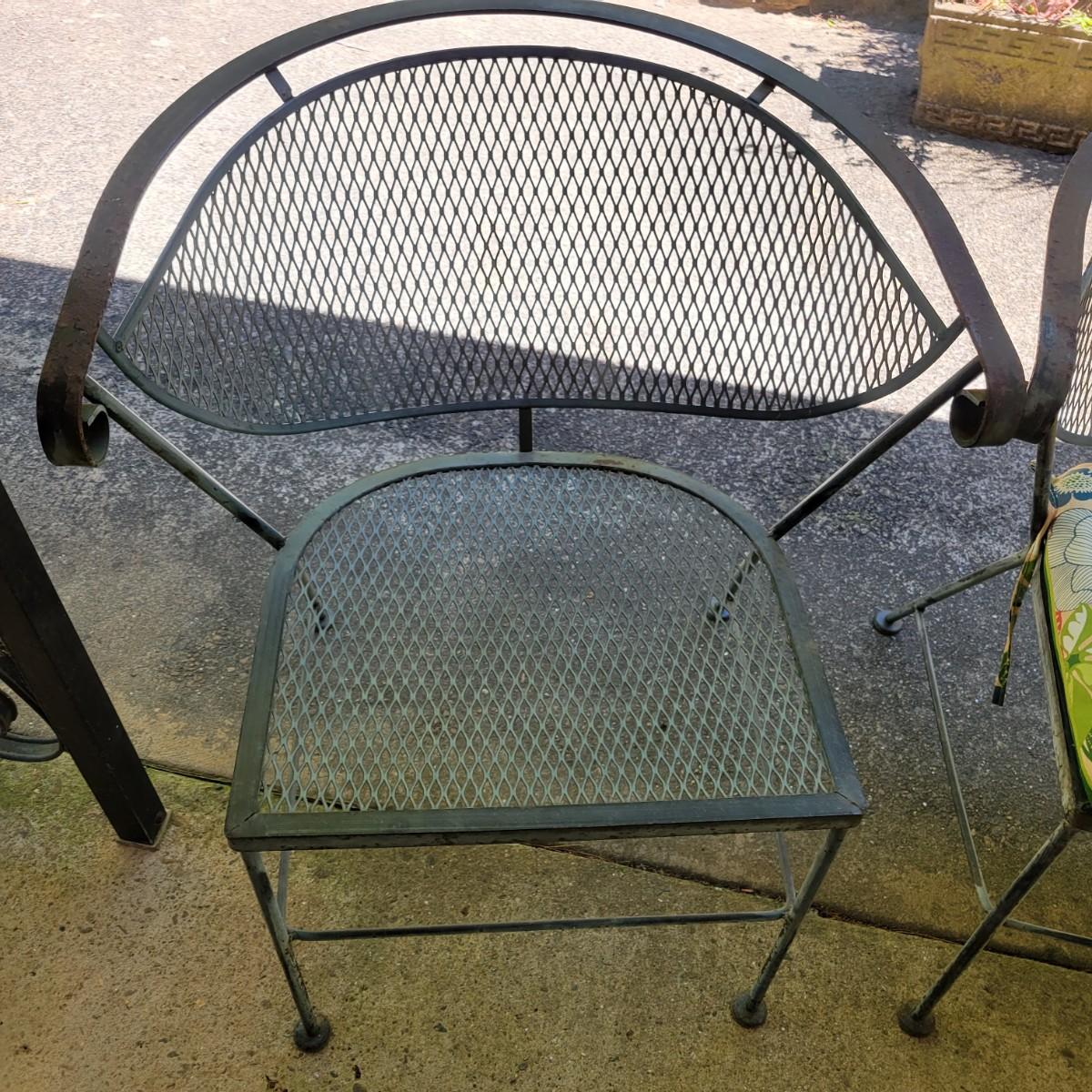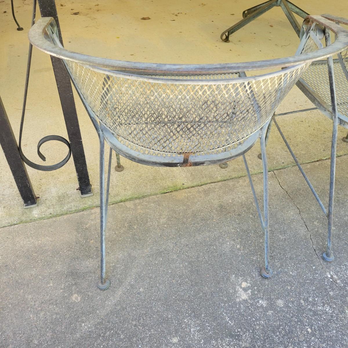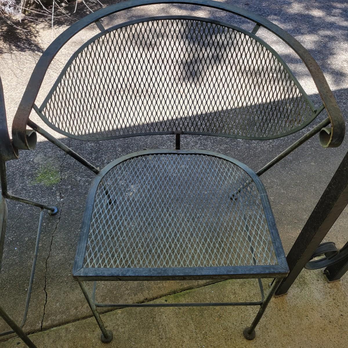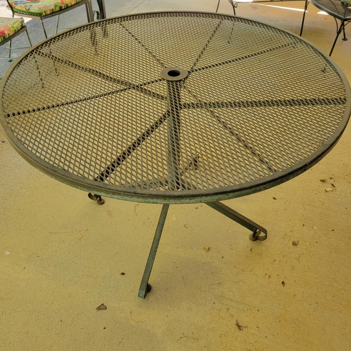 An outdoor patio set that include four chairs that measure approximately 25.5" x 24.5" x 28"H with a seat height of 16.5". These chairs also include double sided outdoor cushions and the chairs do have some rust. The table measures approximately 42"D x 29"H. Local pickup only