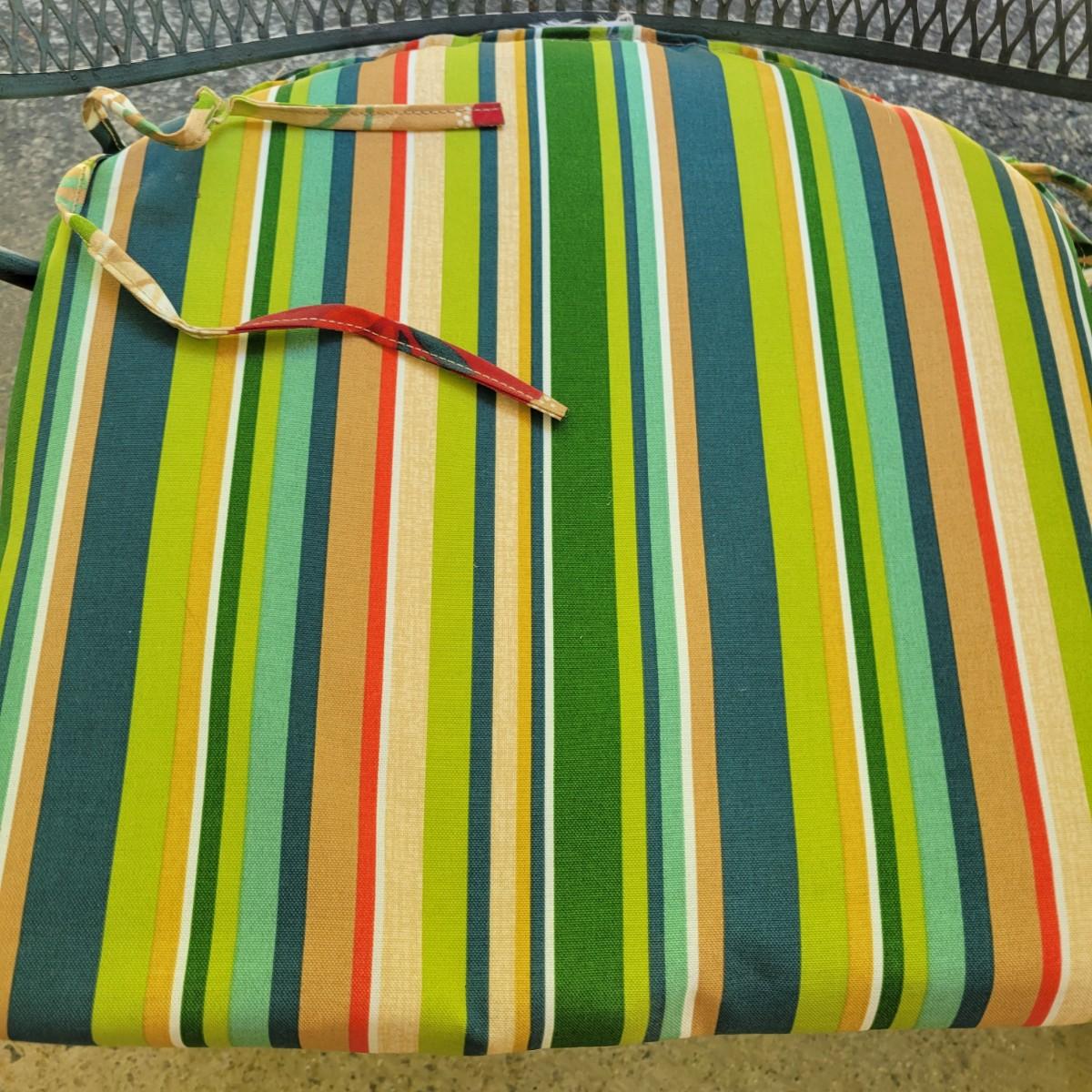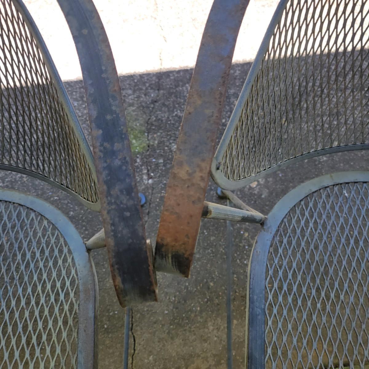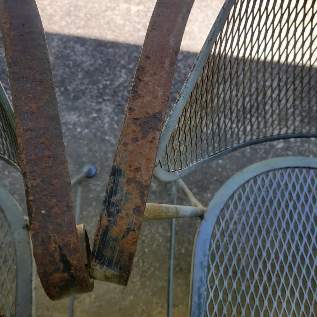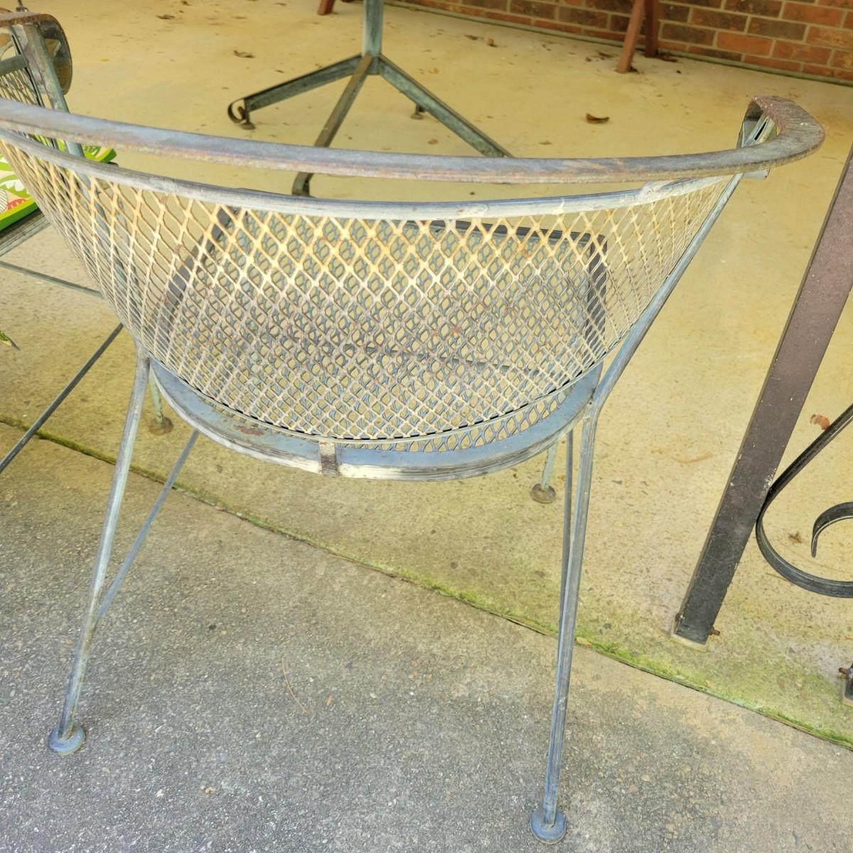 An outdoor patio set that include four chairs that measure approximately 25.5" x 24.5" x 28"H with a seat height of 16.5". These chairs also include double sided outdoor cushions and the chairs do have some rust. The table measures approximately 42"D x 29"H. Local pickup only