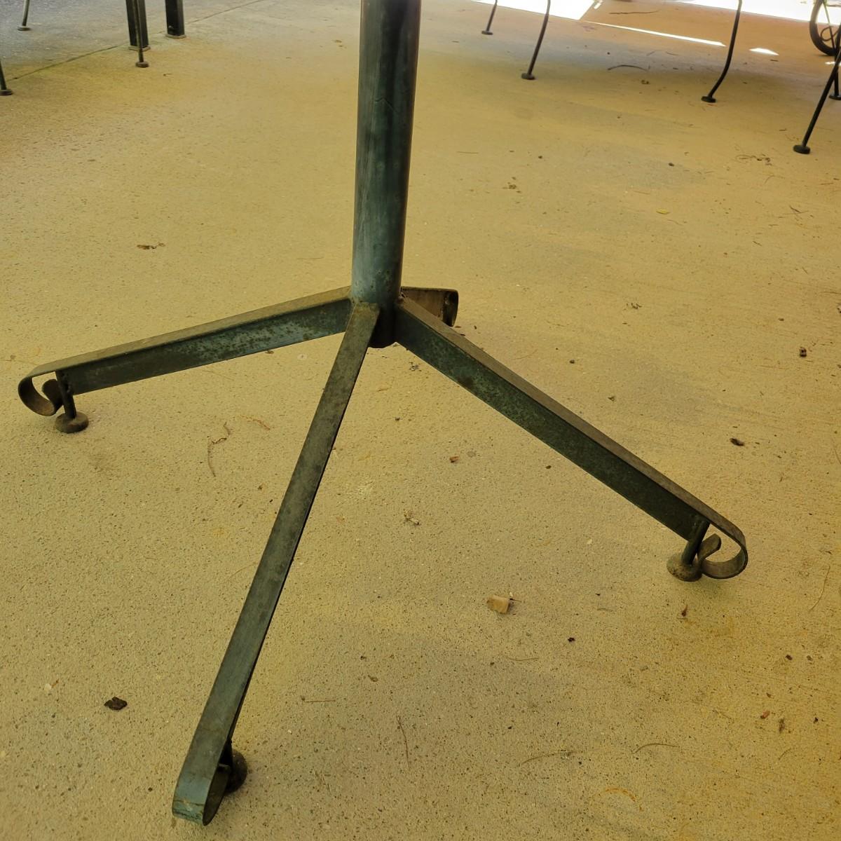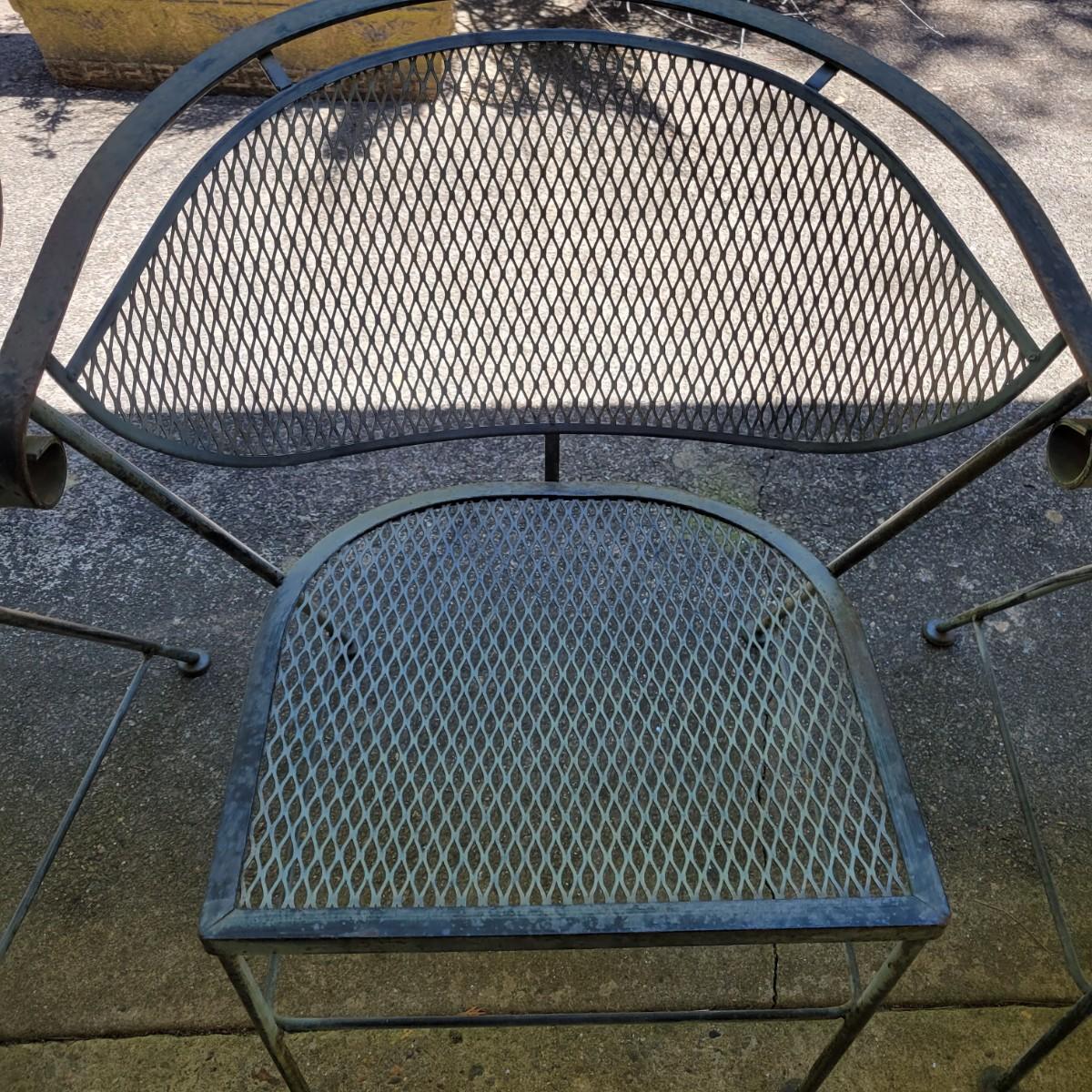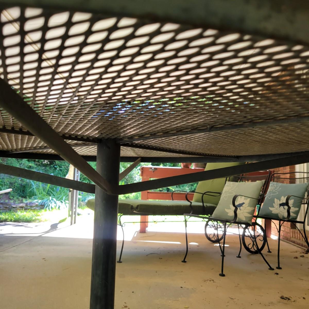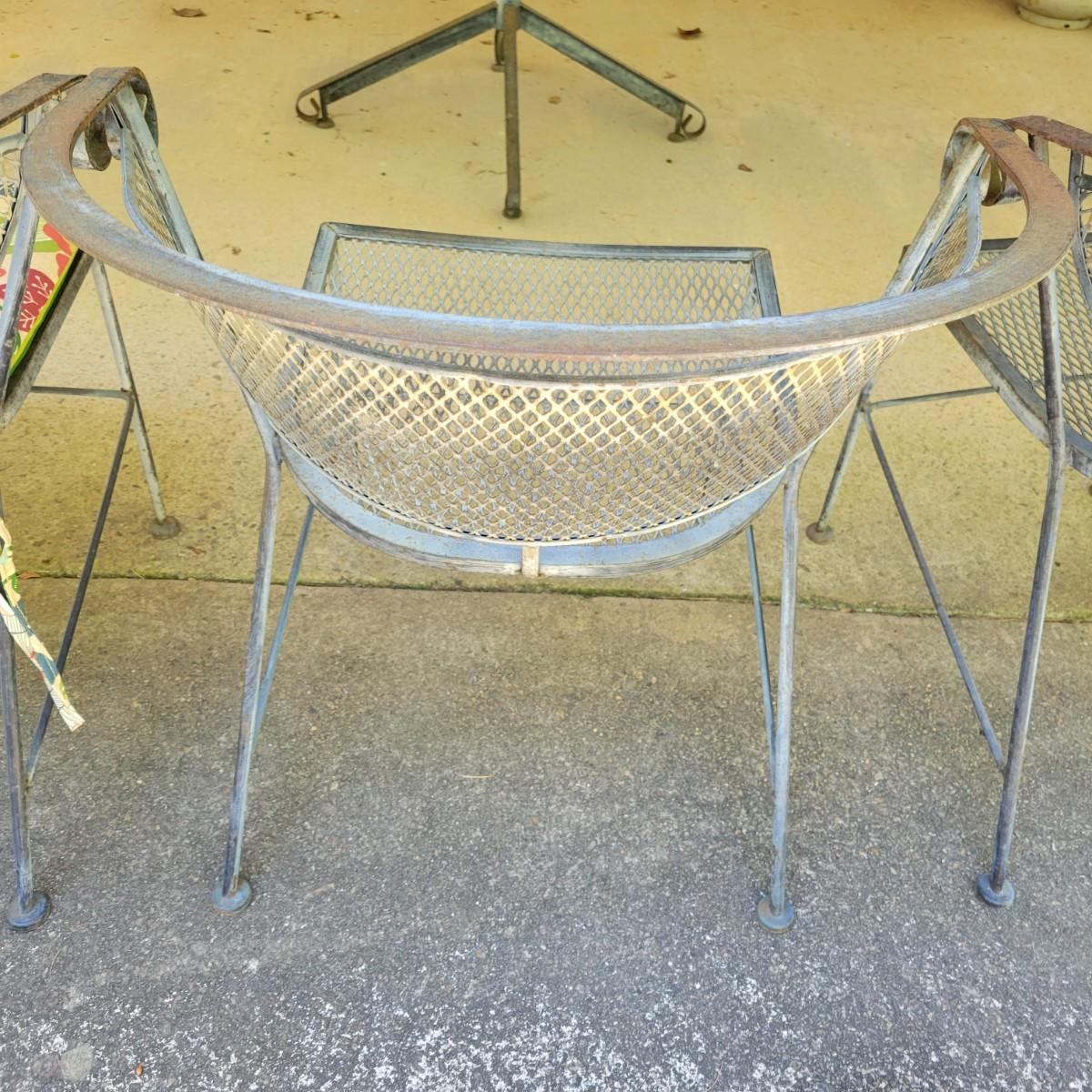 An outdoor patio set that include four chairs that measure approximately 25.5" x 24.5" x 28"H with a seat height of 16.5". These chairs also include double sided outdoor cushions and the chairs do have some rust. The table measures approximately 42"D x 29"H. Local pickup only