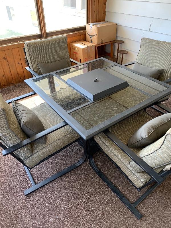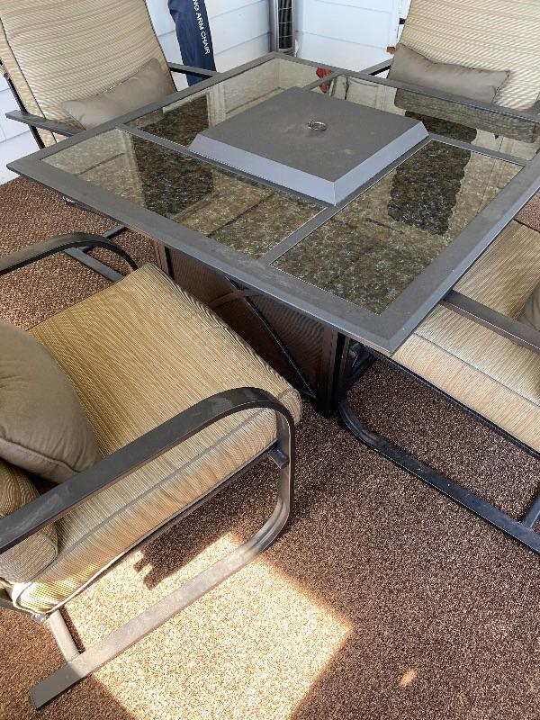Table and 4 chairs with center gas fireplace. Chairs are super comfortable. Set is very clean and like new