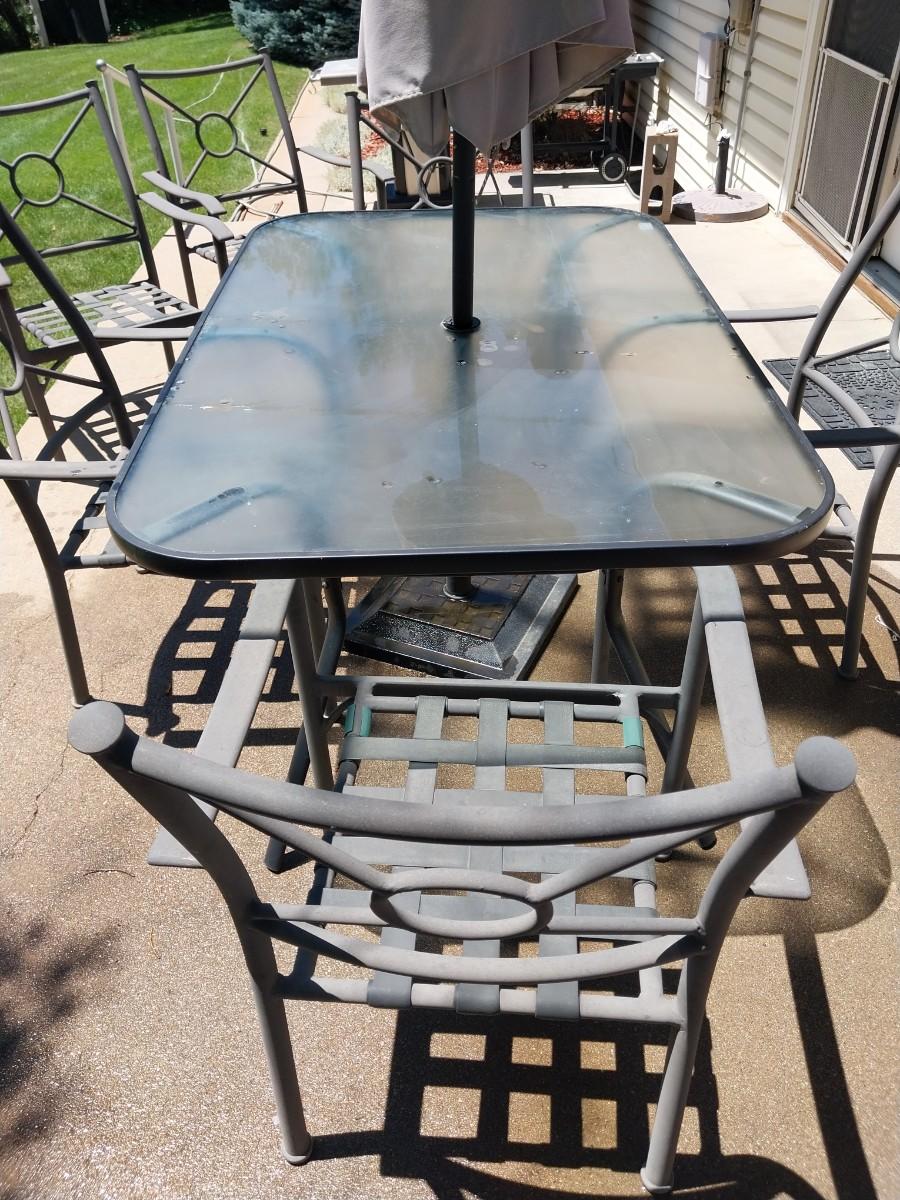 PATIO TABLE , SIX CHAIRS AND UMBRELLA WITH BASE