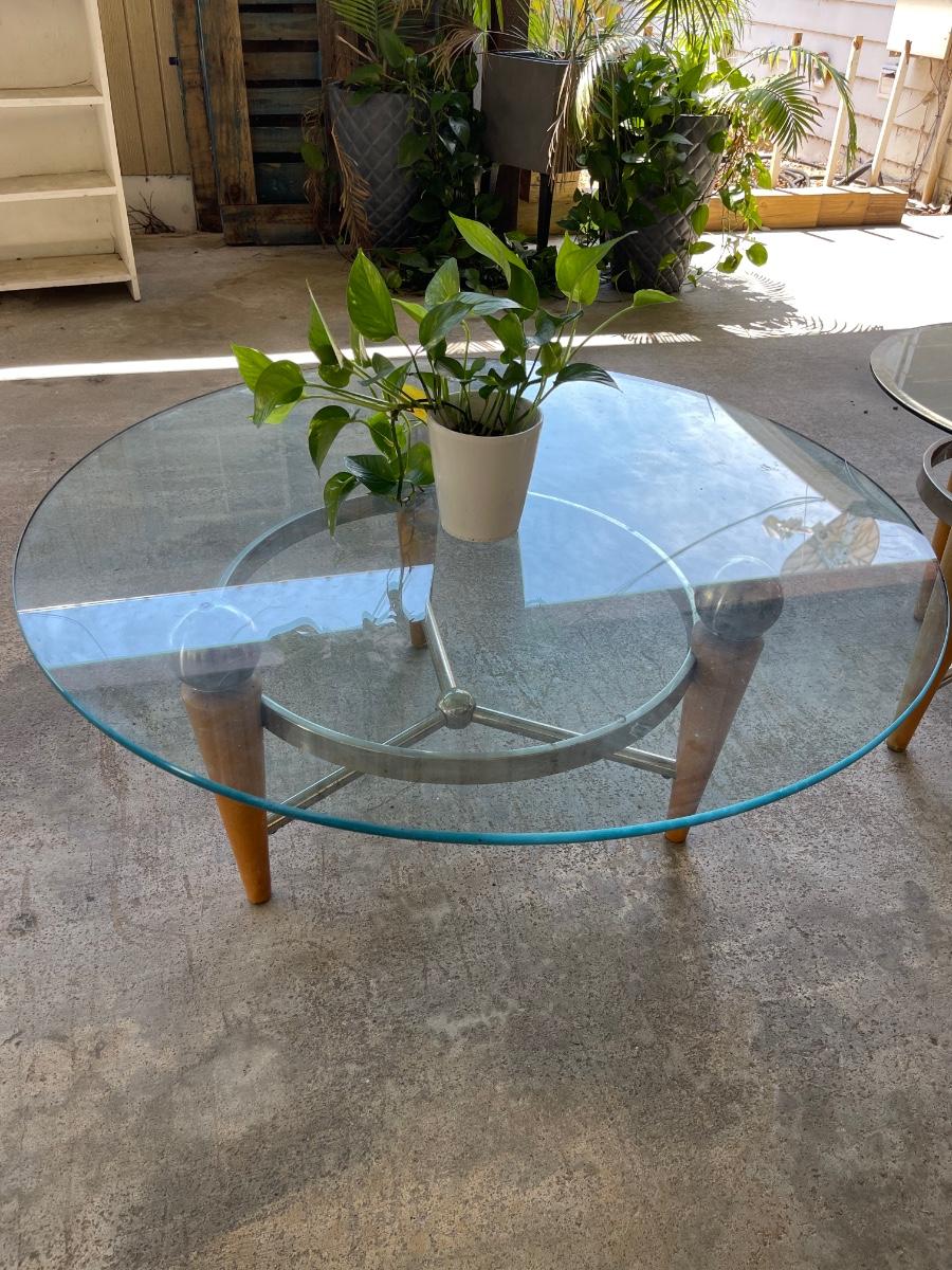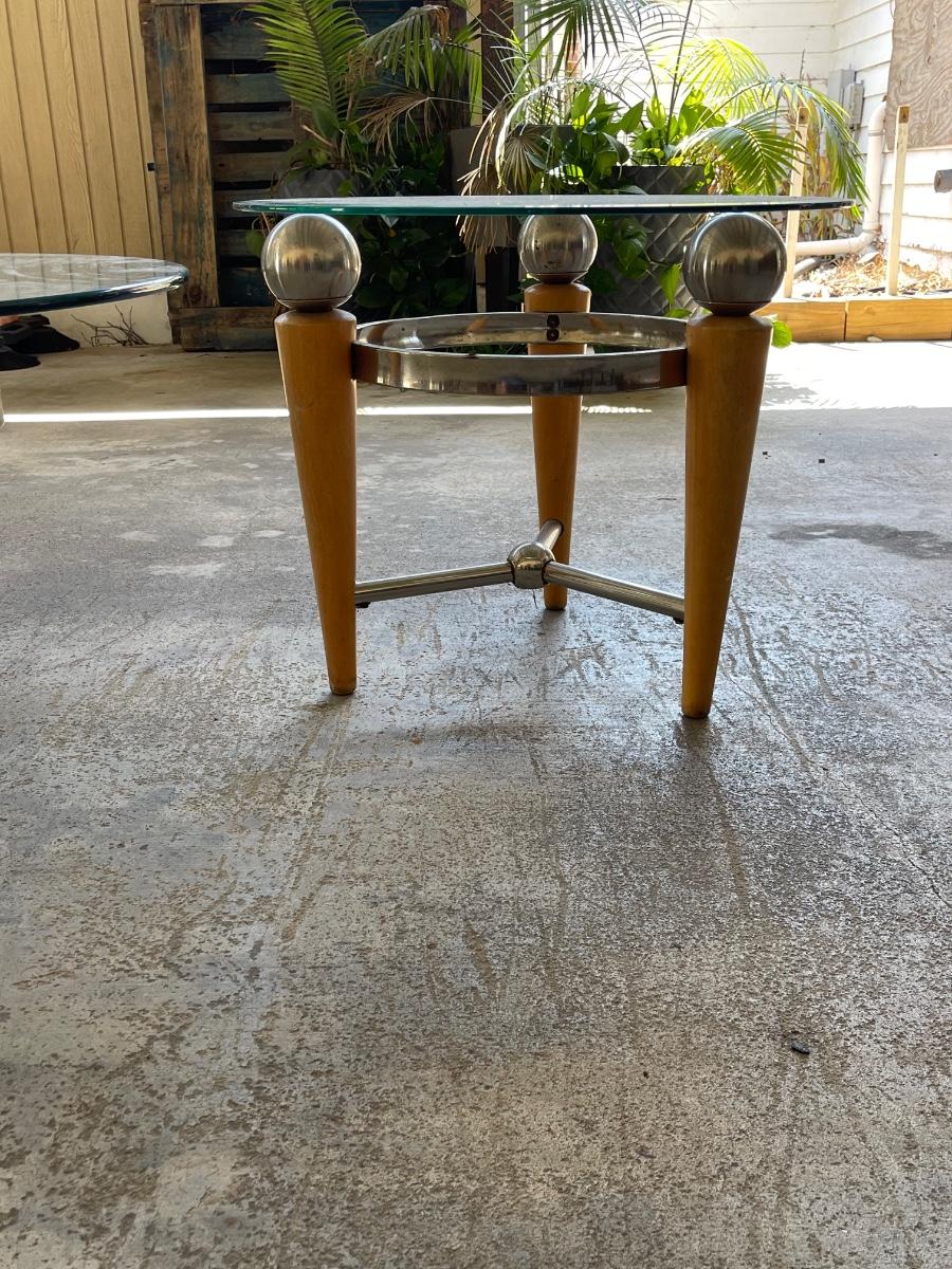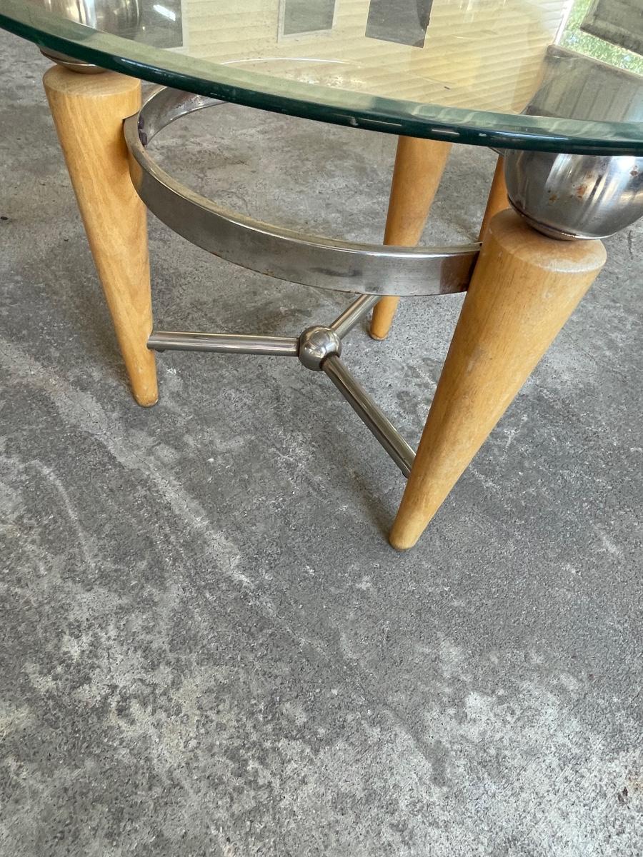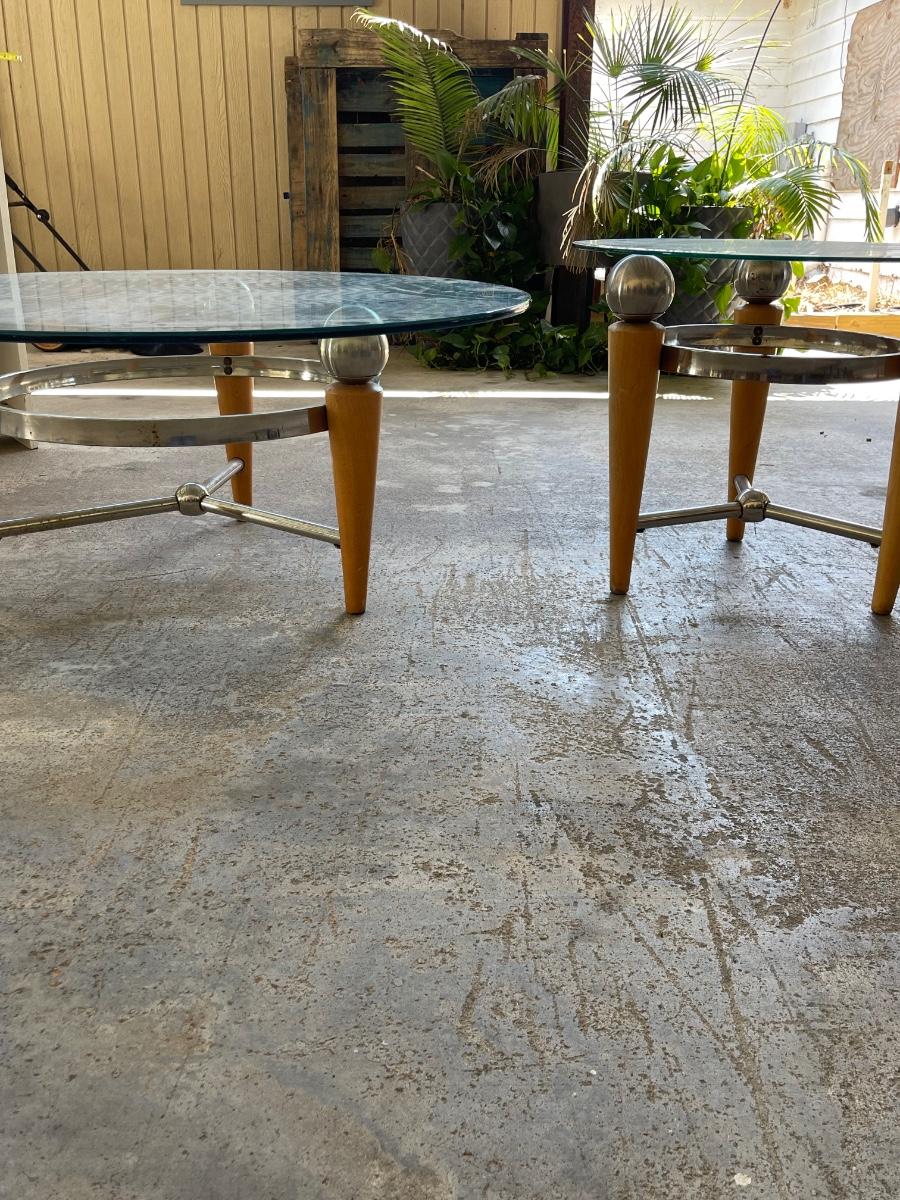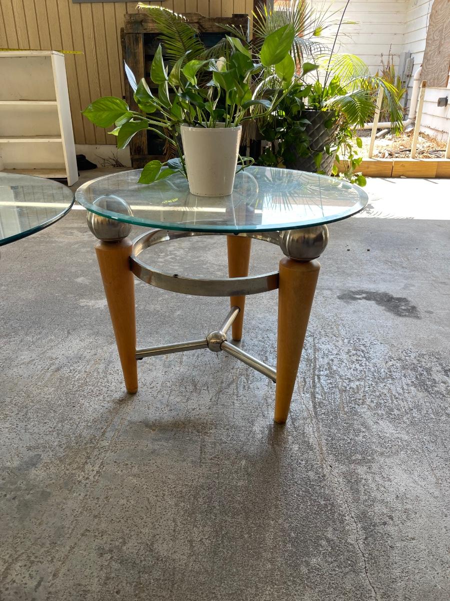 Cute set of indoor/outdoor tables in used condition. The large piece of glass alone would cost you more than the starting bid for these two cute glass top tables. I would use on patio. There are some spots of rust on small metal base. The 2 glass tops are in amazing condition. The glass on small one is beveled. The larger glass is super thick and in great shape! Probably 80s maybe early 90s tables. The rubber pads the glass rests on are missing on both tables which is a super easy fix. Wood and metal would be easy to paint and seal to match your outdoor or indoor decor. Great tables!! Great glass!!